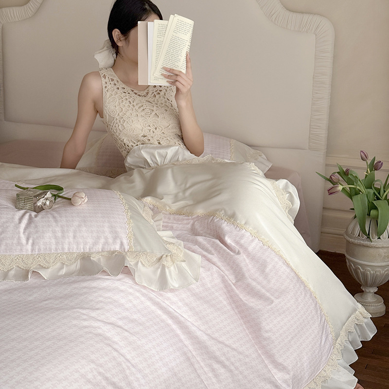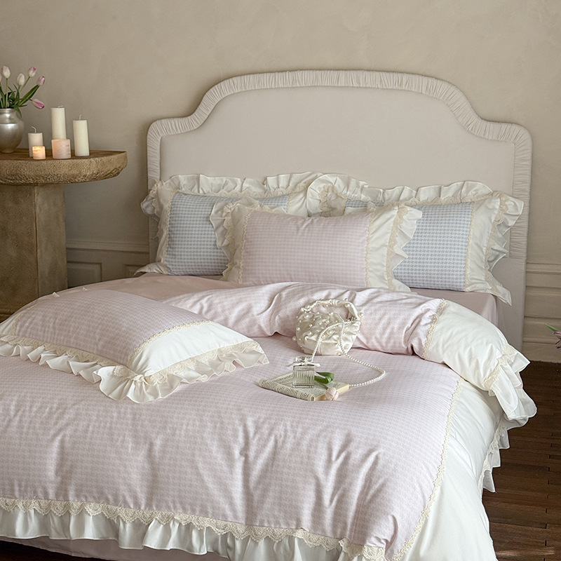 프랑스 공주 스타일 긴 스테이플 코튼 침대 시트 4 피스 세트 코튼 고급 Houndstooth 퀼트 커버 침구 파우더 블루스토어 가기
