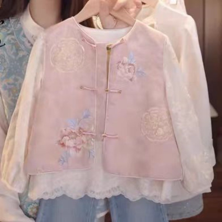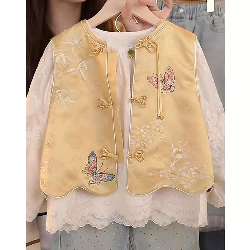 소녀 Guofeng 조끼 봄과 가을 2025 새로운 어린이 새로운 중국 당나라 원피스 자카드 버클 조끼스토어 가기