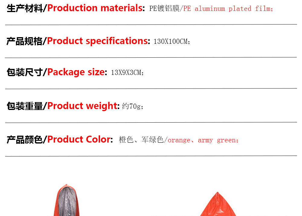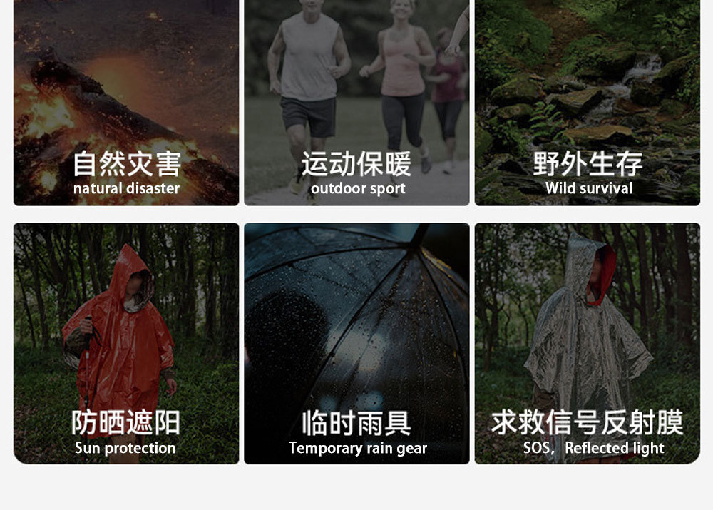 고객 맞춤형 알루미늄 필름 단열 야외용 일회용 PE 오렌지색 구급 우비 탐험용 우비 두꺼운 생존 담요 도매