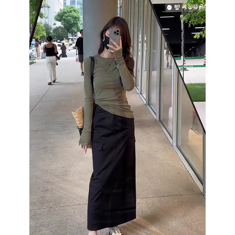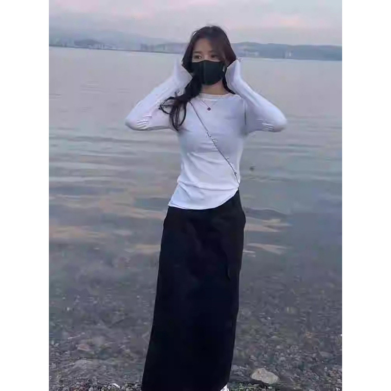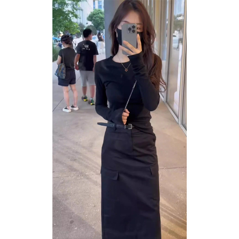크루 넥 솔리드 컬러 긴 소매 티셔츠 2025 초가을 새로운 스파이스 걸스 타이트 슬리밍 틈새 디자인 탑스토어 가기