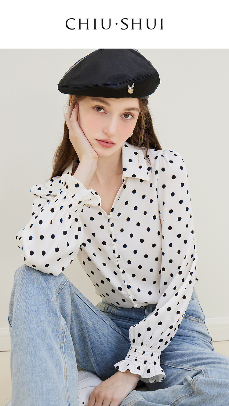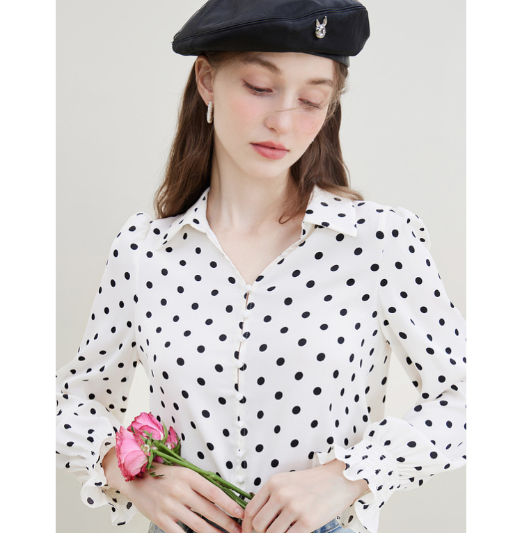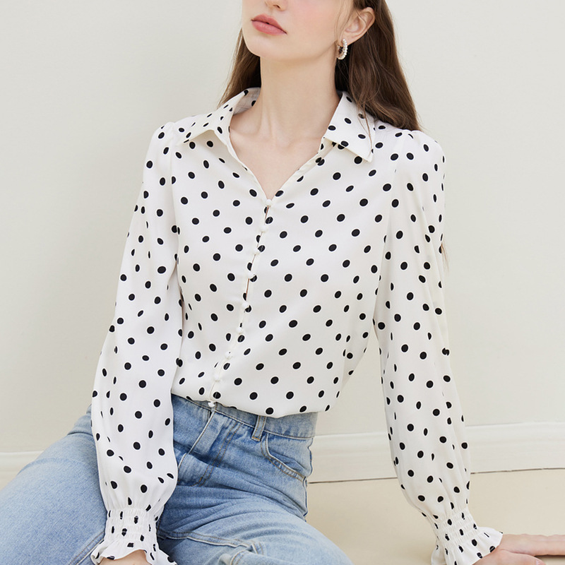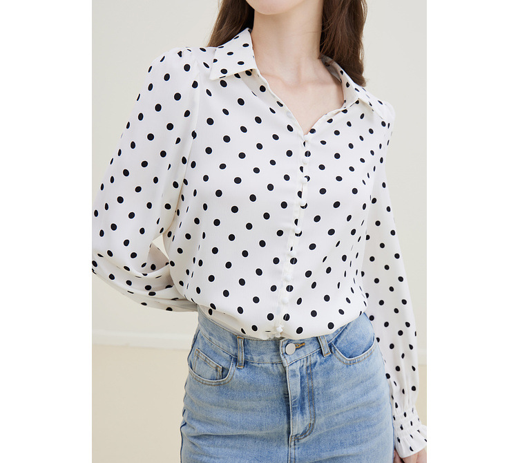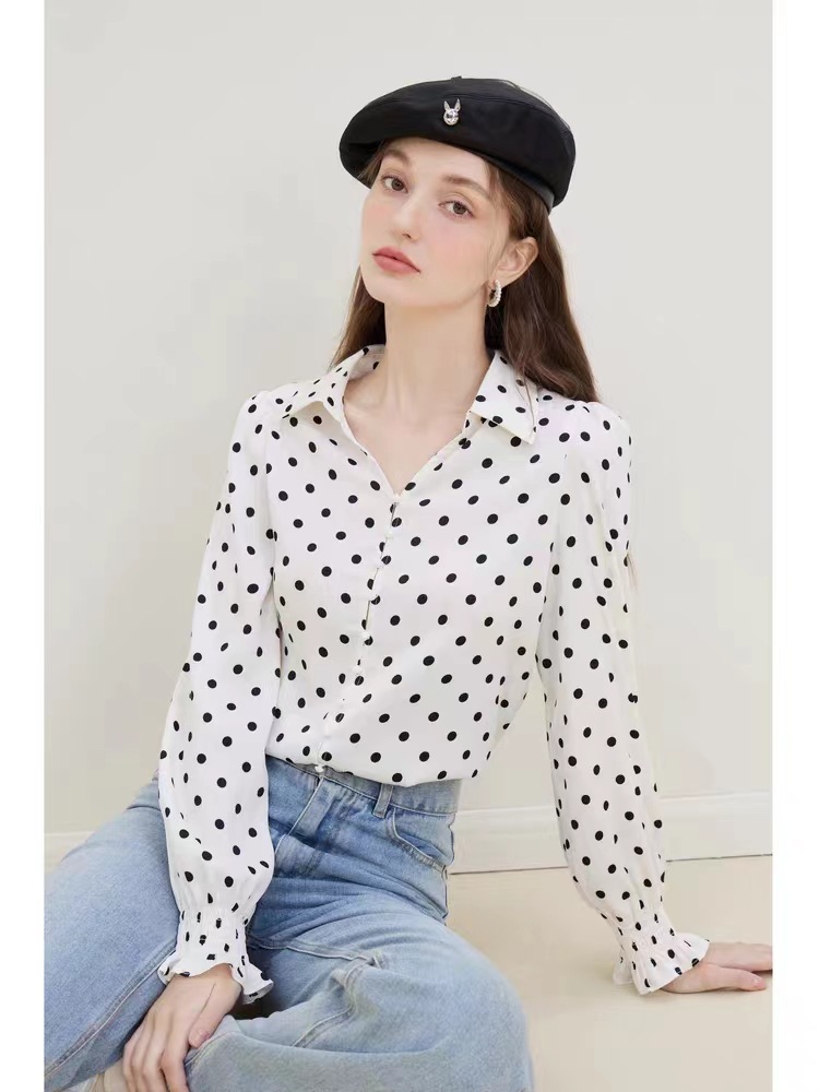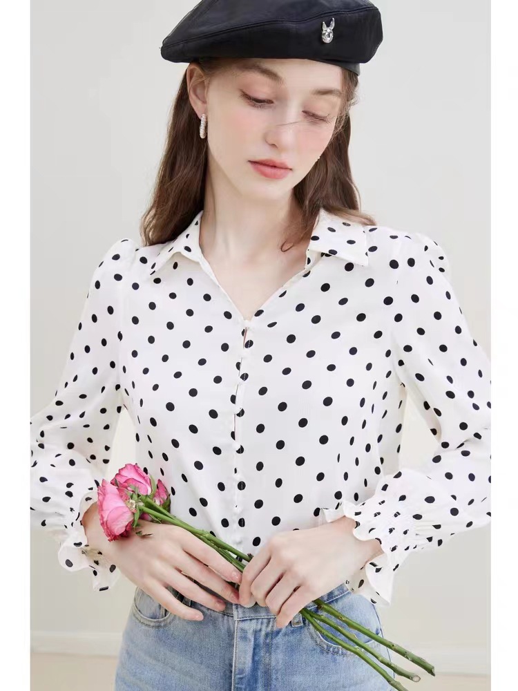 하이 엔드 V 넥 클래식 블랙과 화이트 폴라 닷 긴팔 셔츠 여자 2024 가을 새 여자 간단한 올매치 베이스 셔츠스토어 가기