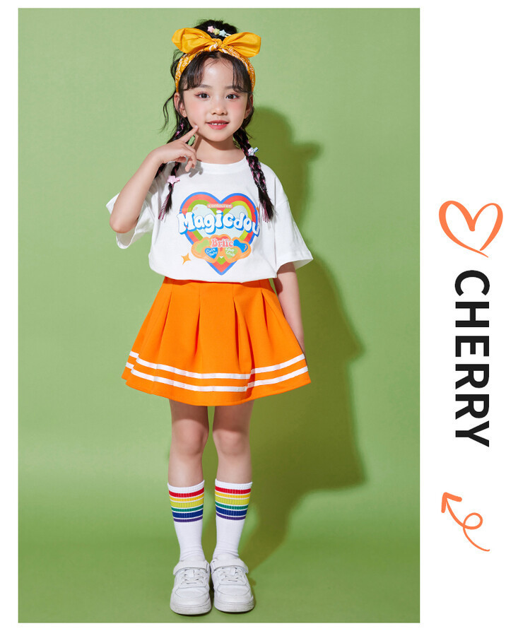 • 화이트 러브 반팔 + 오렌지색 드로스트링 스커트 + 레인보우 양말