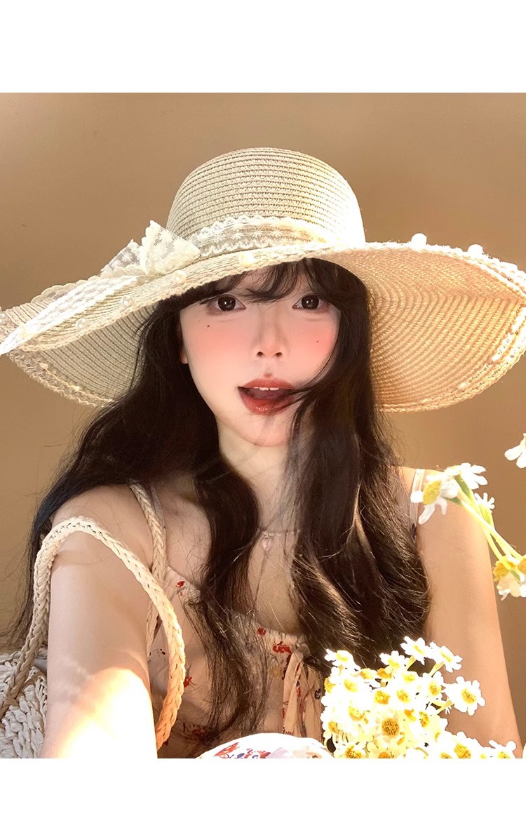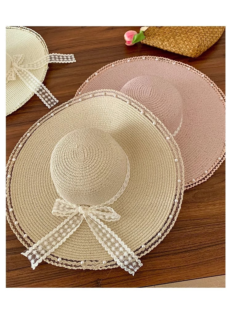 프랑스 스타일 진주 레이스 밀짚 모자 여성의 여름 큰 브림 해변 휴일 활 태양 모자 선 스크린 모자