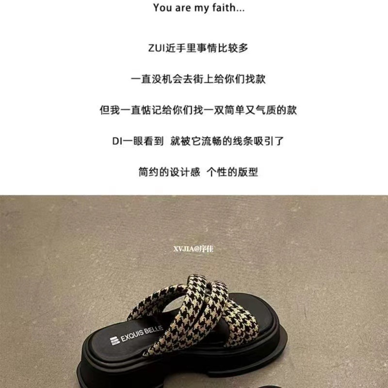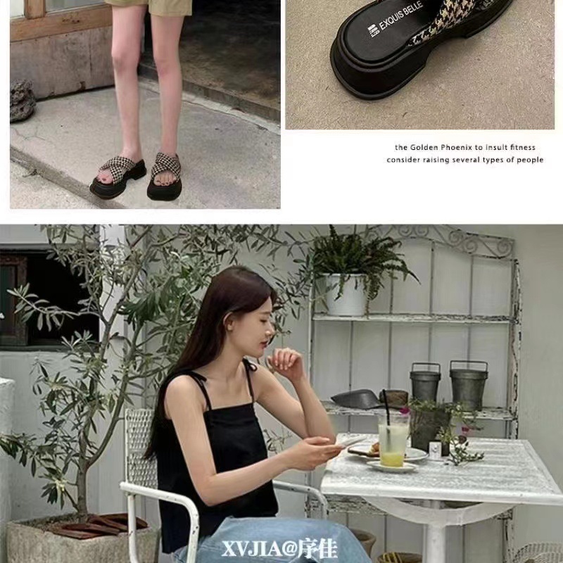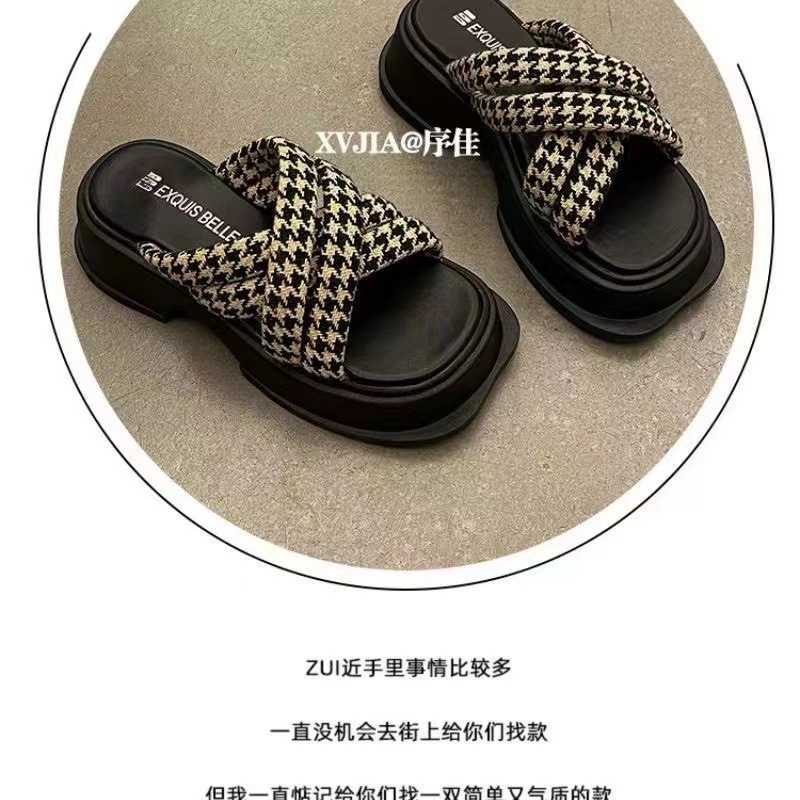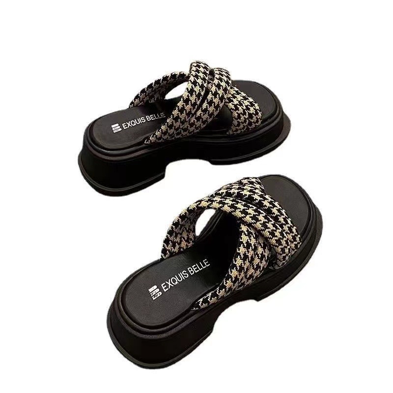 재고 빠른 머리 2024 여름 새로운 Houndstooth 샤넬 스타일 슬리퍼 여성 의상 두꺼운 바닥 오픈 발가락 쿨스토어 가기