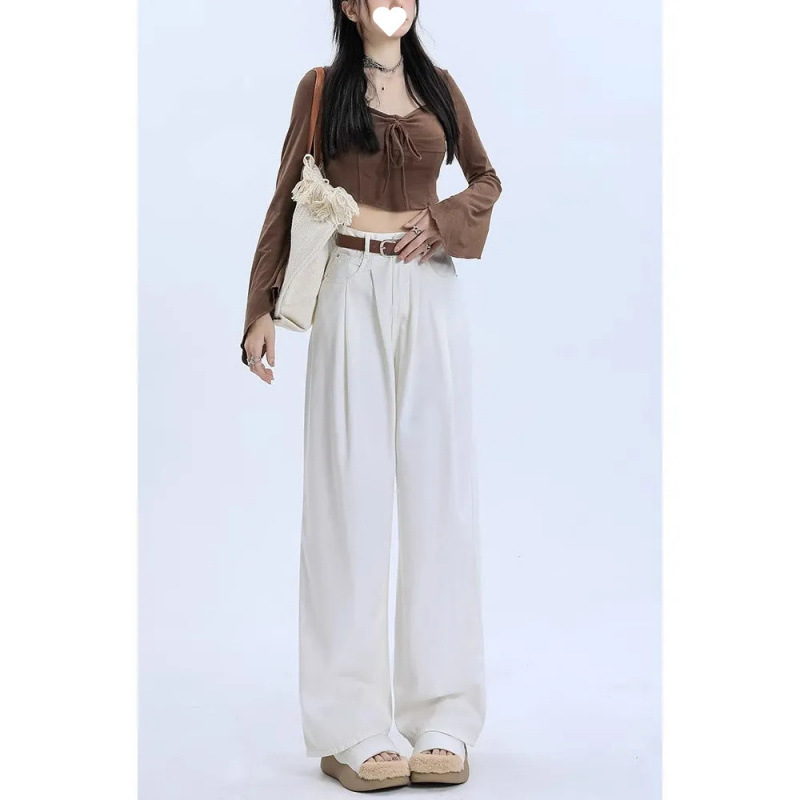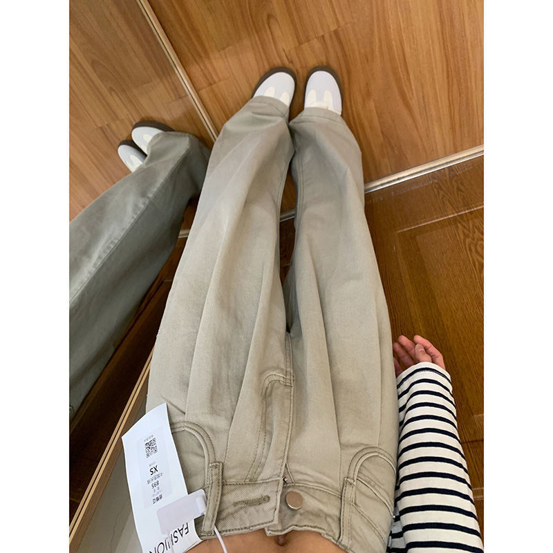 카키 느슨한 직선 다리 청바지 여성의 봄과 여름 새로운 높은 허리 슬리밍 주름 디자인 느낌 넓은 다리 바지스토어 가기