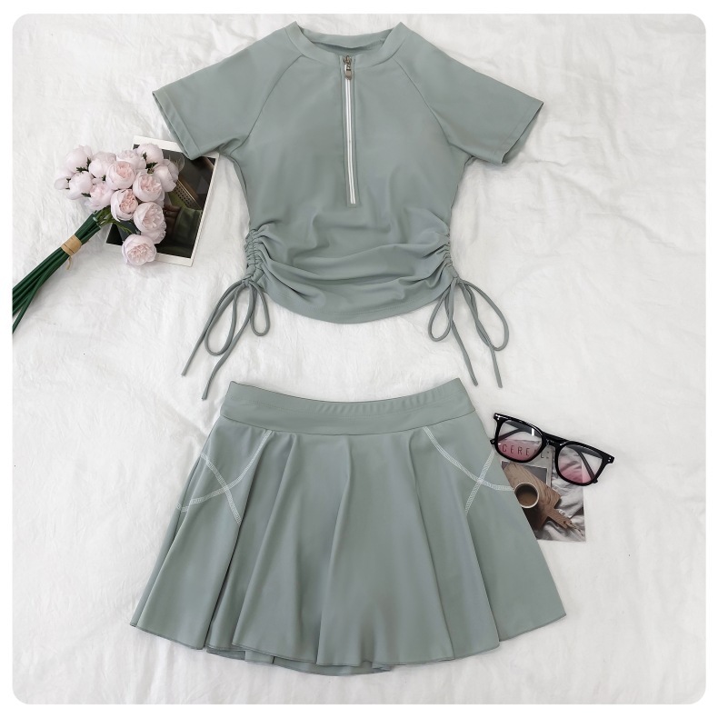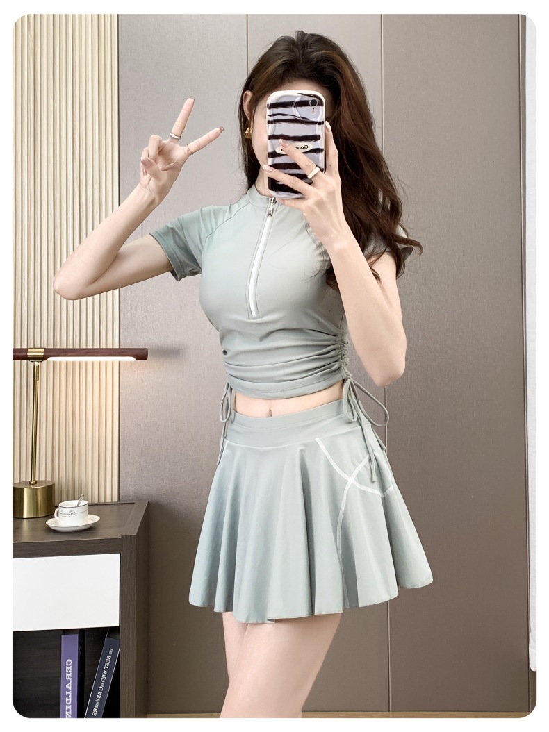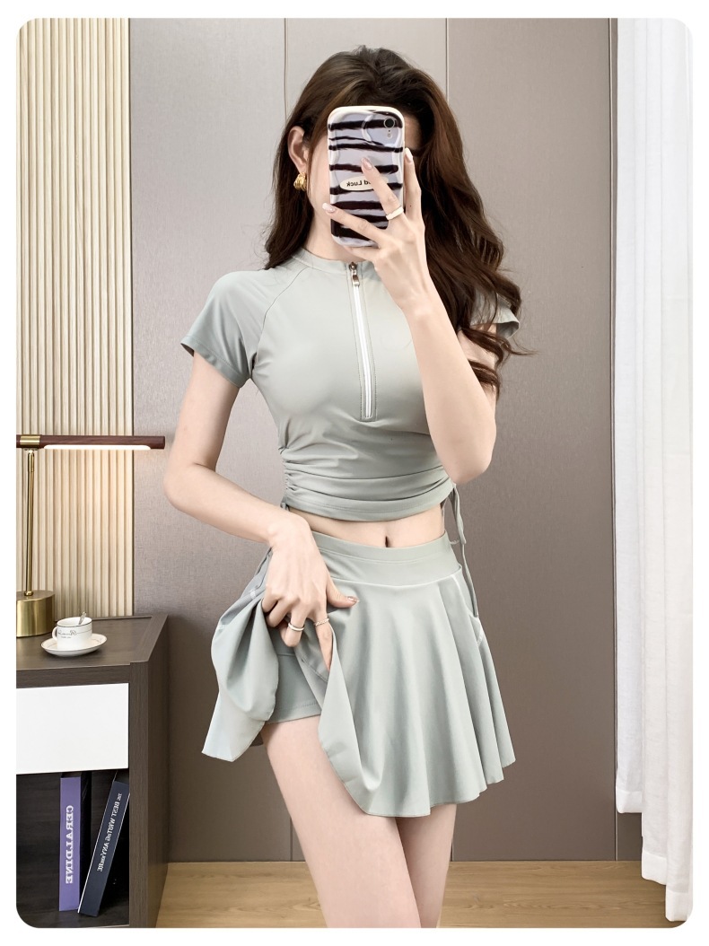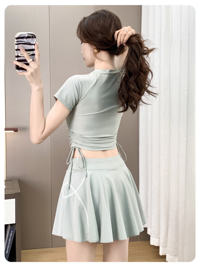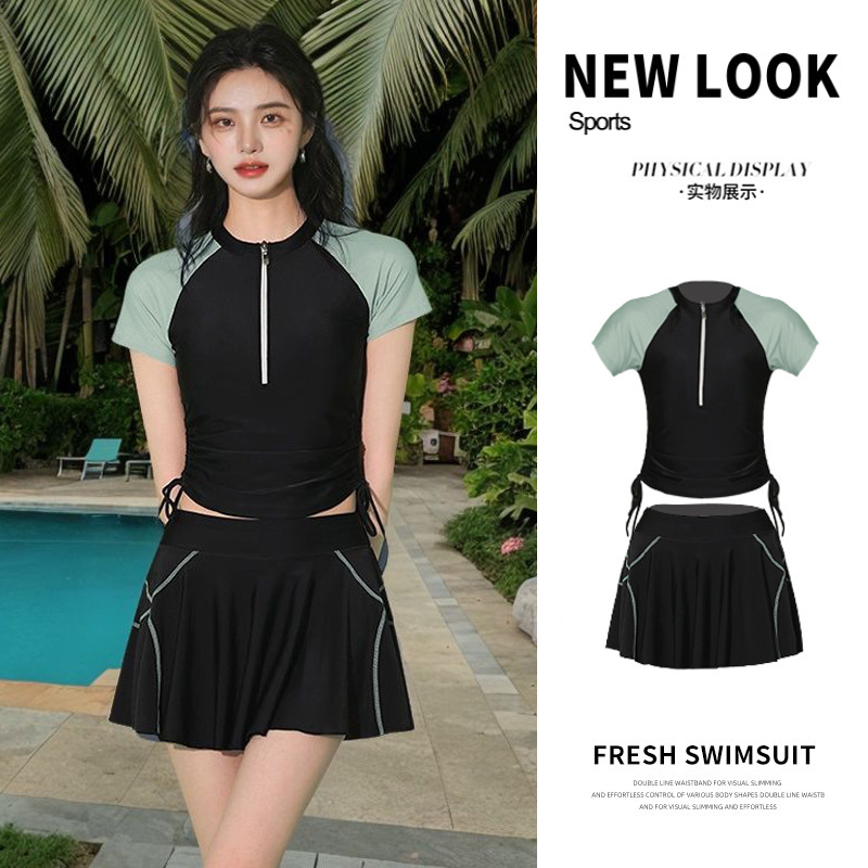 스플릿 스포츠 수영복 여성 2025 복서 스커트 투피스 티셔츠 소녀 학생 자외선 차단제 수영 세트 도매스토어 가기