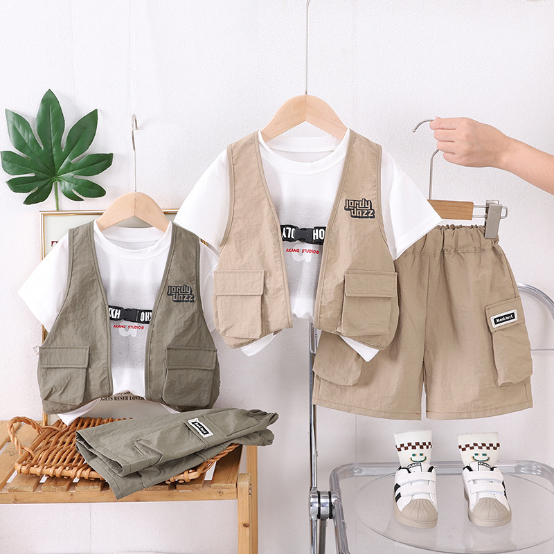 소년 여름 세트 새로운 패션 아기 여름 어린이 얇은 3 차원 더블 포켓 조끼 짧은 소매 3 조각