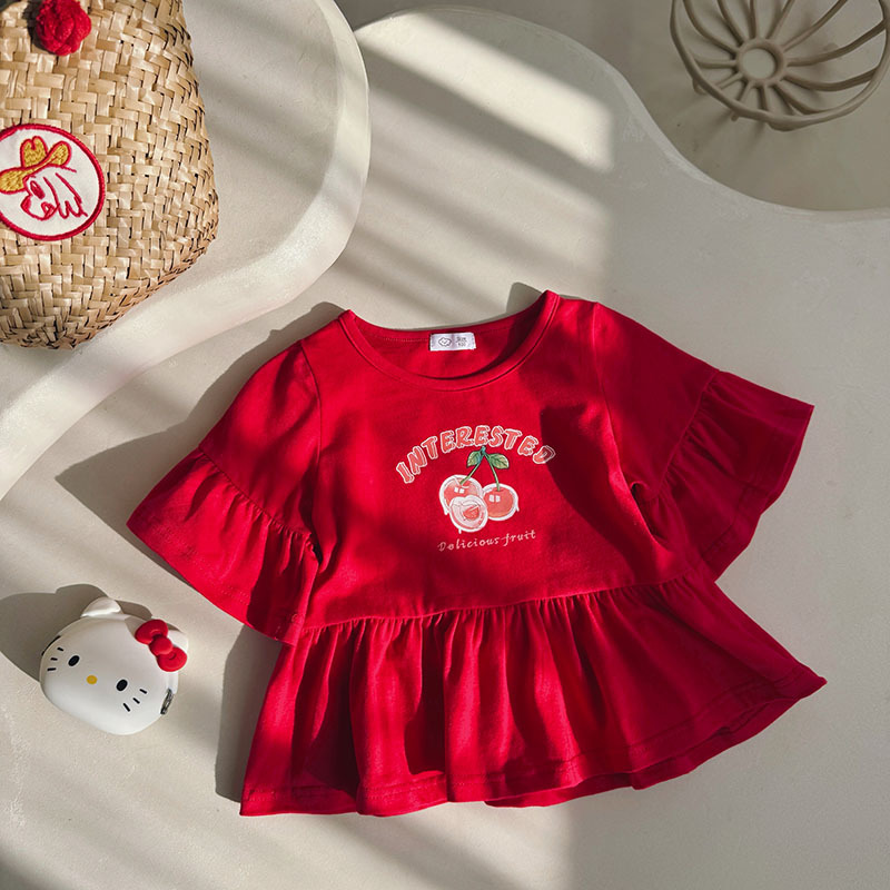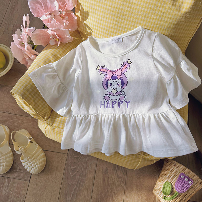 2025 한국 스타일 여름 새로운 소녀 인형 셔츠 중간 소매 뿔 소매 만화 짧은 소매 아기 외국인 스타일 공주 티셔츠스토어 가기
