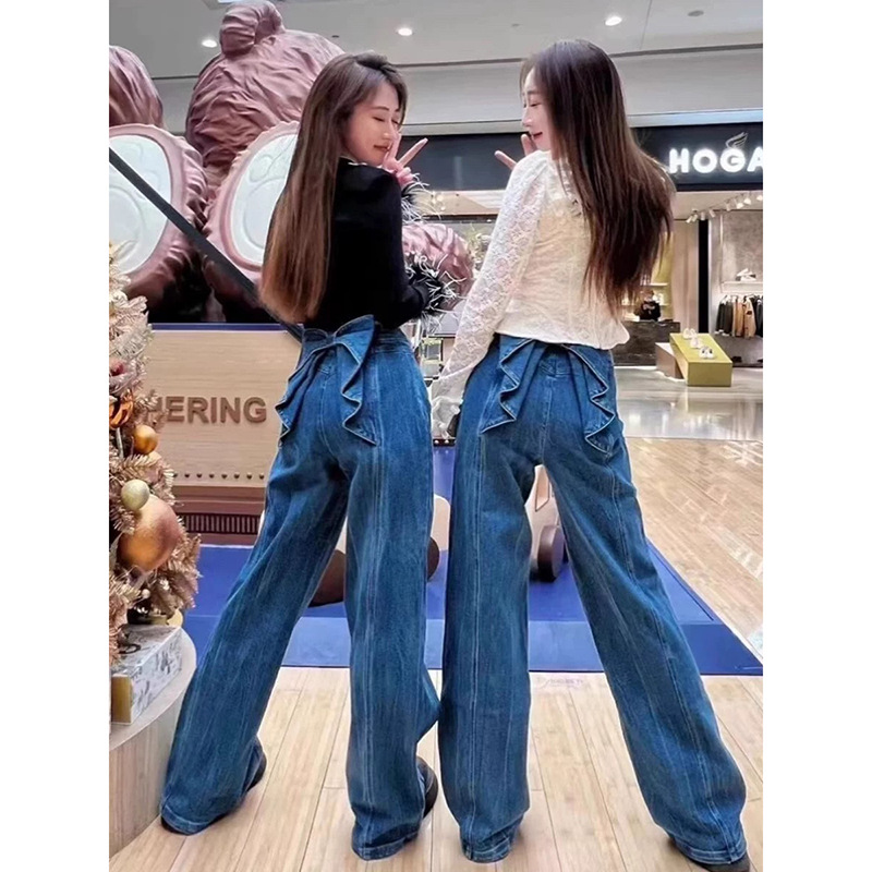 아메리칸 스타일 레트로 보우 청바지 여성 2025 봄과 가을 새로운 한국 스타일 높은 허리 느슨한 슬리밍 스트레이트 팬츠