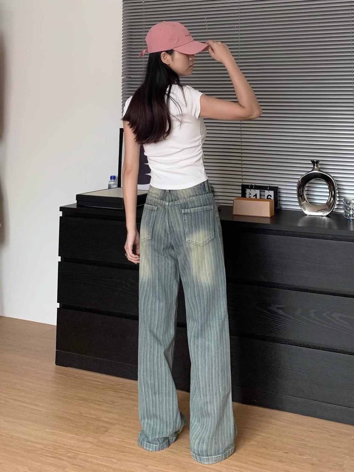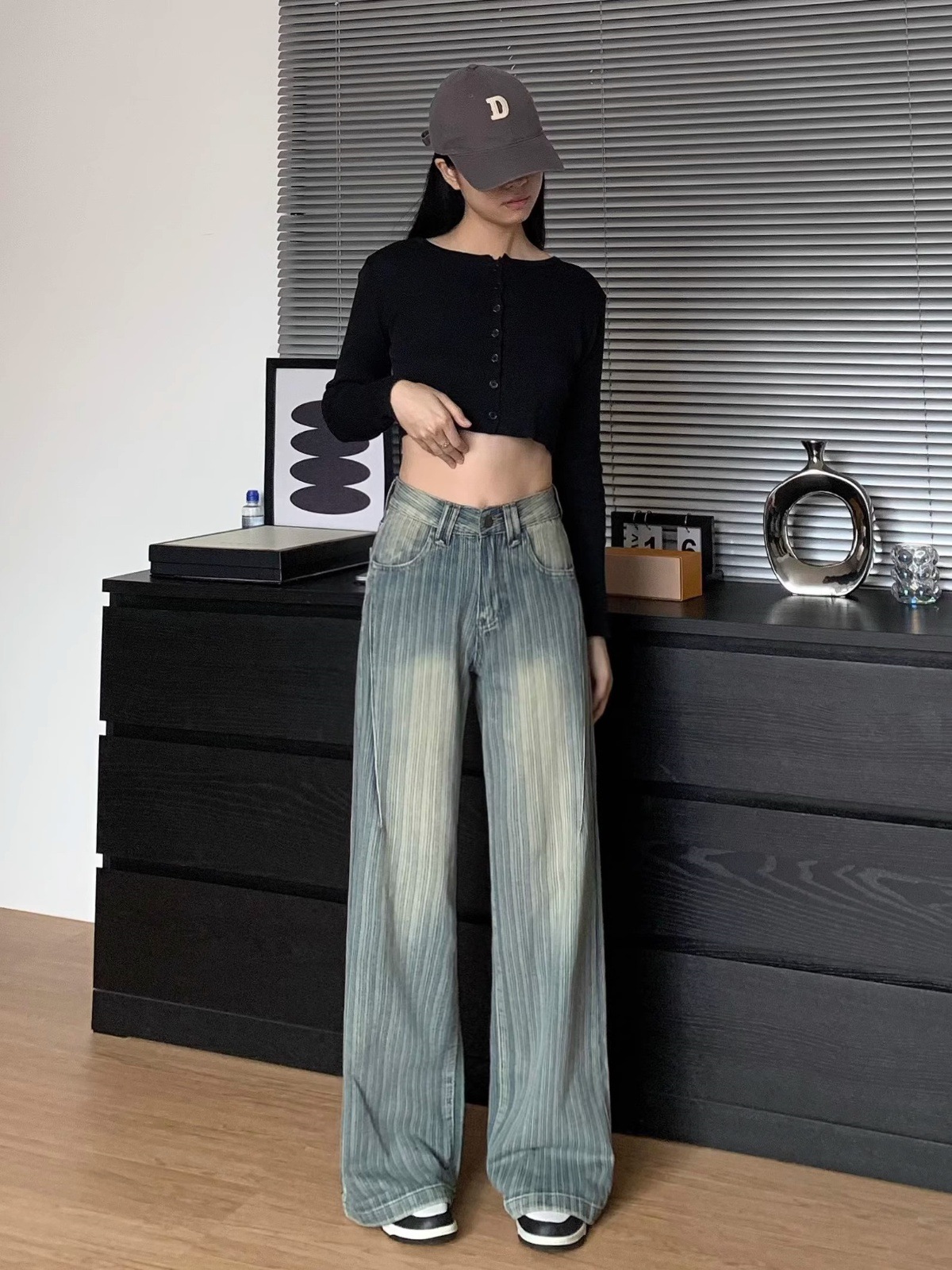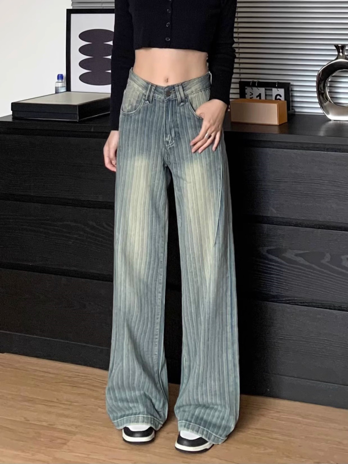 빈티지 하이 허리 스트레이트 청바지 여성용 2025 년 여름 새로운 느슨한 줄무늬 디자인 올매치 좁은 넓은 다리 바지스토어 가기