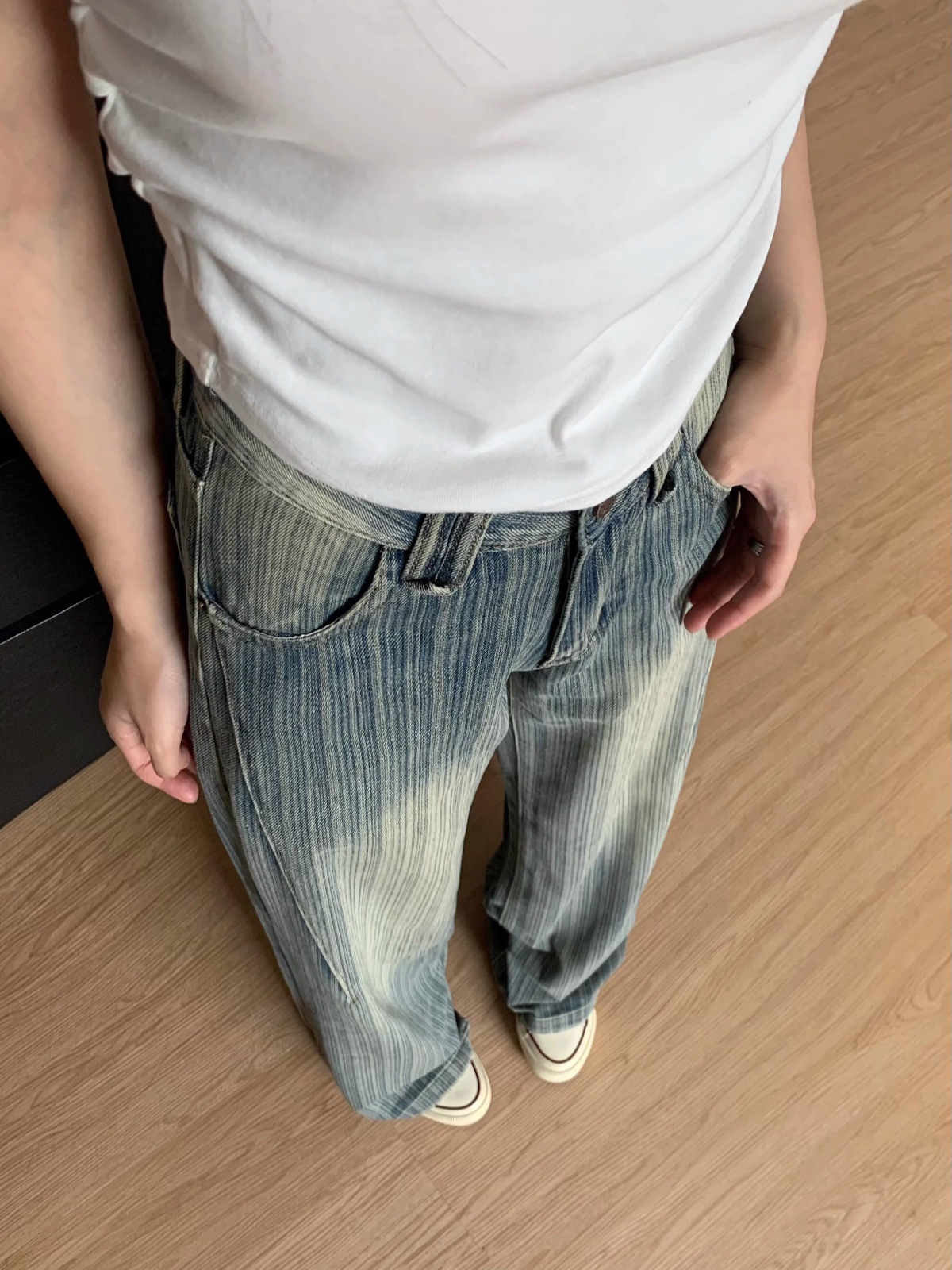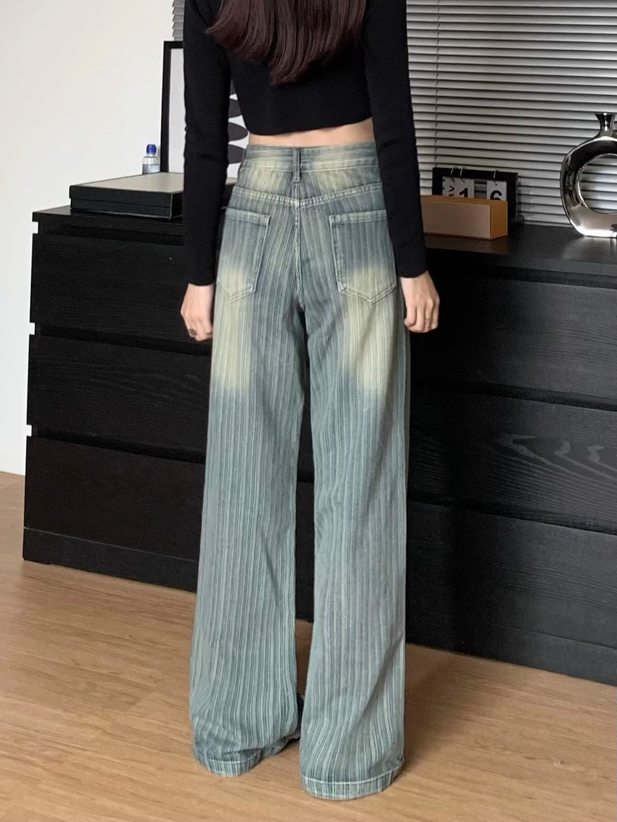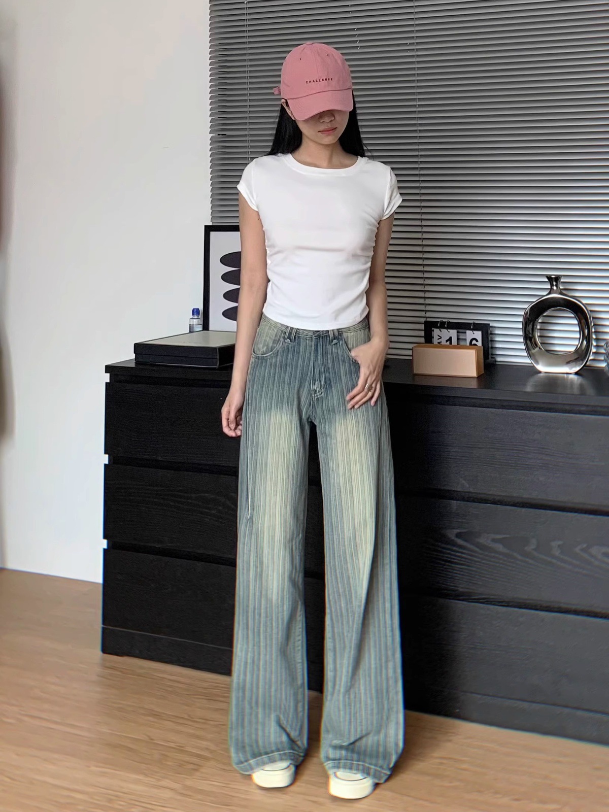 빈티지 하이 허리 스트레이트 청바지 여성용 2025 년 여름 새로운 느슨한 줄무늬 디자인 올매치 좁은 넓은 다리 바지스토어 가기