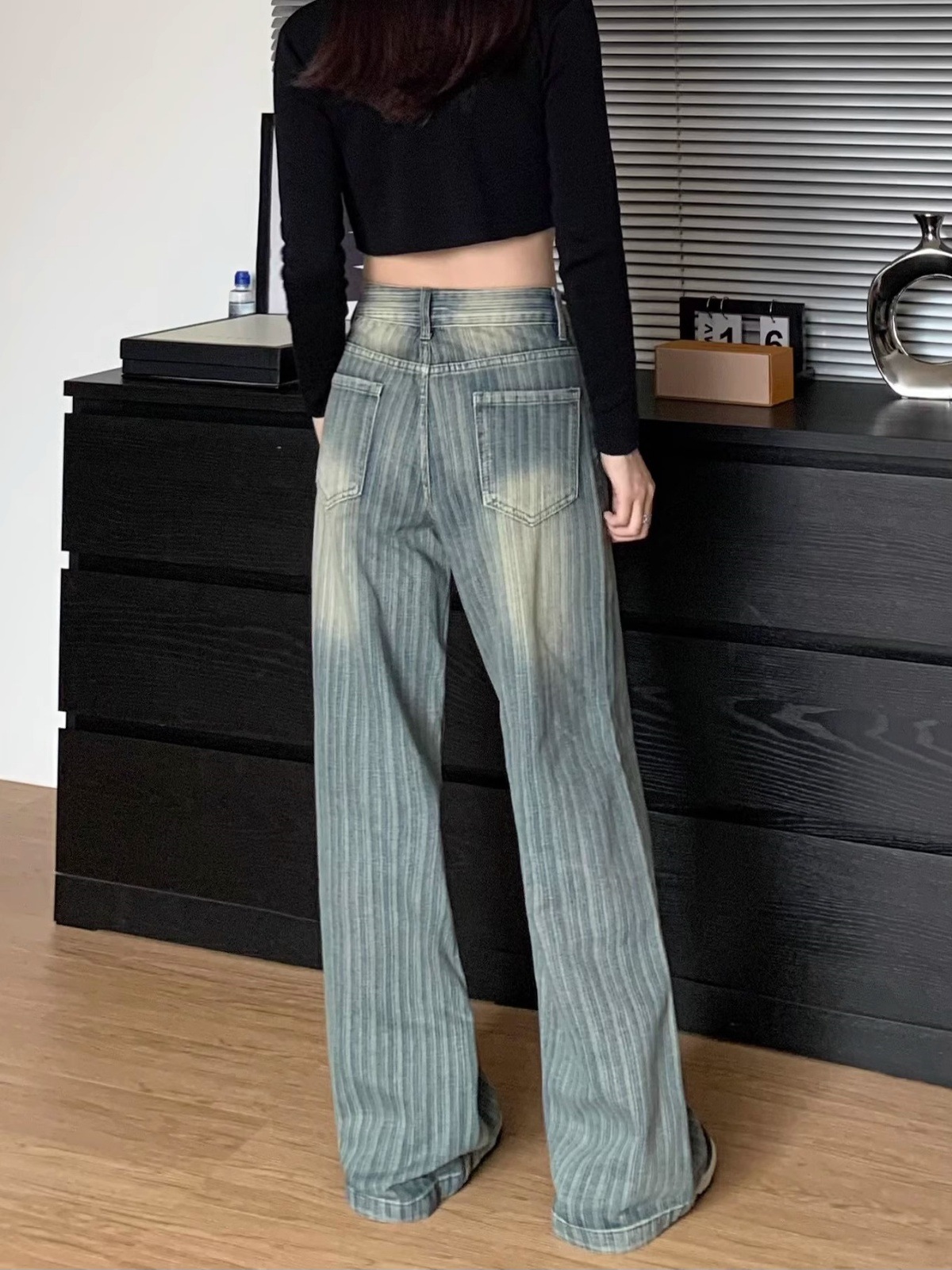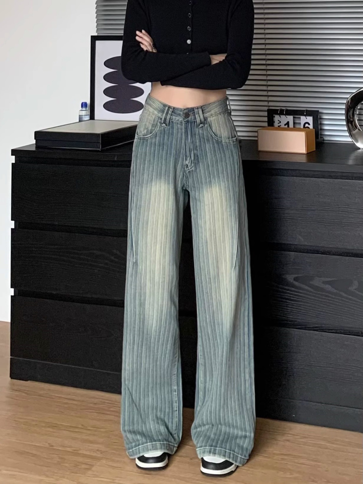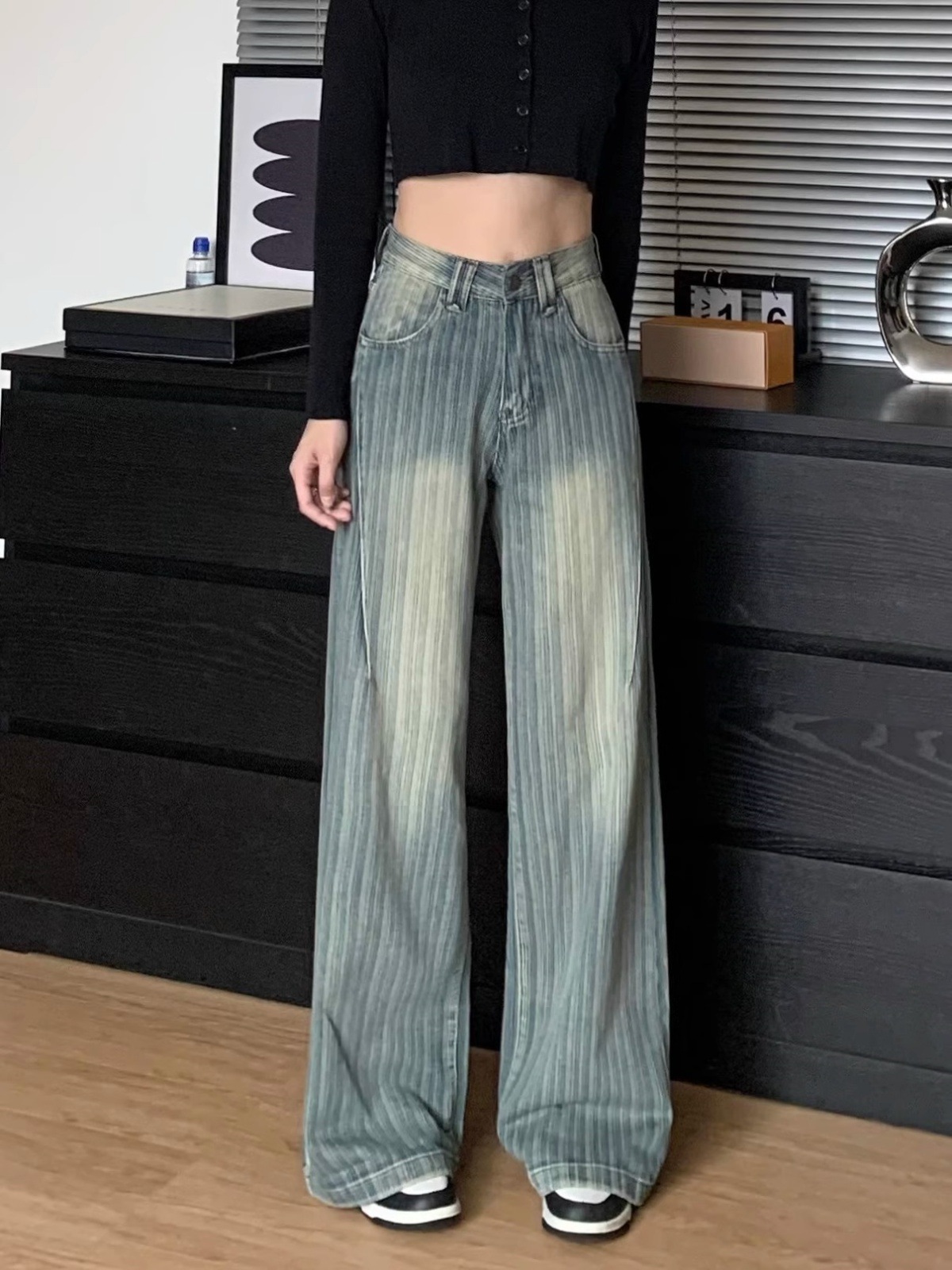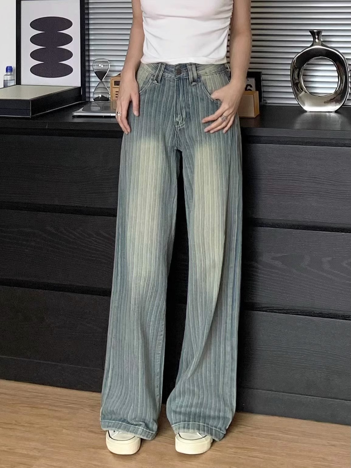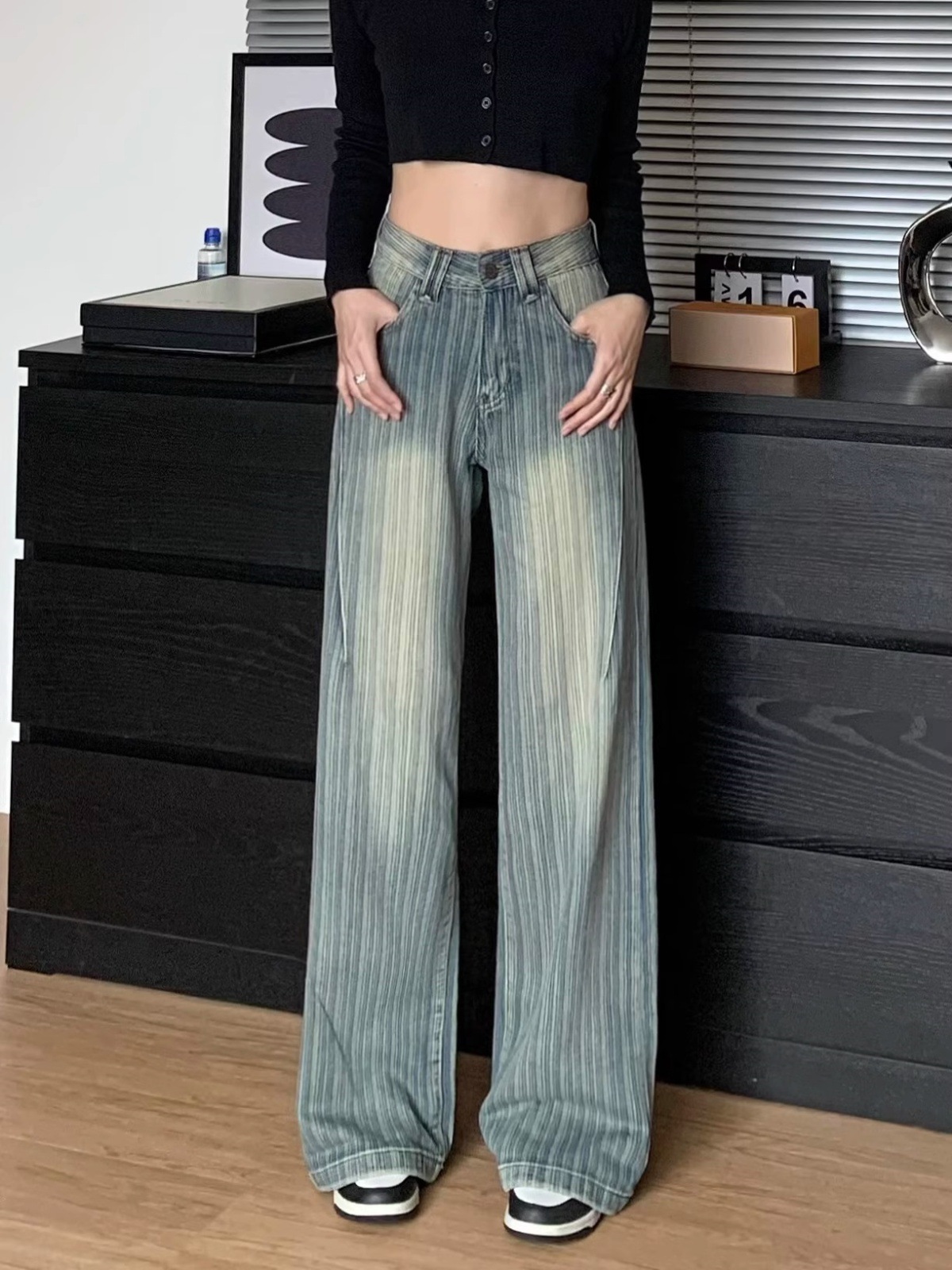빈티지 하이 허리 스트레이트 청바지 여성용 2025 년 여름 새로운 느슨한 줄무늬 디자인 올매치 좁은 넓은 다리 바지