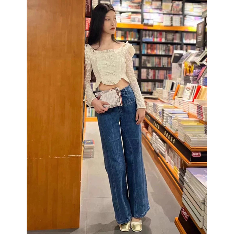 소녀의 심장 허리 활 디자인 넓은 다리 청바지 2025 봄과 가을 새로운 패션 슬리밍 좁은 직선 다리 바지스토어 가기