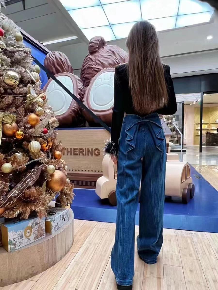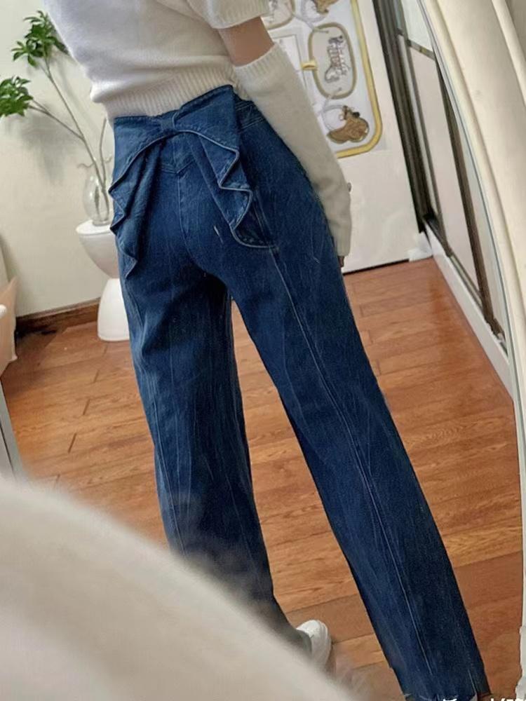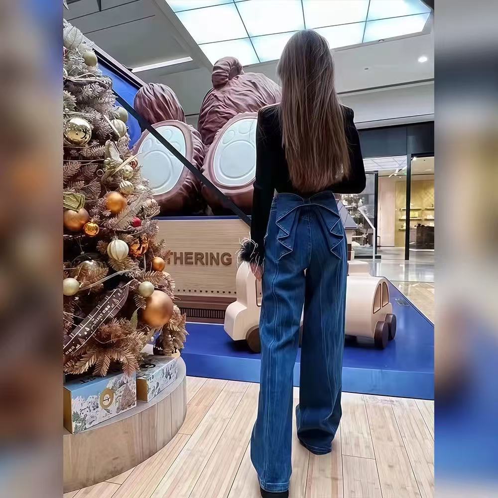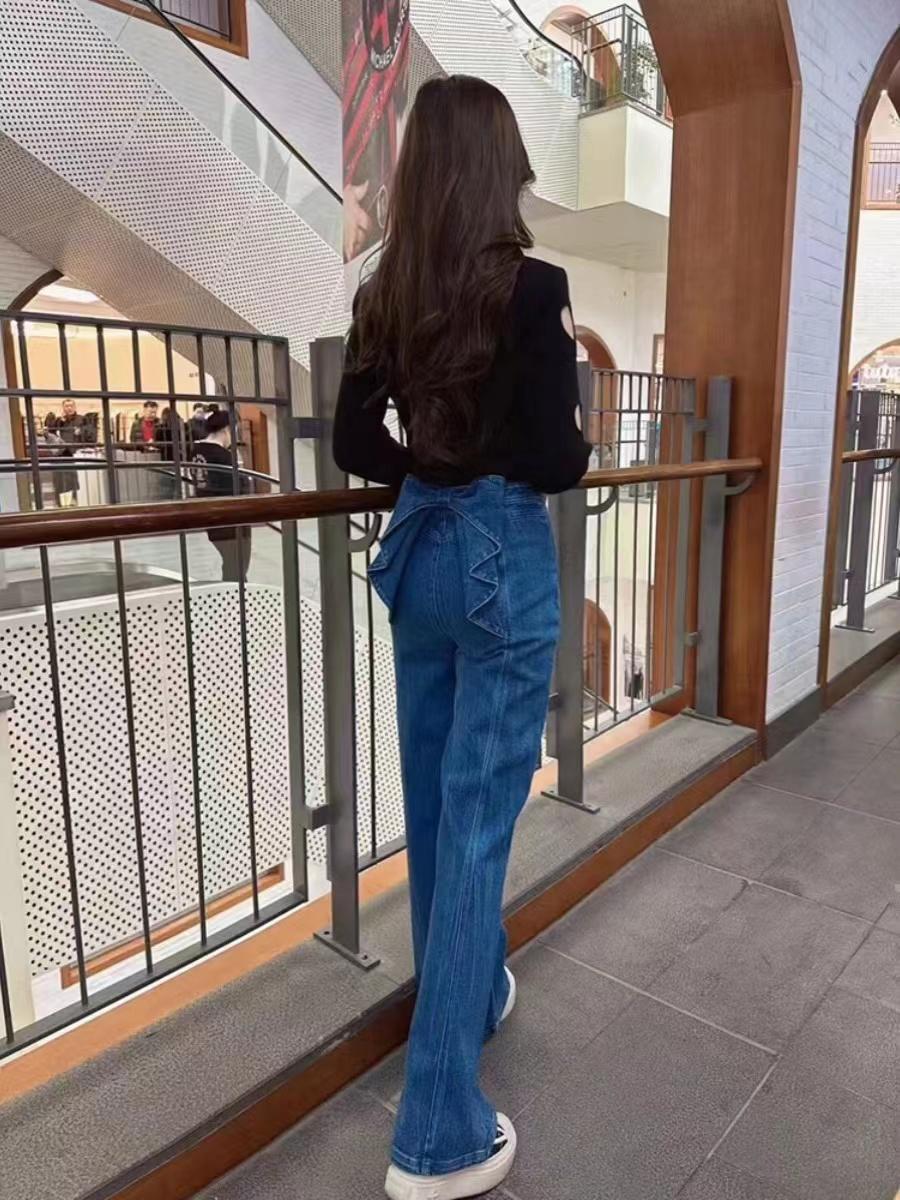 소녀의 심장 허리 활 디자인 넓은 다리 청바지 2025 봄과 가을 새로운 패션 슬리밍 좁은 직선 다리 바지