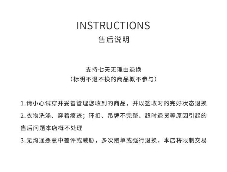 4.所有质量、调换尺码等问题产生的退、换货,请按退货流程申请退款,重拍即可。