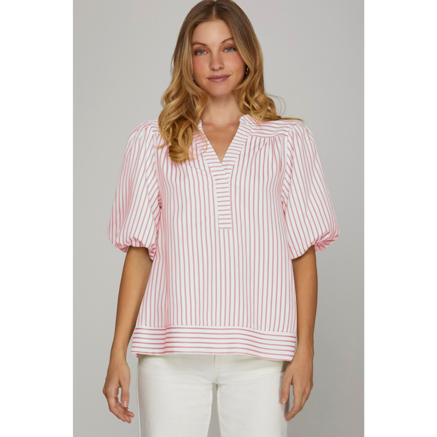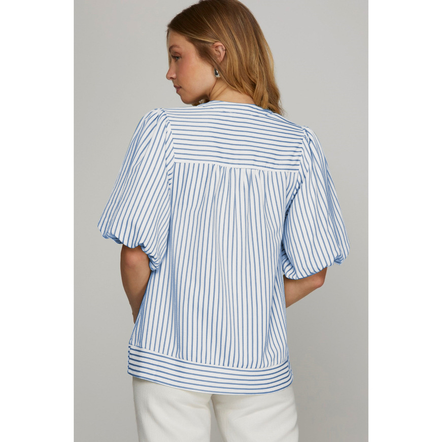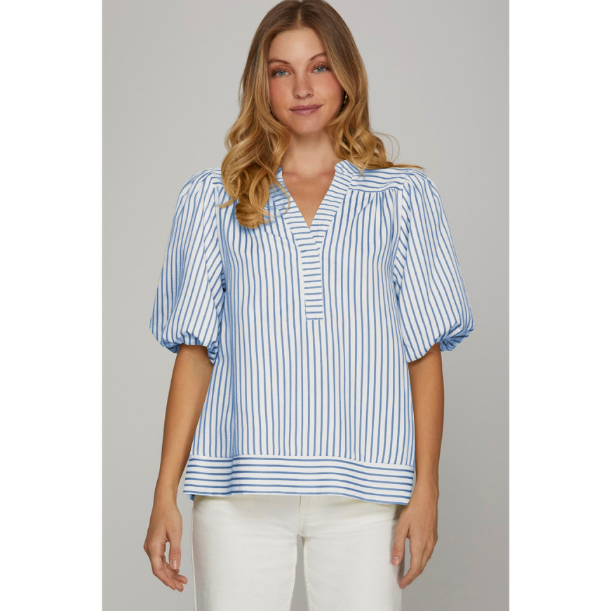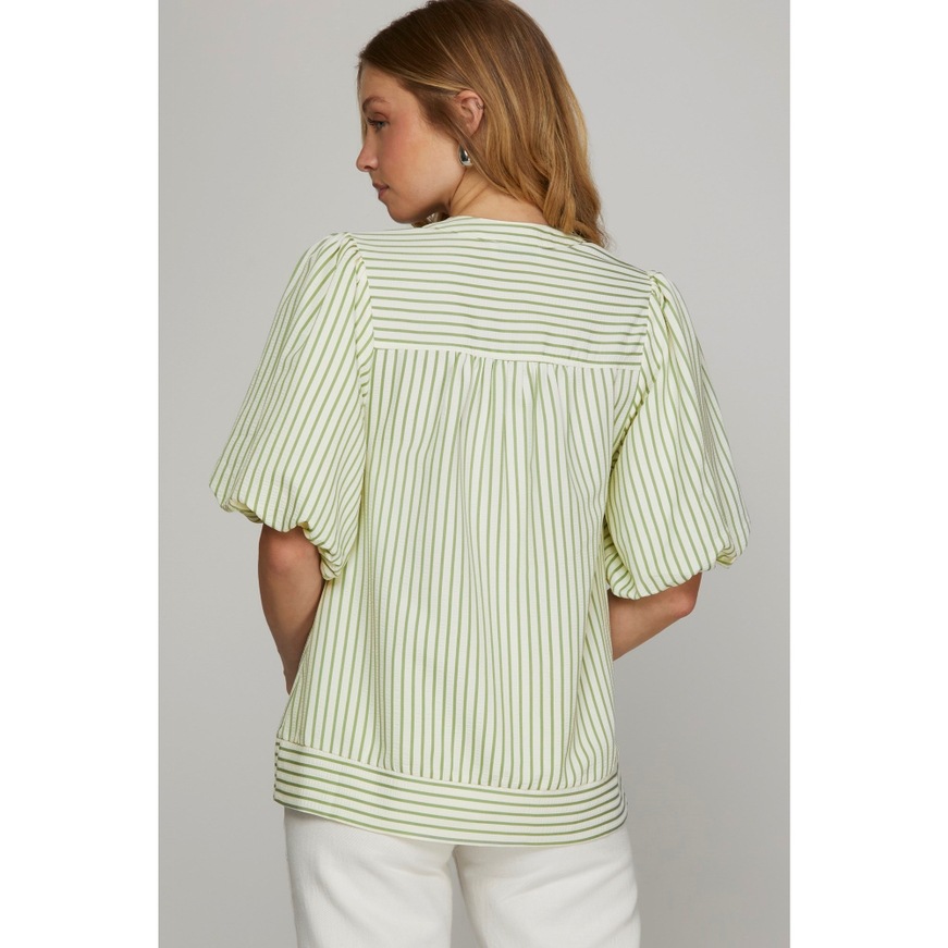 유럽과 미국의 여성 셔츠 아마존 독립 역 국경 2025 새로운 V 넥 스티칭 버블 슬리브 스트라이프 탑스토어 가기