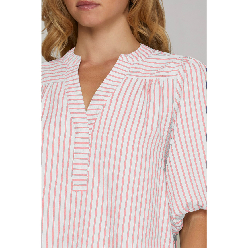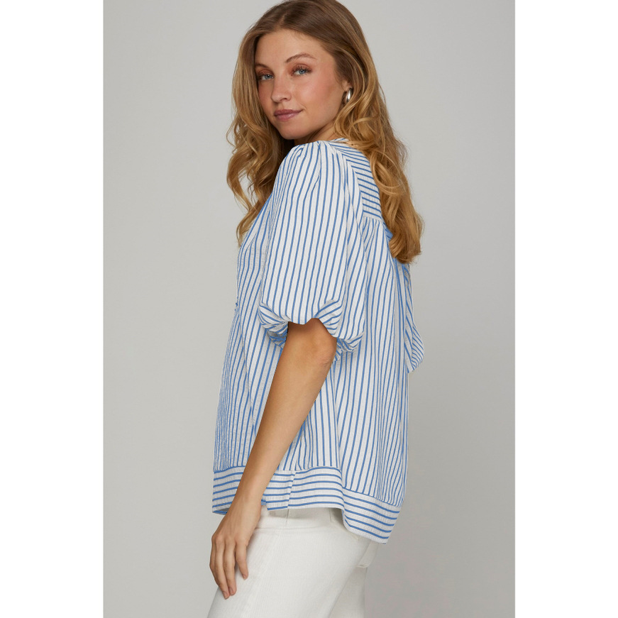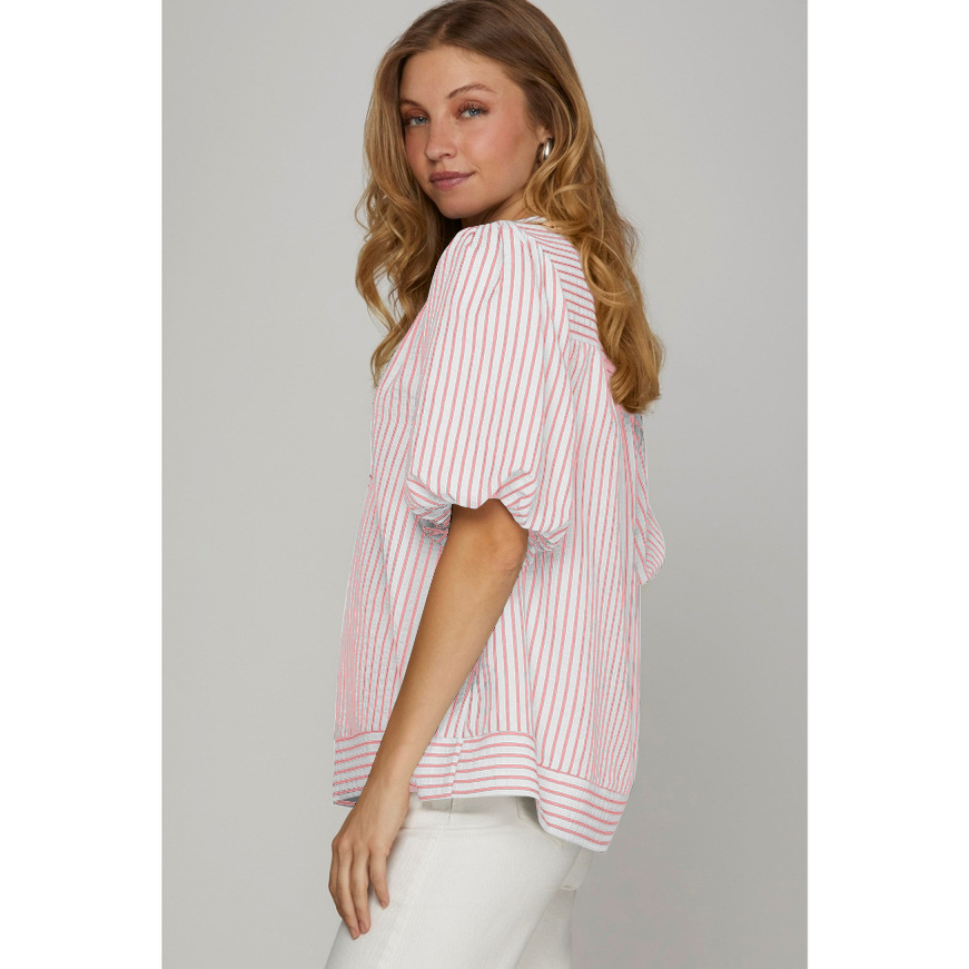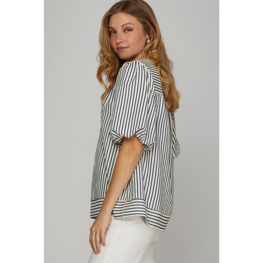 유럽과 미국의 여성 셔츠 아마존 독립 역 국경 2025 새로운 V 넥 스티칭 버블 슬리브 스트라이프 탑스토어 가기