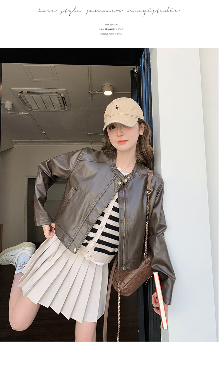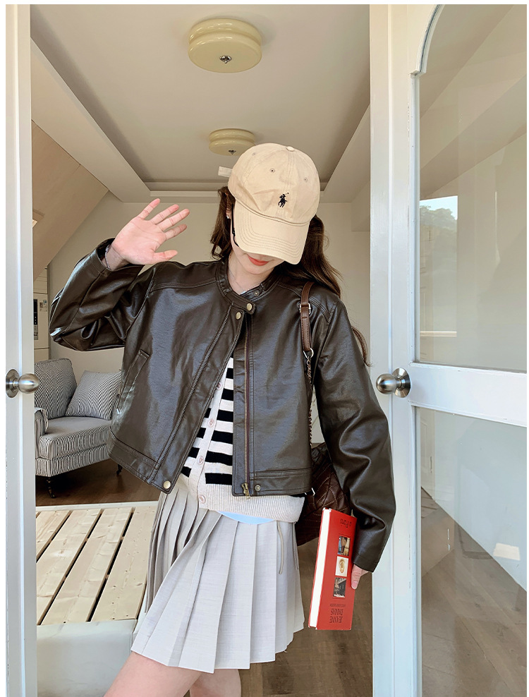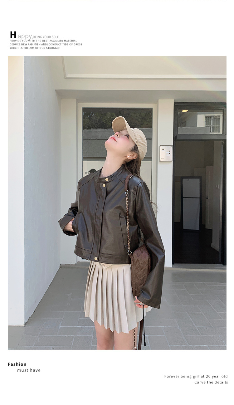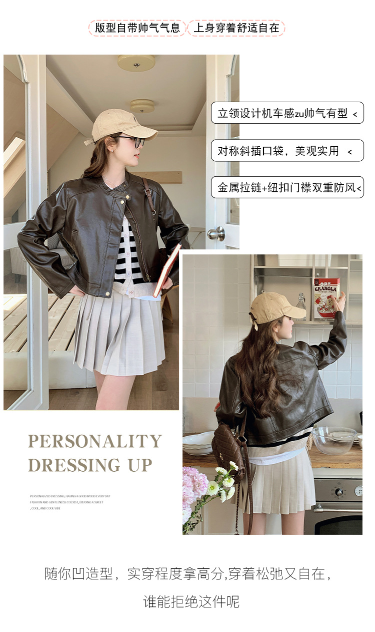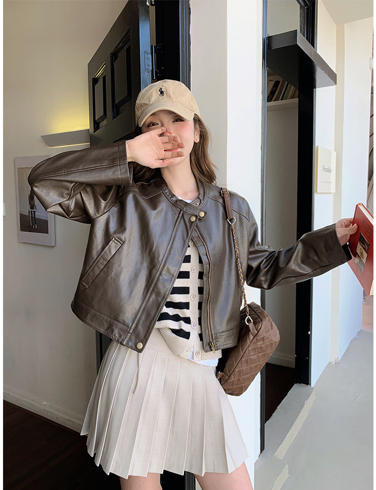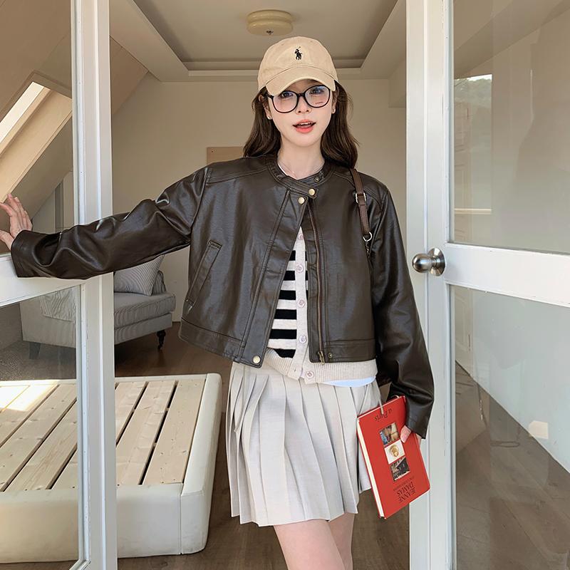 폭발 작은 다크 브라운 하이 엔드 감각 가죽 자켓 여성 2025 봄 올해 인기있는 짧은 오토바이 재킷스토어 가기