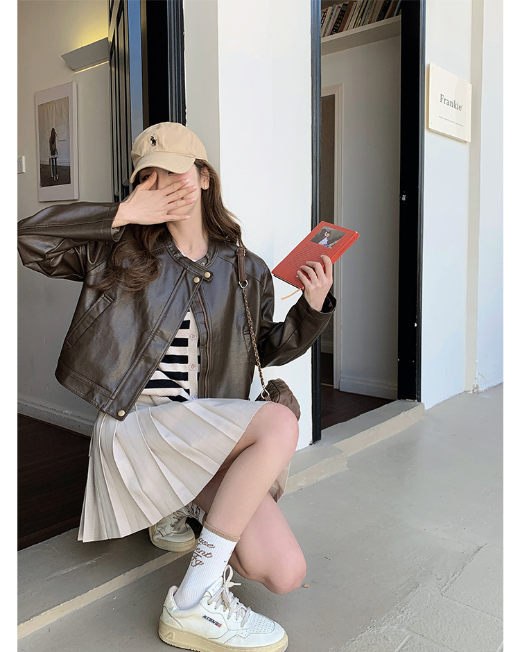 폭발 작은 다크 브라운 하이 엔드 감각 가죽 자켓 여성 2025 봄 올해 인기있는 짧은 오토바이 재킷