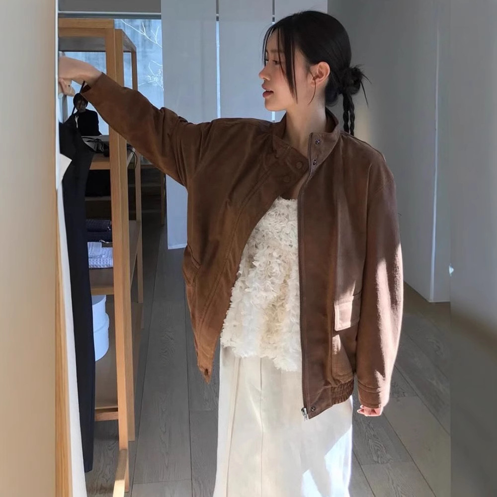 스팟 레트로 돼지 가죽 스웨이드 터틀넥 재킷 봄 여성 루즈 캐주얼 지퍼 코트 모노 *a