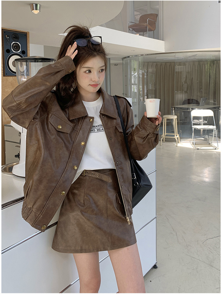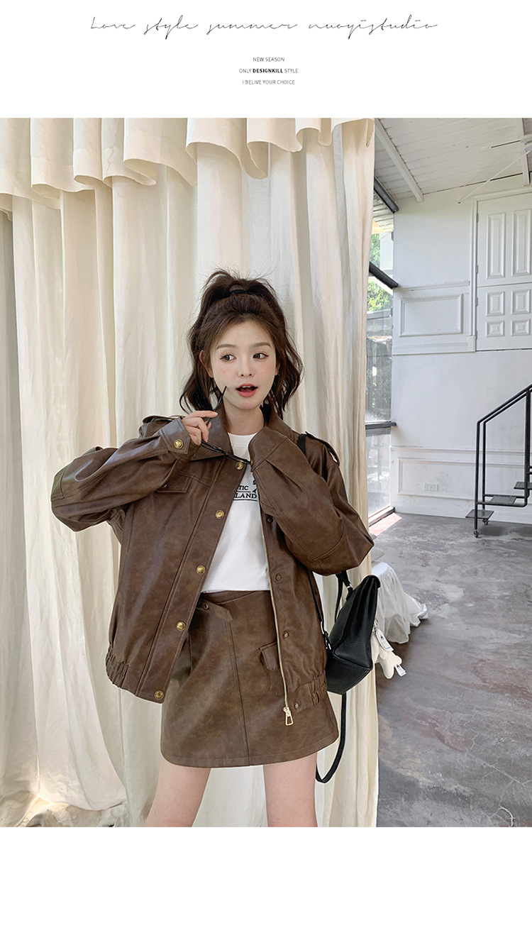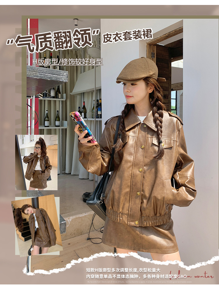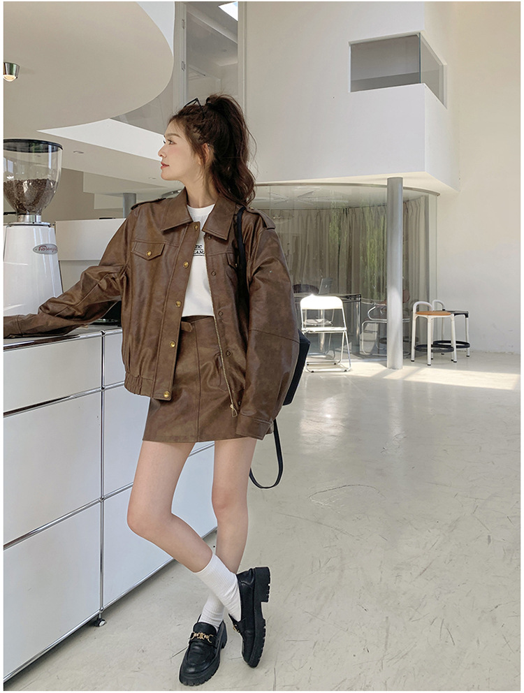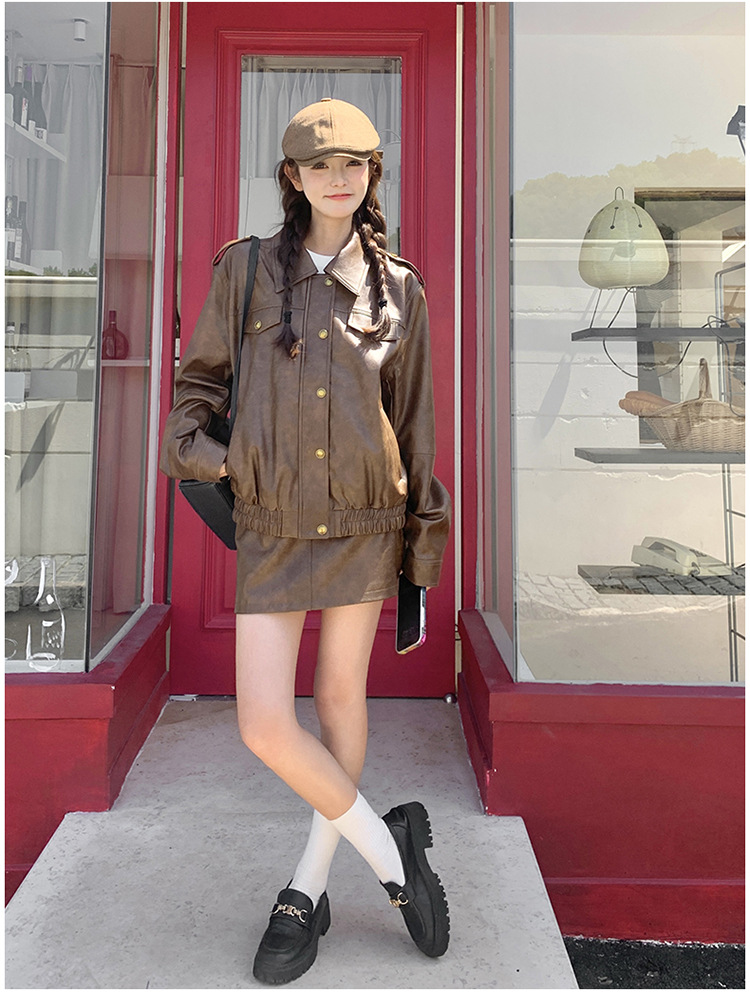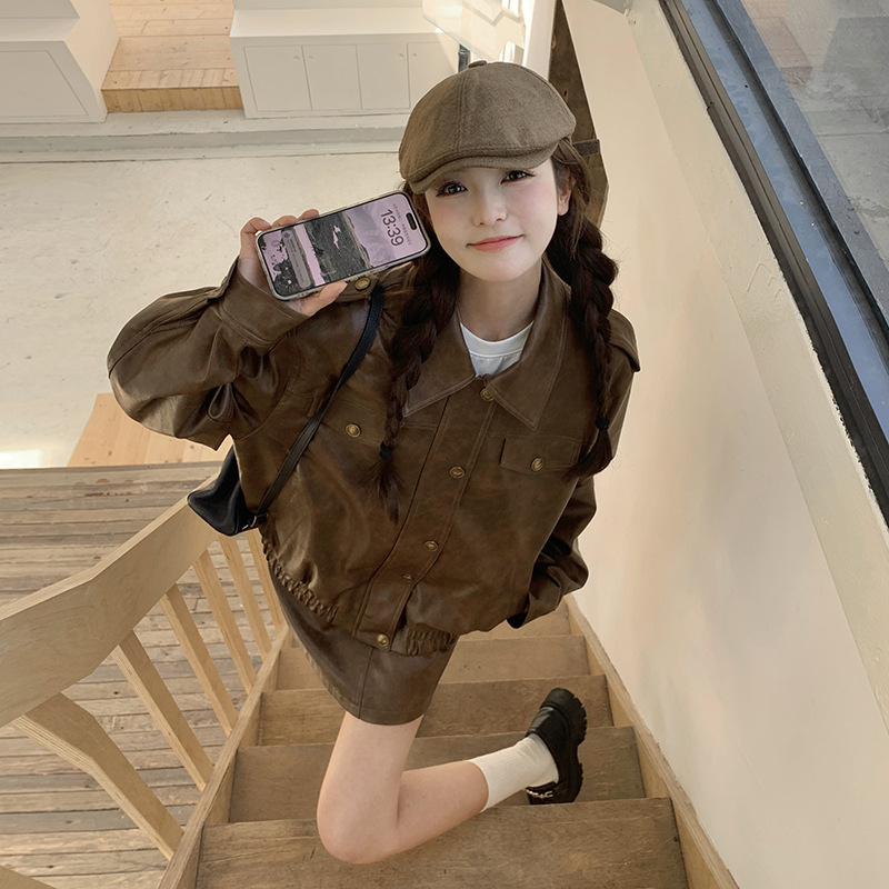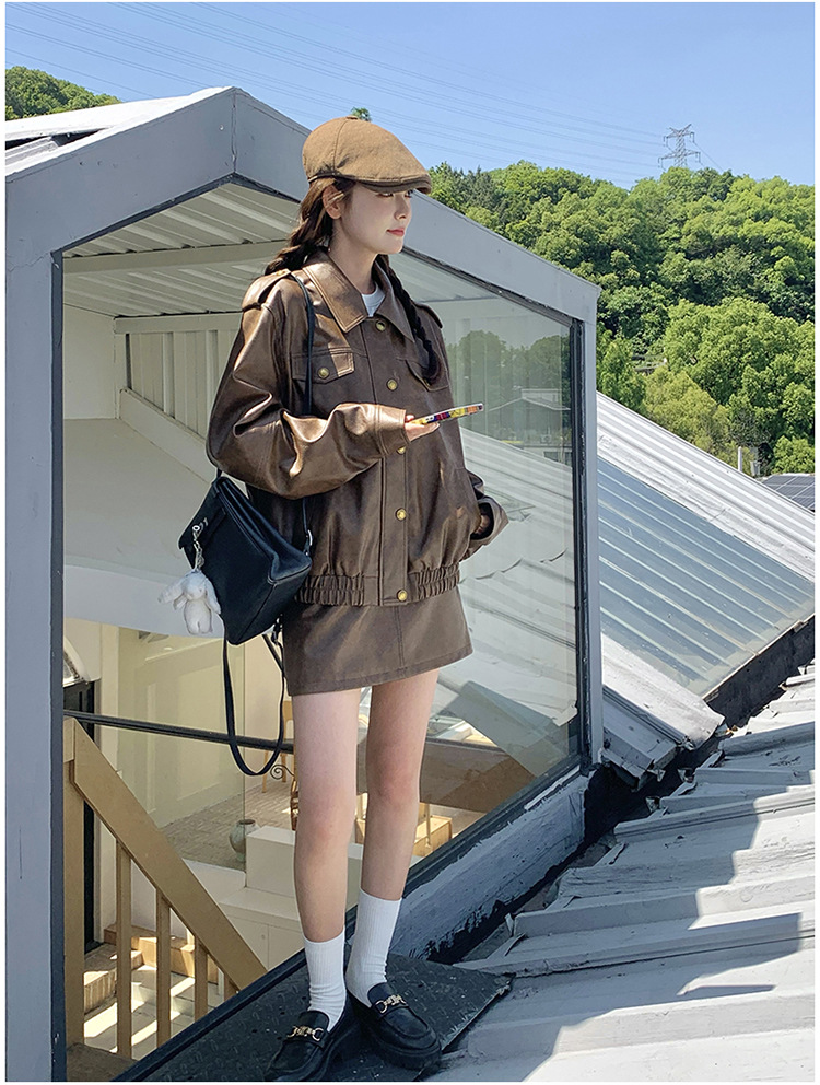 [멩메이] 25 봄 메이파 마일러드 레트로 가죽 쇼트 스커트 세트 여성 캐주얼 재킷 스커트 투피스 세트