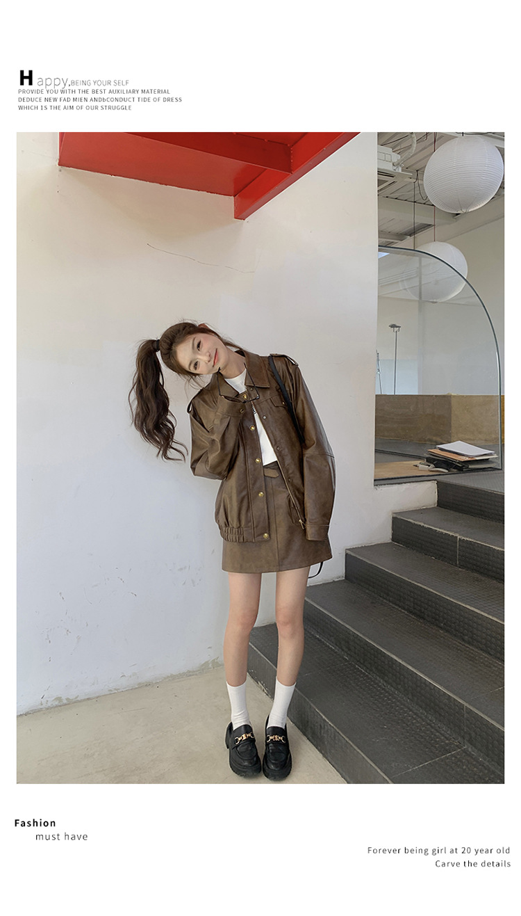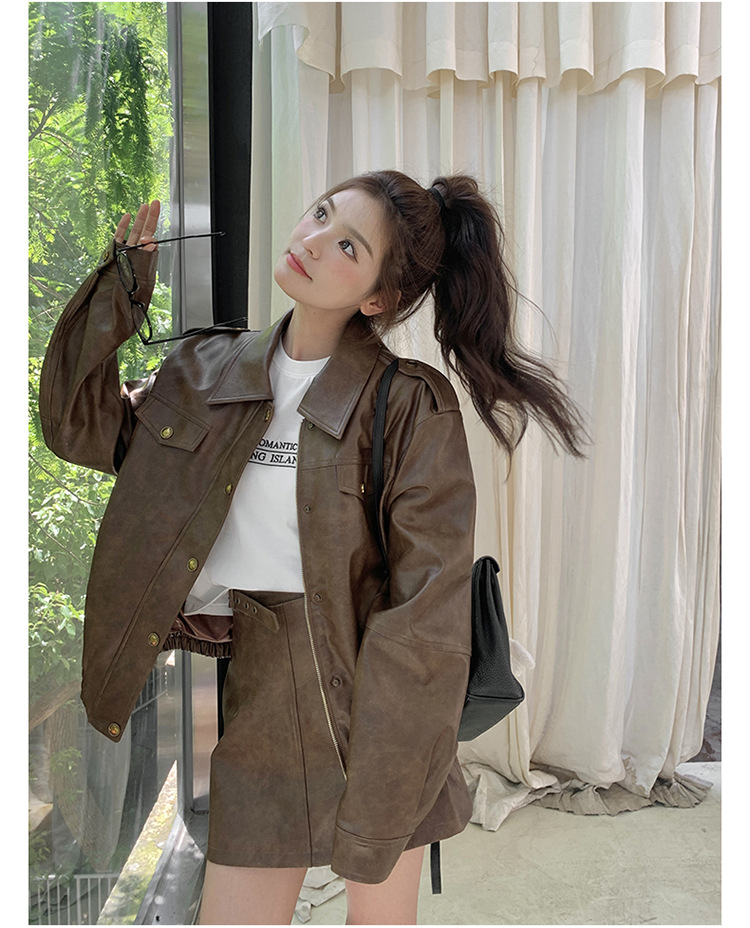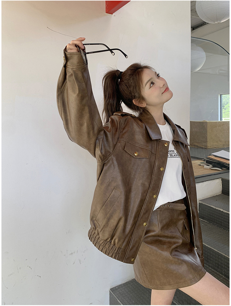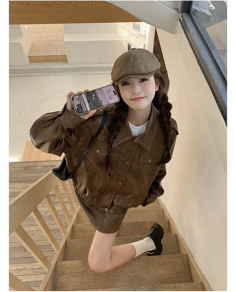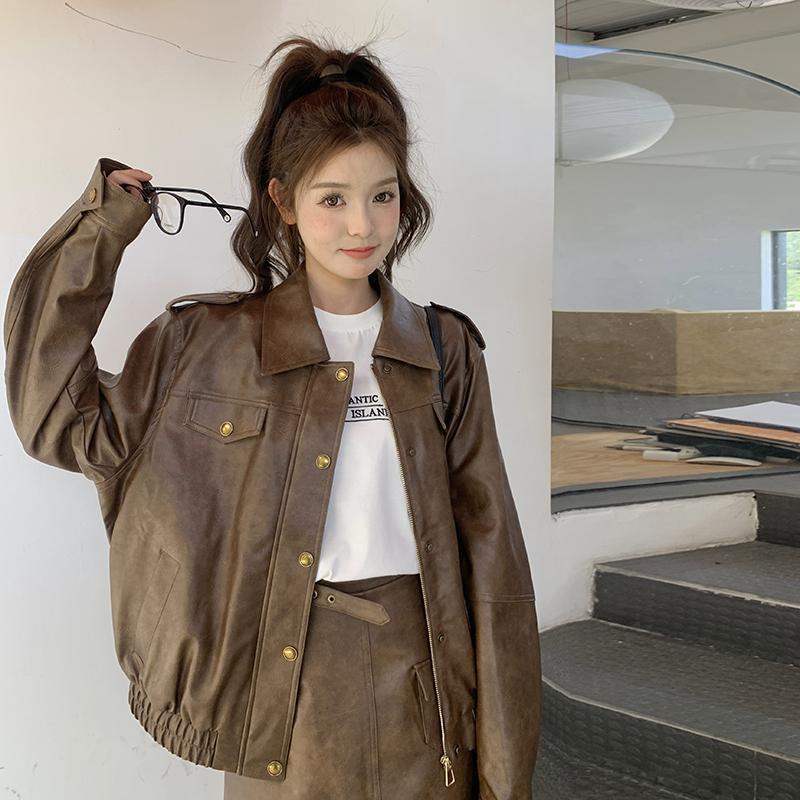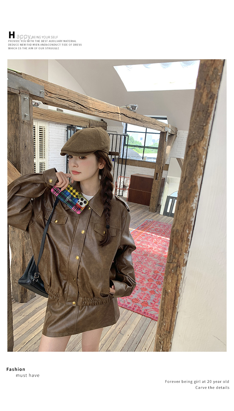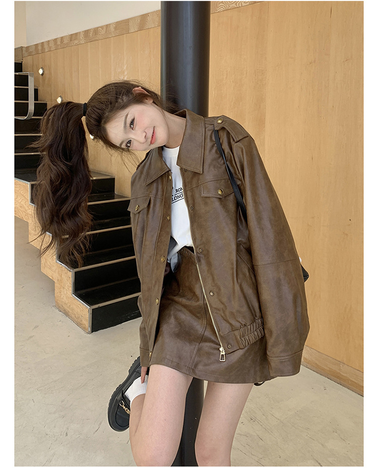 [멩메이] 25 봄 메이파 마일러드 레트로 가죽 쇼트 스커트 세트 여성 캐주얼 재킷 스커트 투피스 세트
