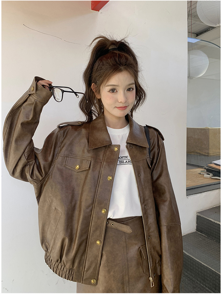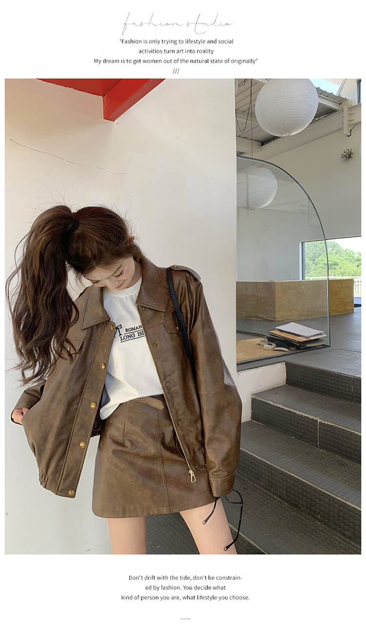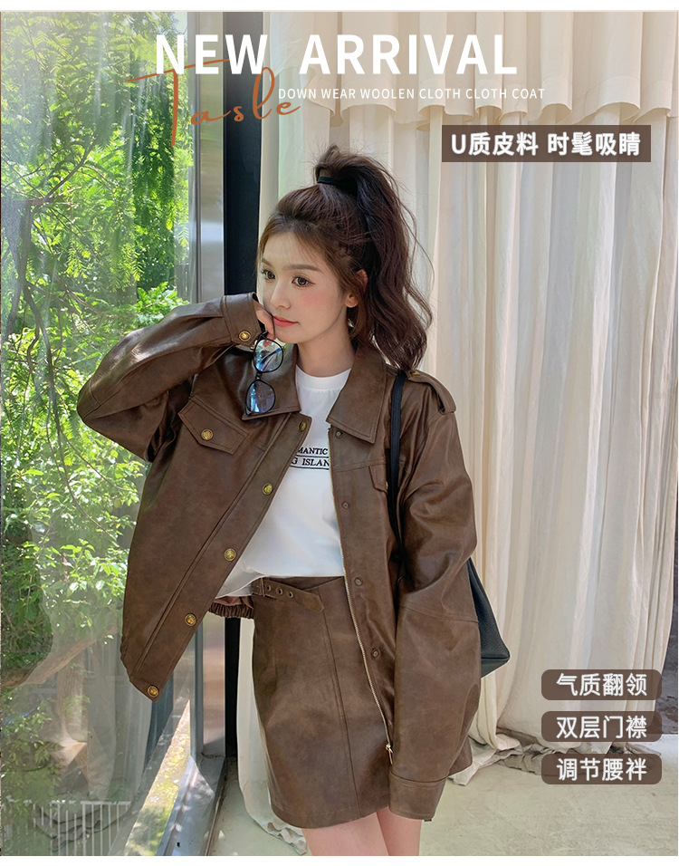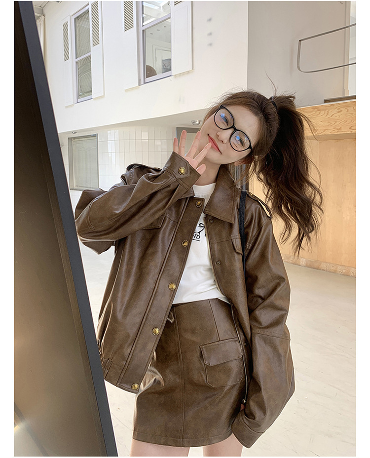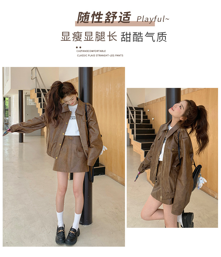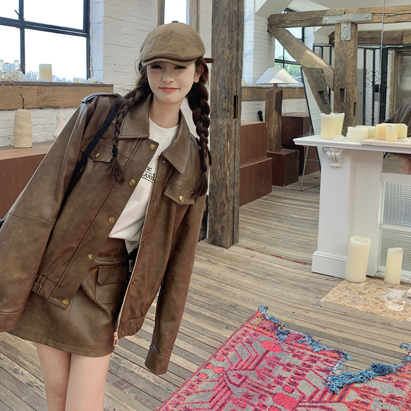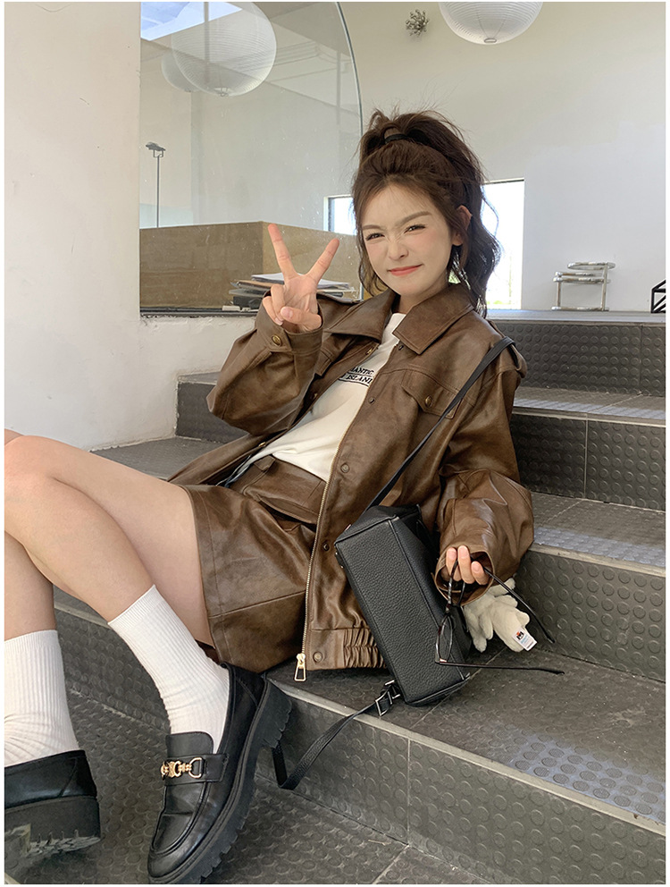[멩메이] 25 봄 메이파 마일러드 레트로 가죽 쇼트 스커트 세트 여성 캐주얼 재킷 스커트 투피스 세트