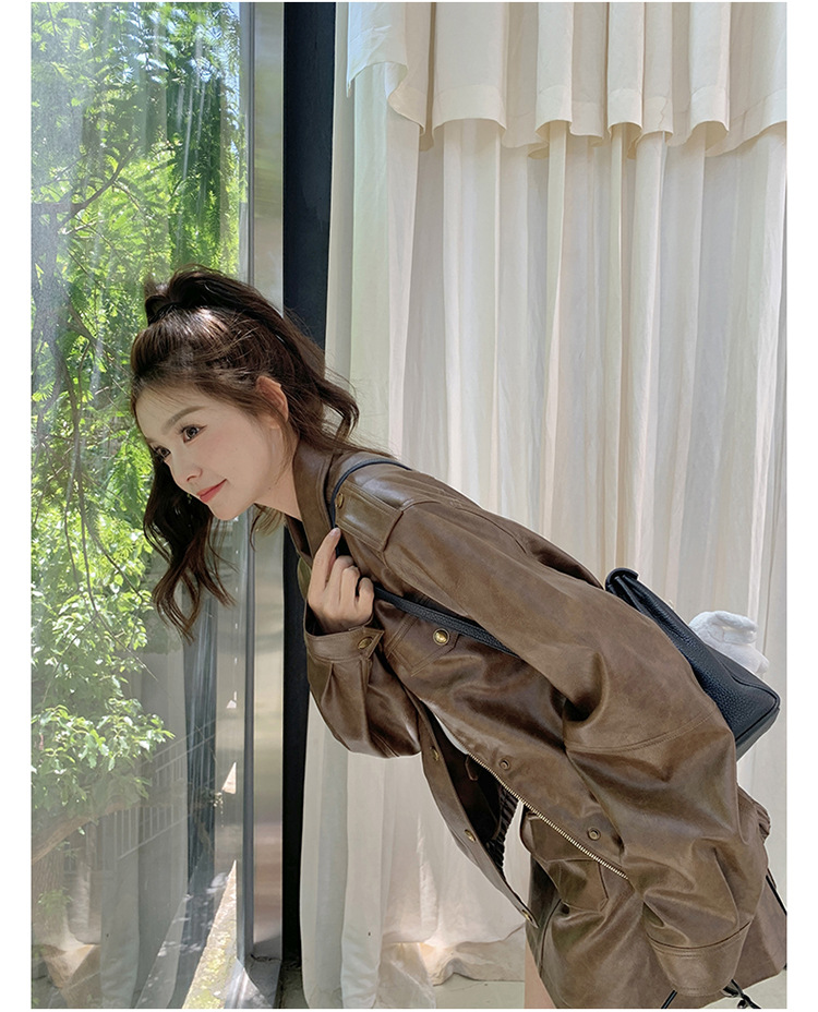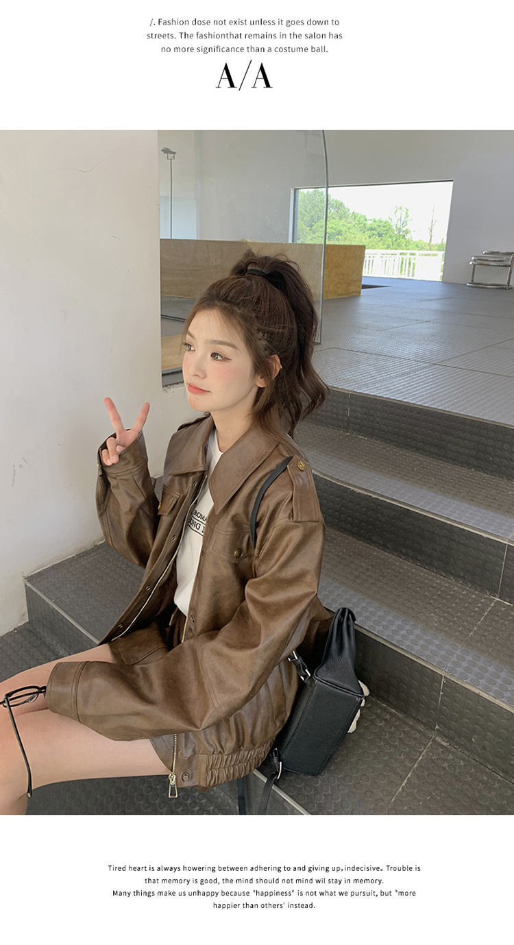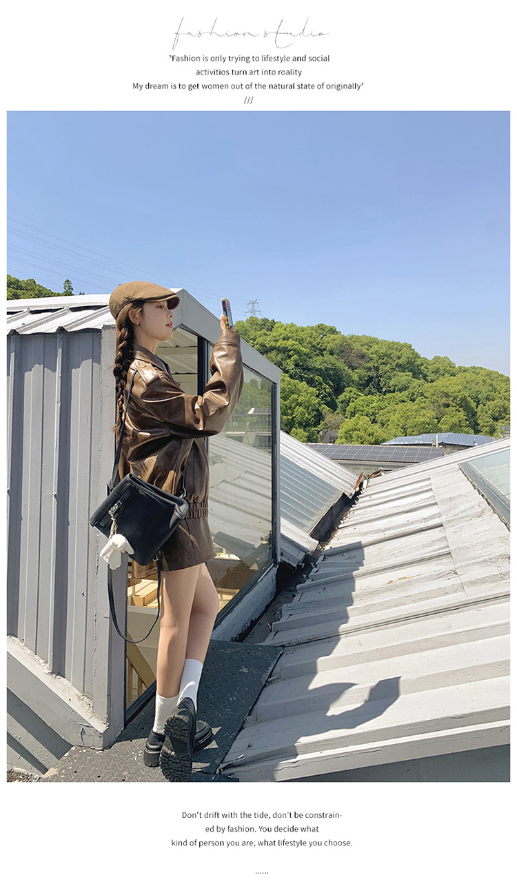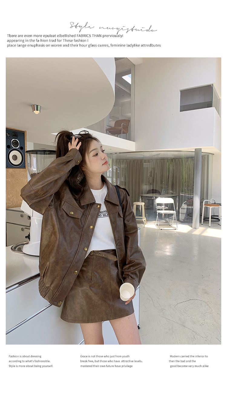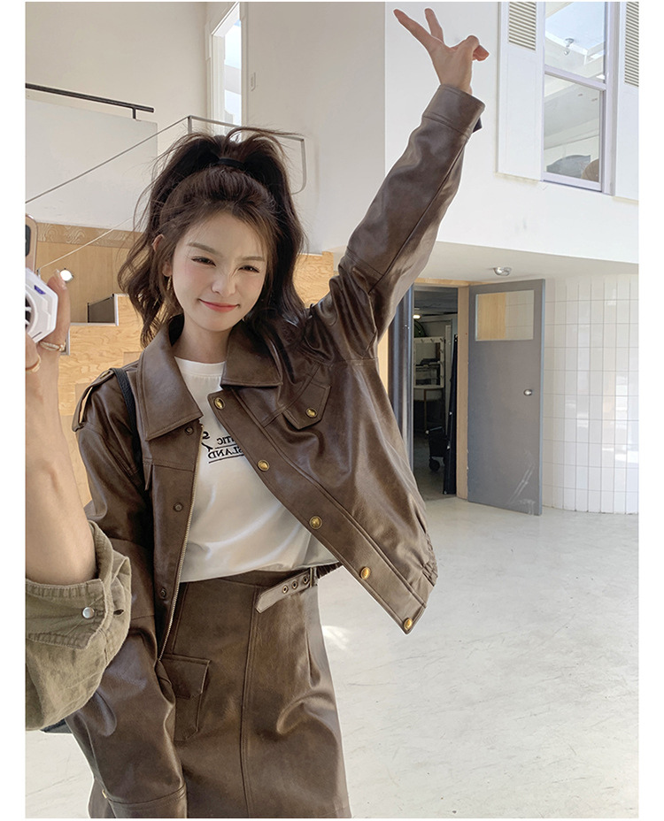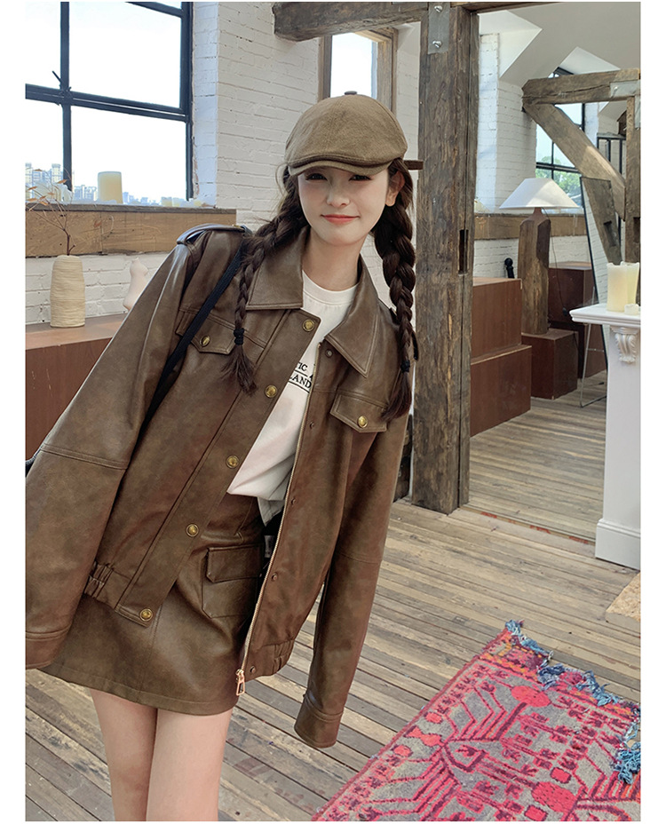[멩메이] 25 봄 메이파 마일러드 레트로 가죽 쇼트 스커트 세트 여성 캐주얼 재킷 스커트 투피스 세트
