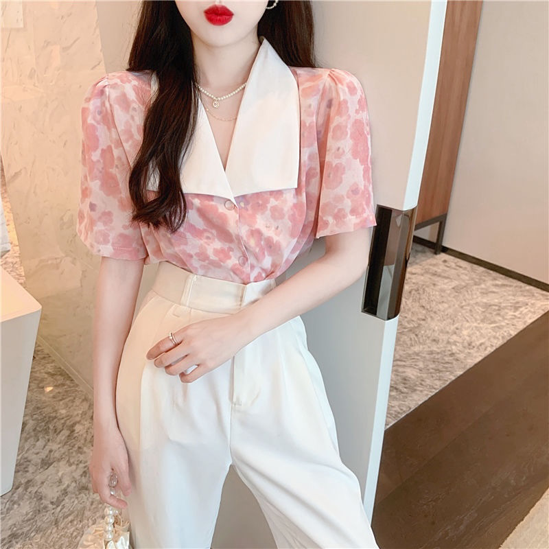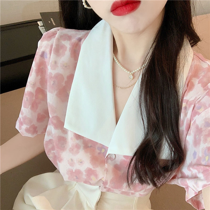 2025 여름 새로운 디자인 센스 틈새 옷깃 꽃 쉬폰 셔츠 여성용 퍼프 슬리브 프렌치 셔츠 탑스토어 가기
