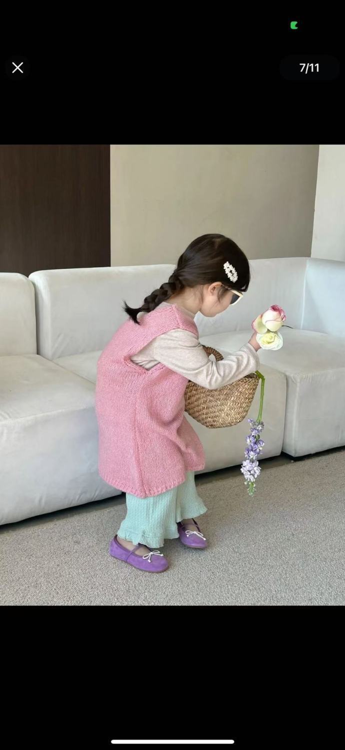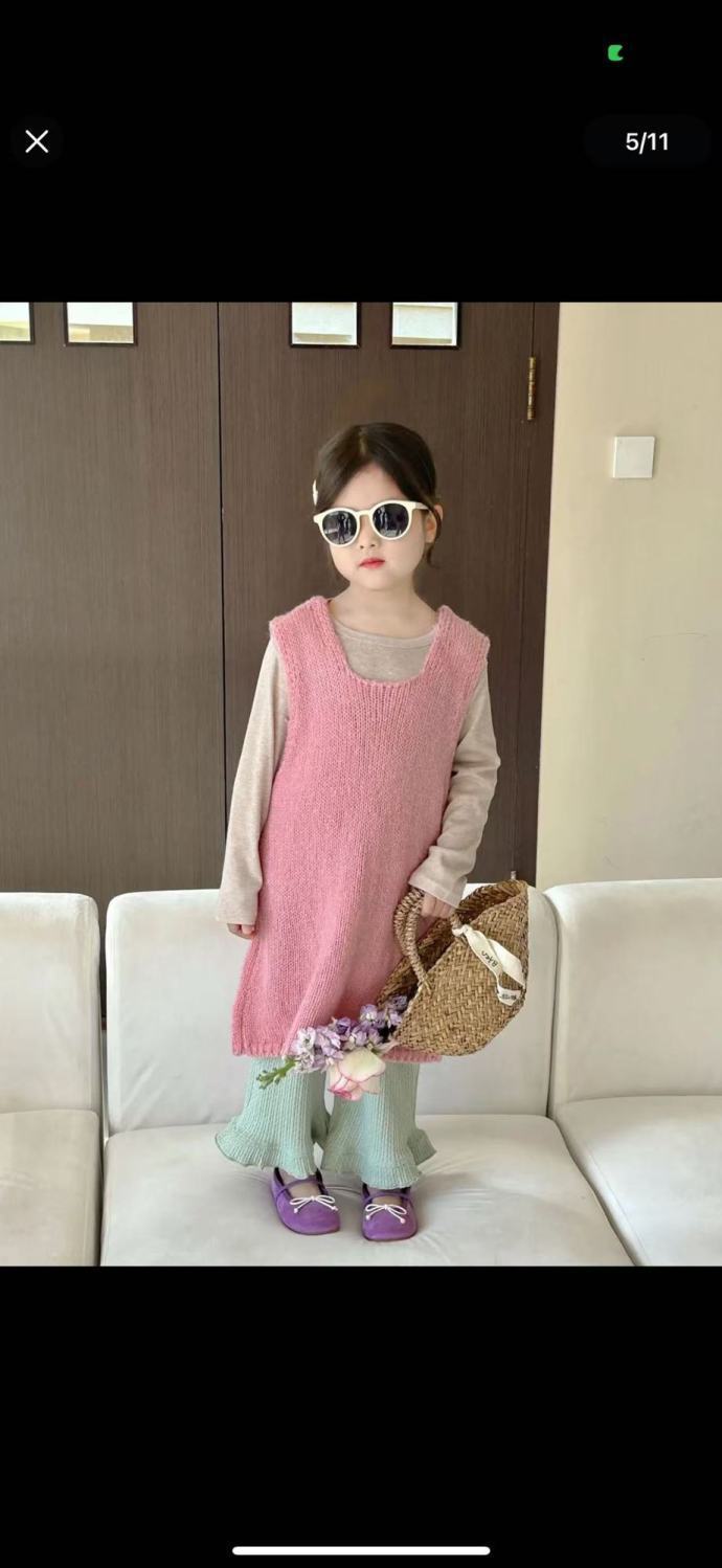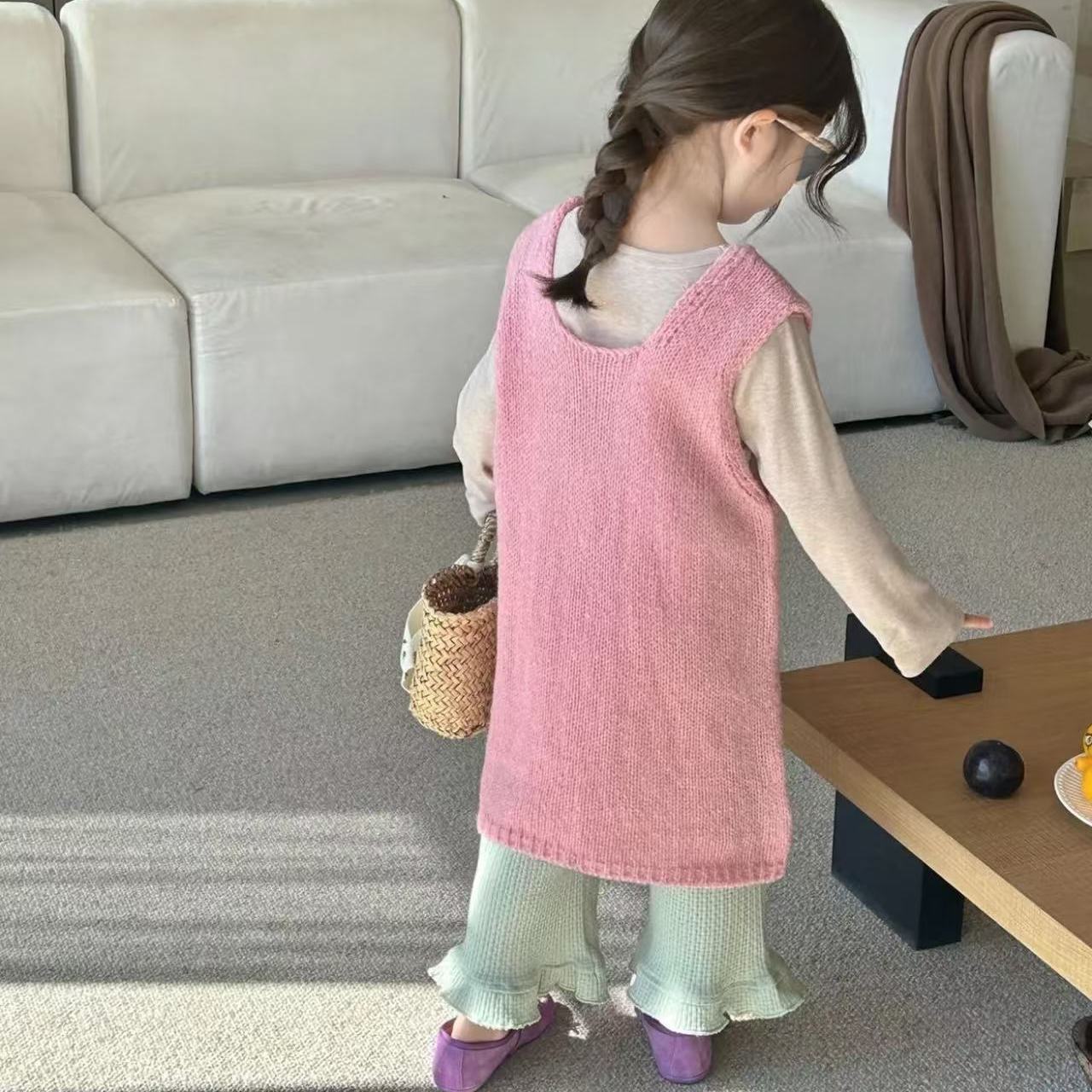 어린 소녀 한국 봄과 가을 새로운 달콤한 홍콩 스타일 니트 조끼 스웨터 원피스 바지 바지 바지 3 조각 세트스토어 가기