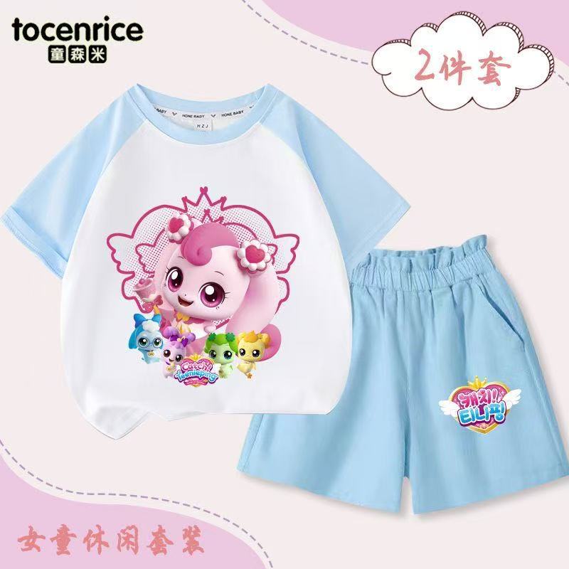 어린이 세트 반팔 바지 반바지 여름 2025 새로운 소녀 만화 티셔츠 달콤한 스타일 투피스 세트스토어 가기