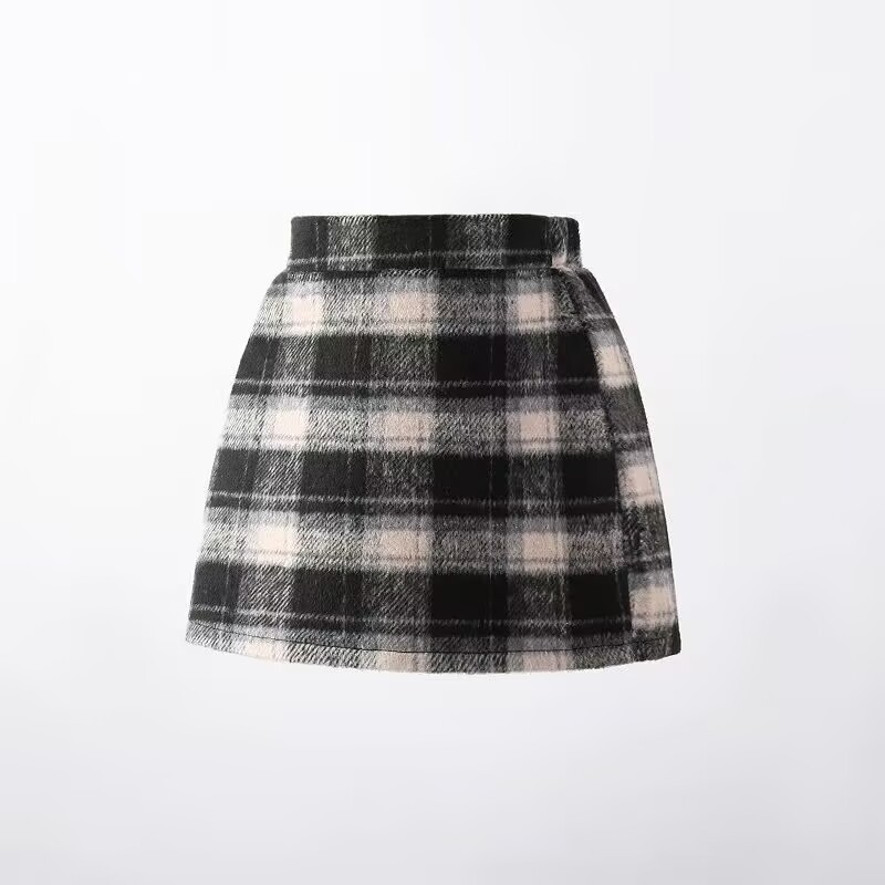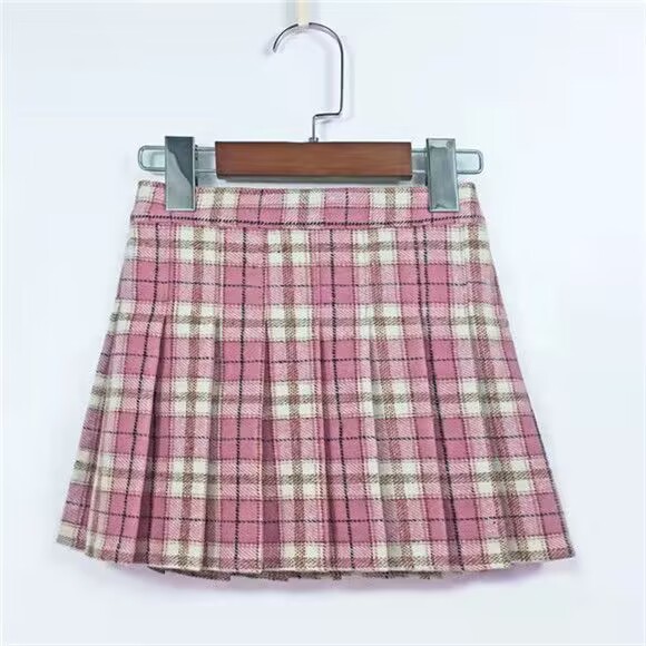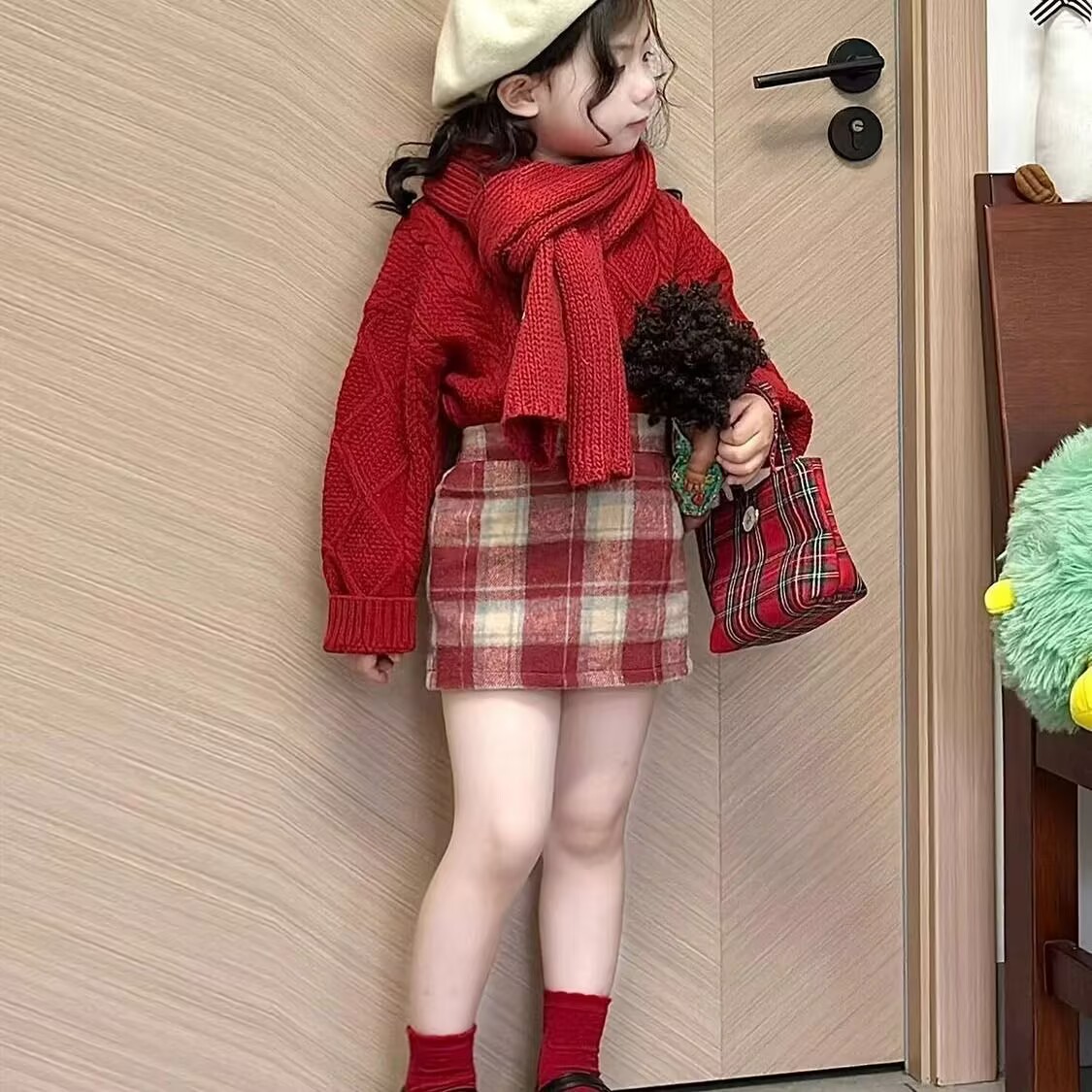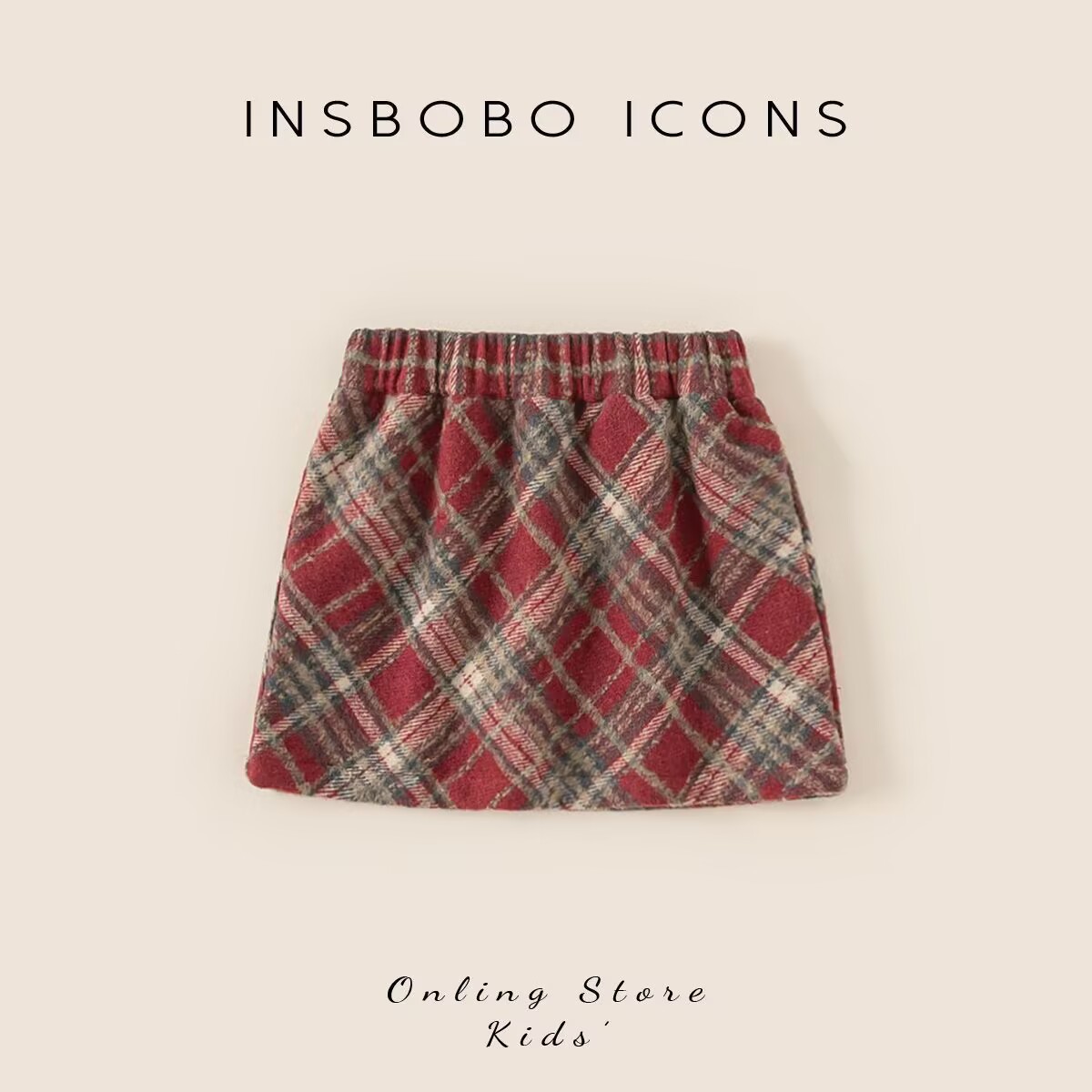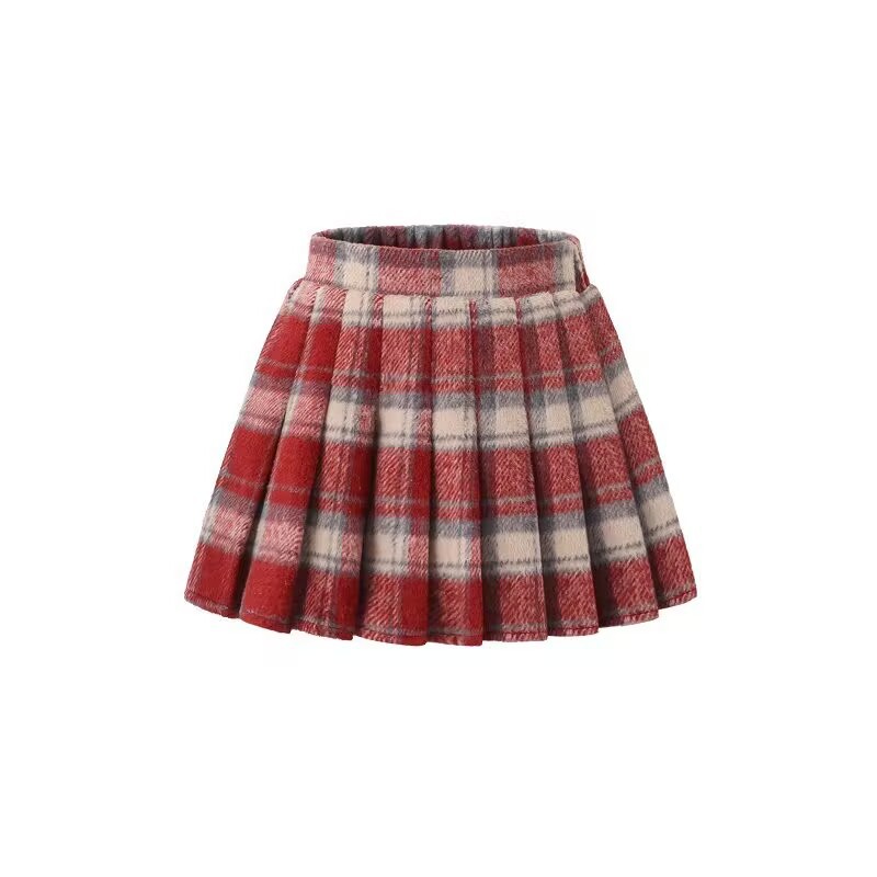 • 레트로 레드 체크 무늬 울 플리츠 스커트