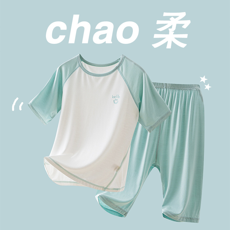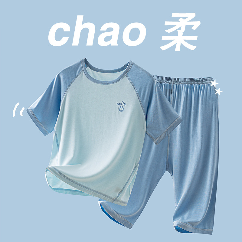 2025 봄과 여름 어린이 솔리드 컬러 탄성 에어컨 홈 의류 남학생과 여학생을위한 반팔 자른 바지 파자마 세트
