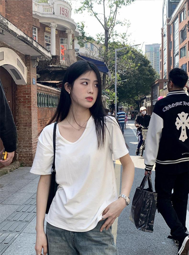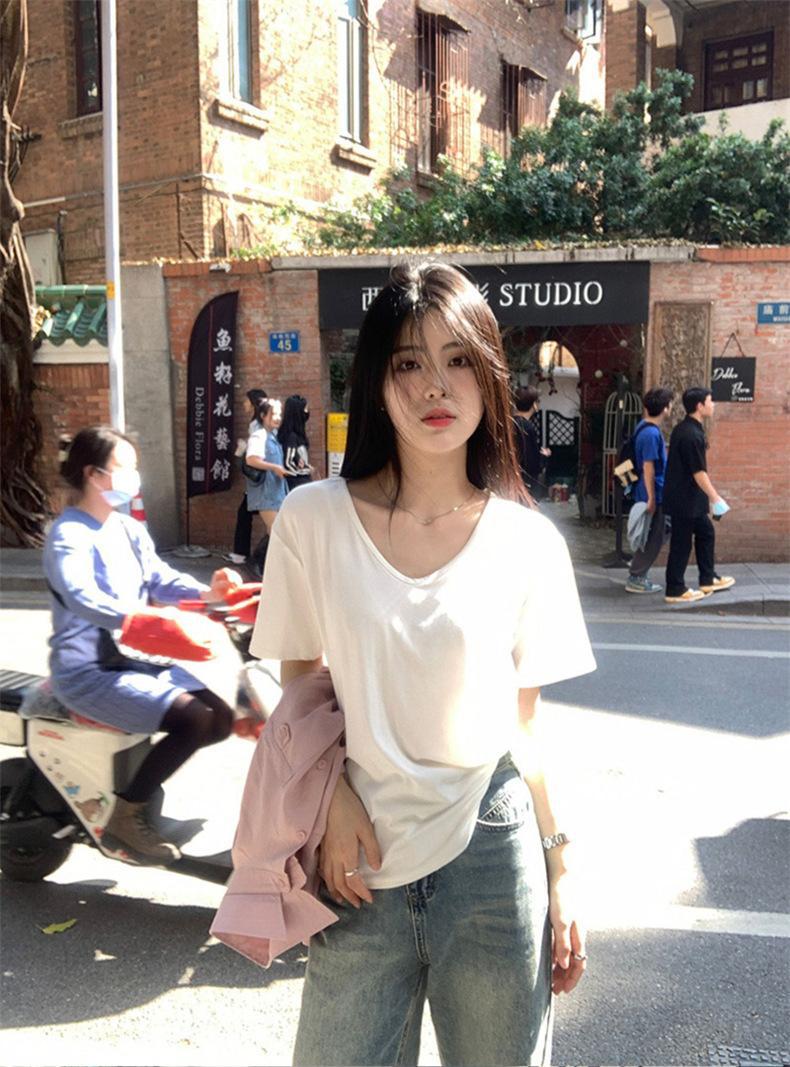 여름 심플 U-넥 기본 올 매치 니치 솔리드 컬러 디자인 센스 루즈 슬리밍 반팔 한국 티셔츠 탑 트렌디스토어 가기