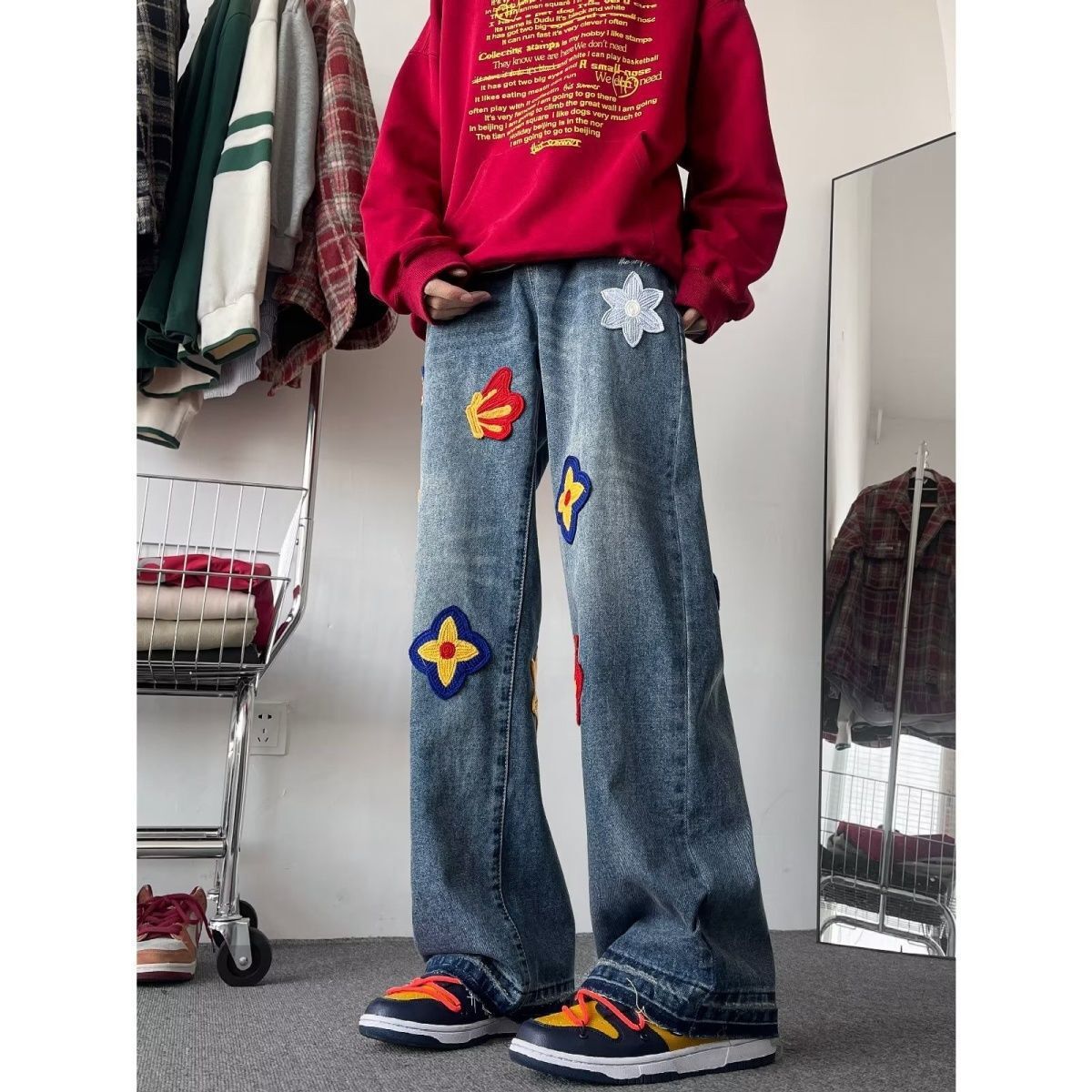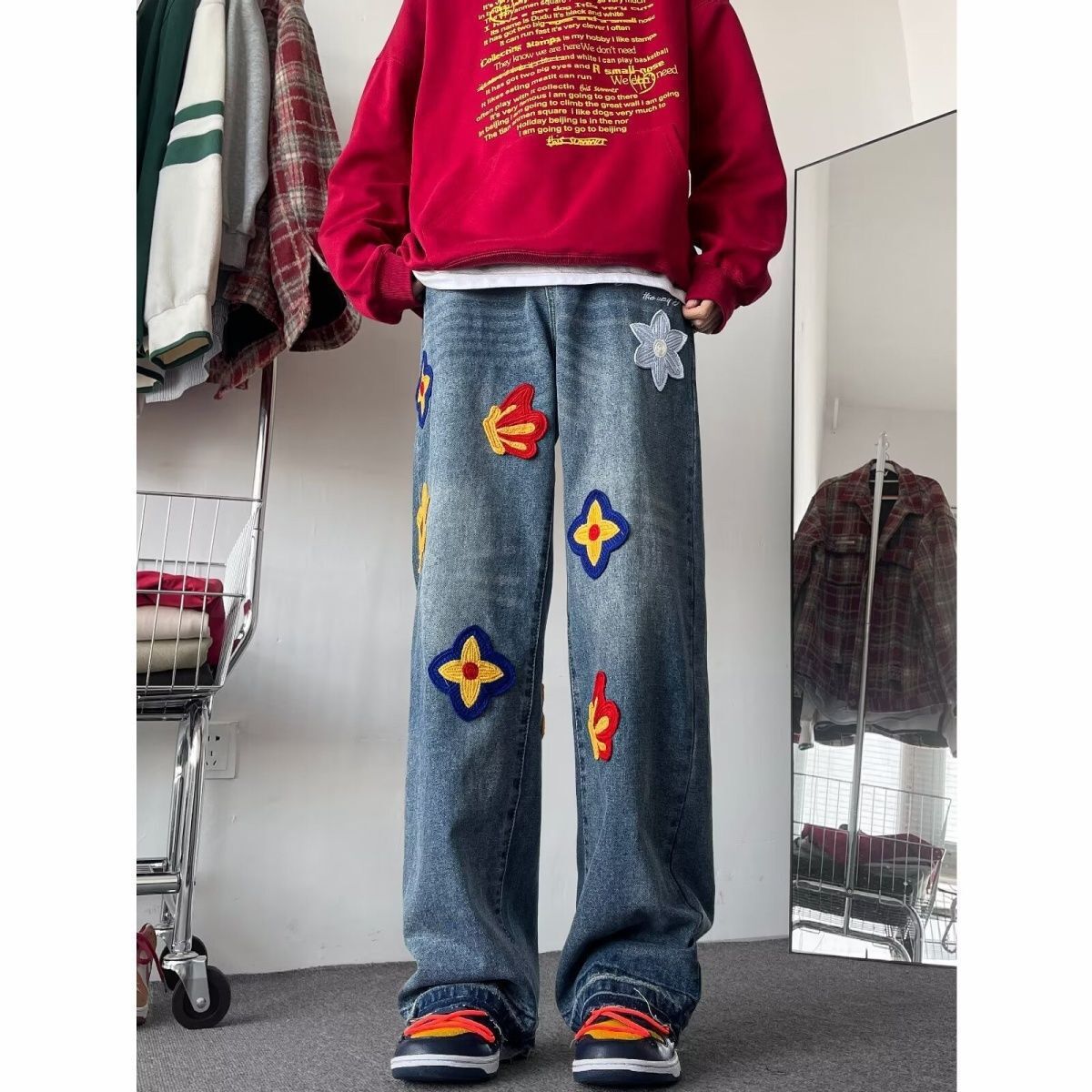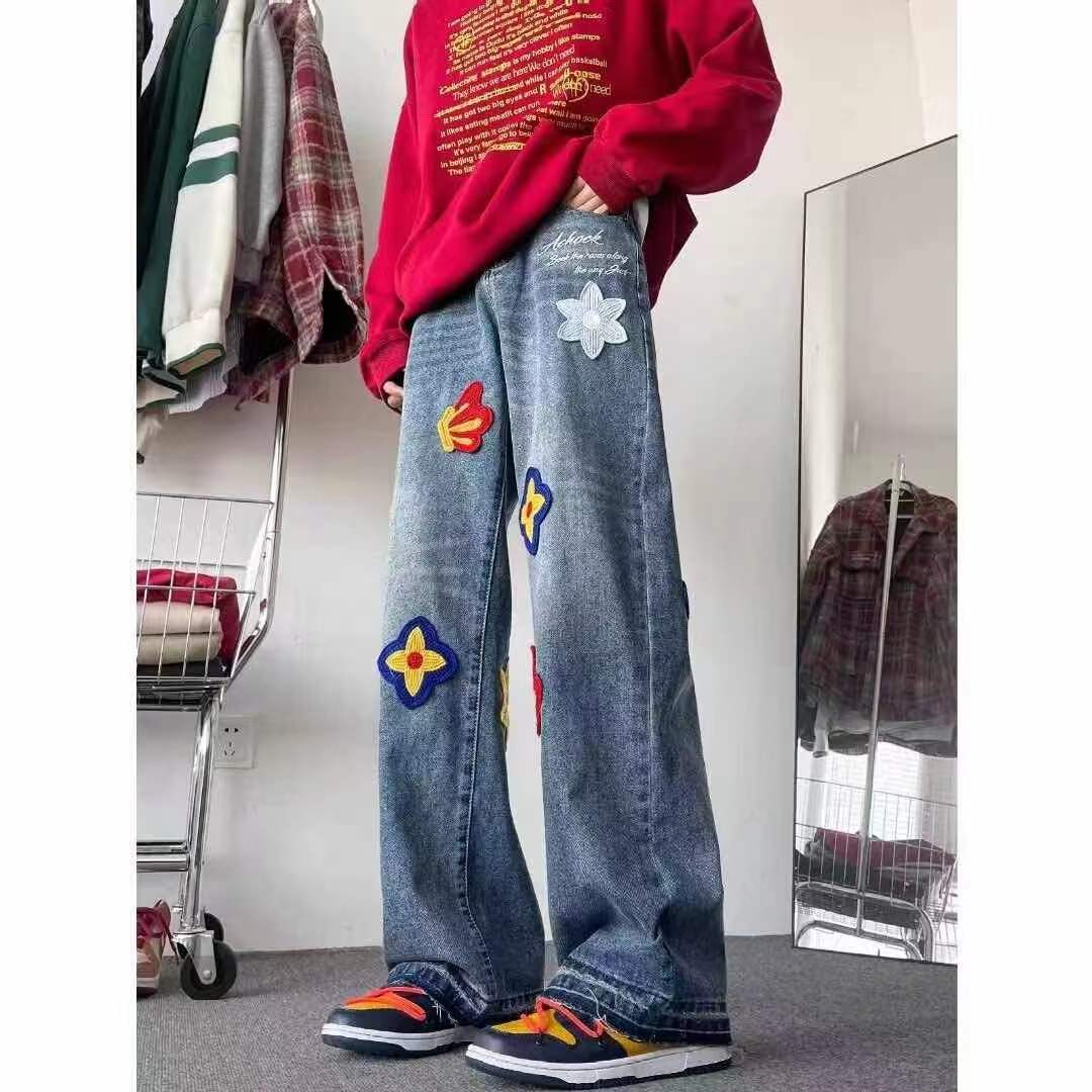 봄과 가을 새로운 세탁 청바지 남성과 여성 Ins 트렌디 브랜드 하이 스트리트 힙합 루즈 스트레이트 캐주얼 바지스토어 가기