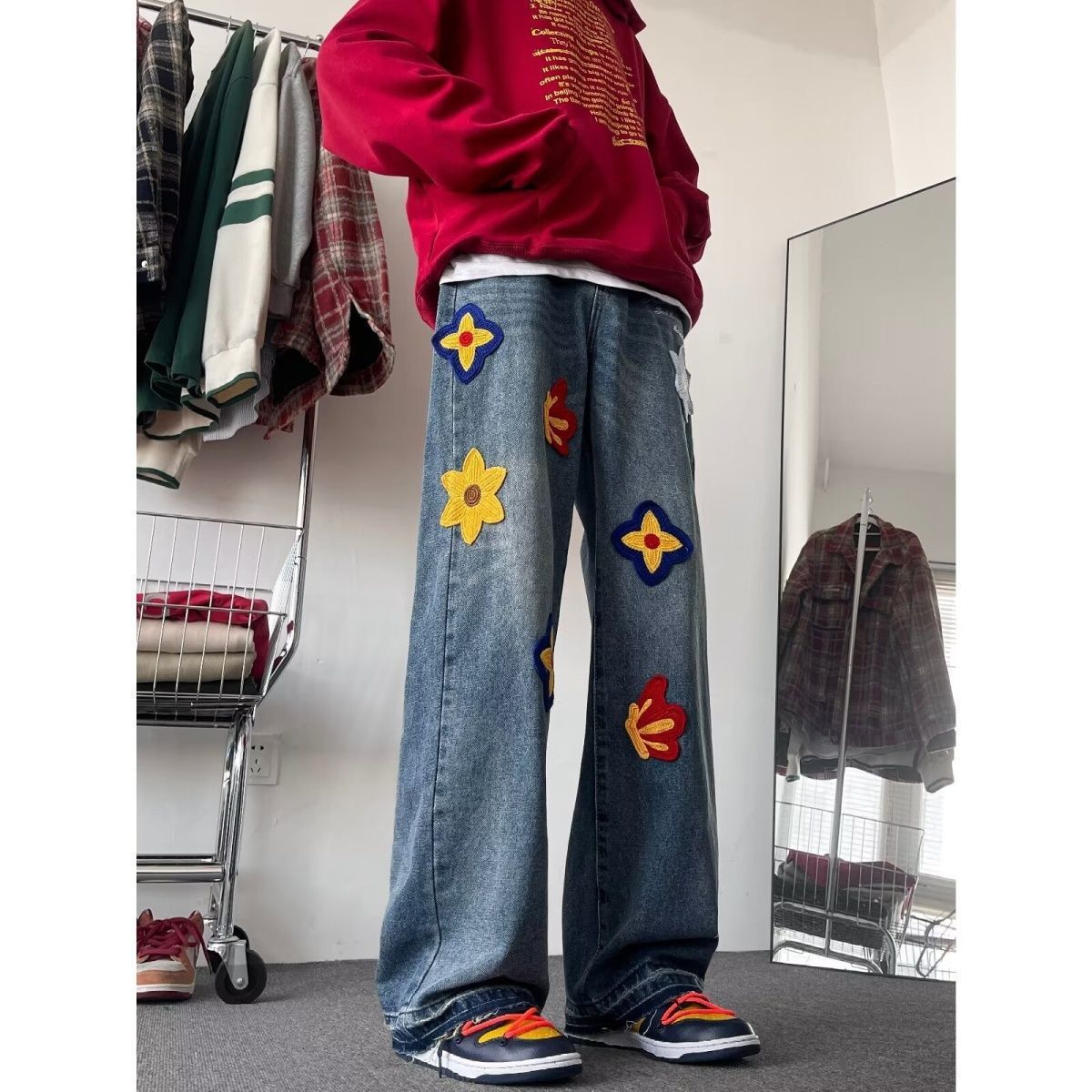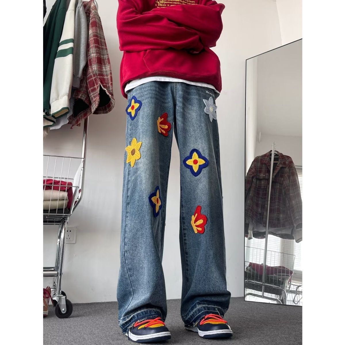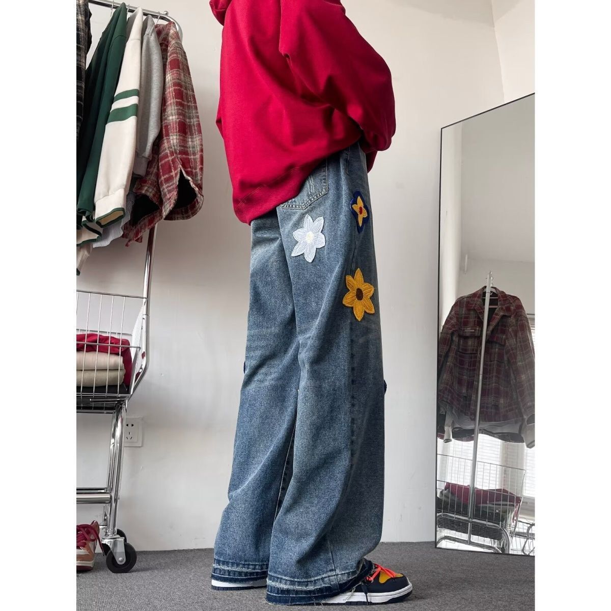봄과 가을 새로운 세탁 청바지 남성과 여성 Ins 트렌디 브랜드 하이 스트리트 힙합 루즈 스트레이트 캐주얼 바지스토어 가기