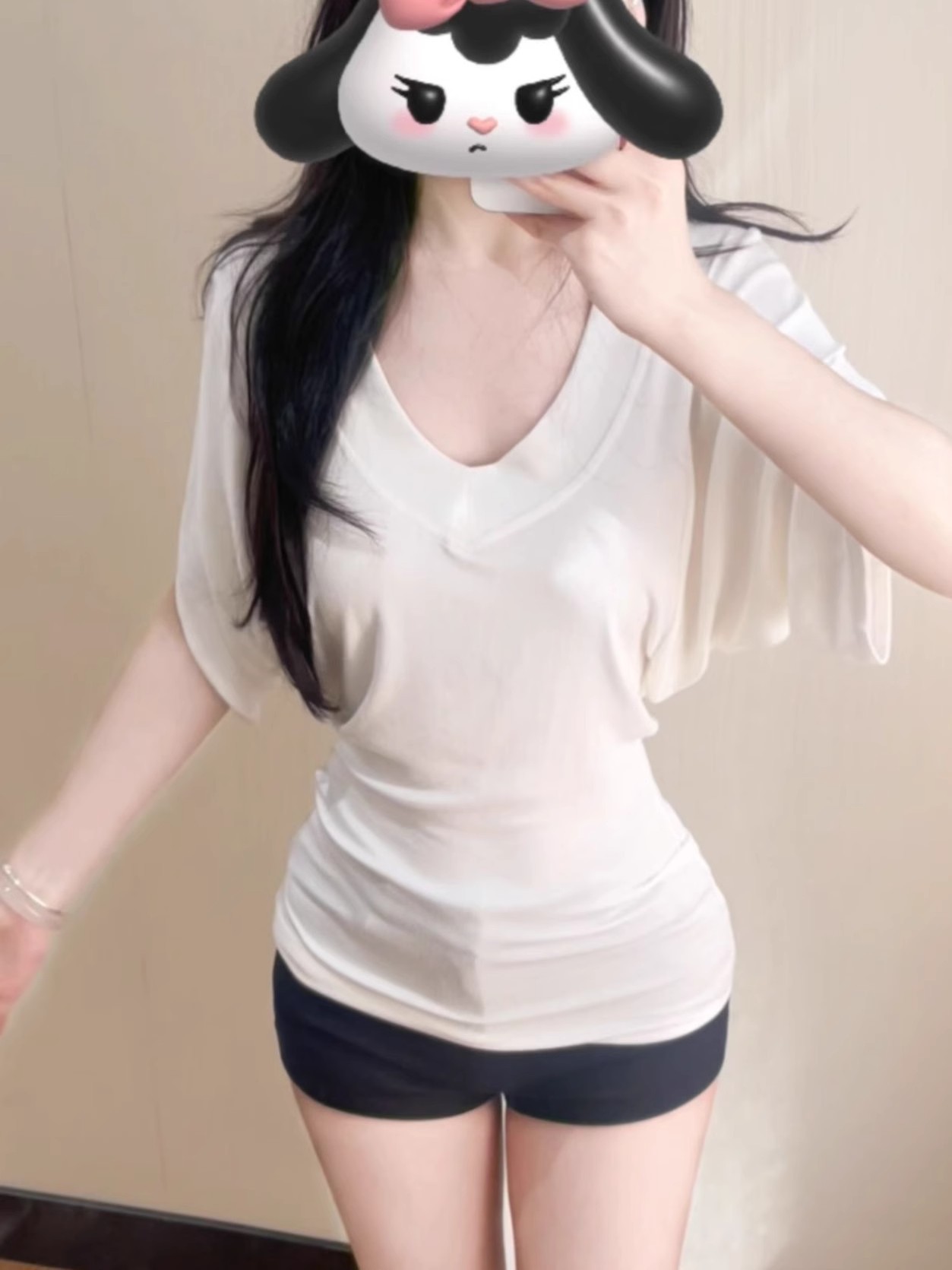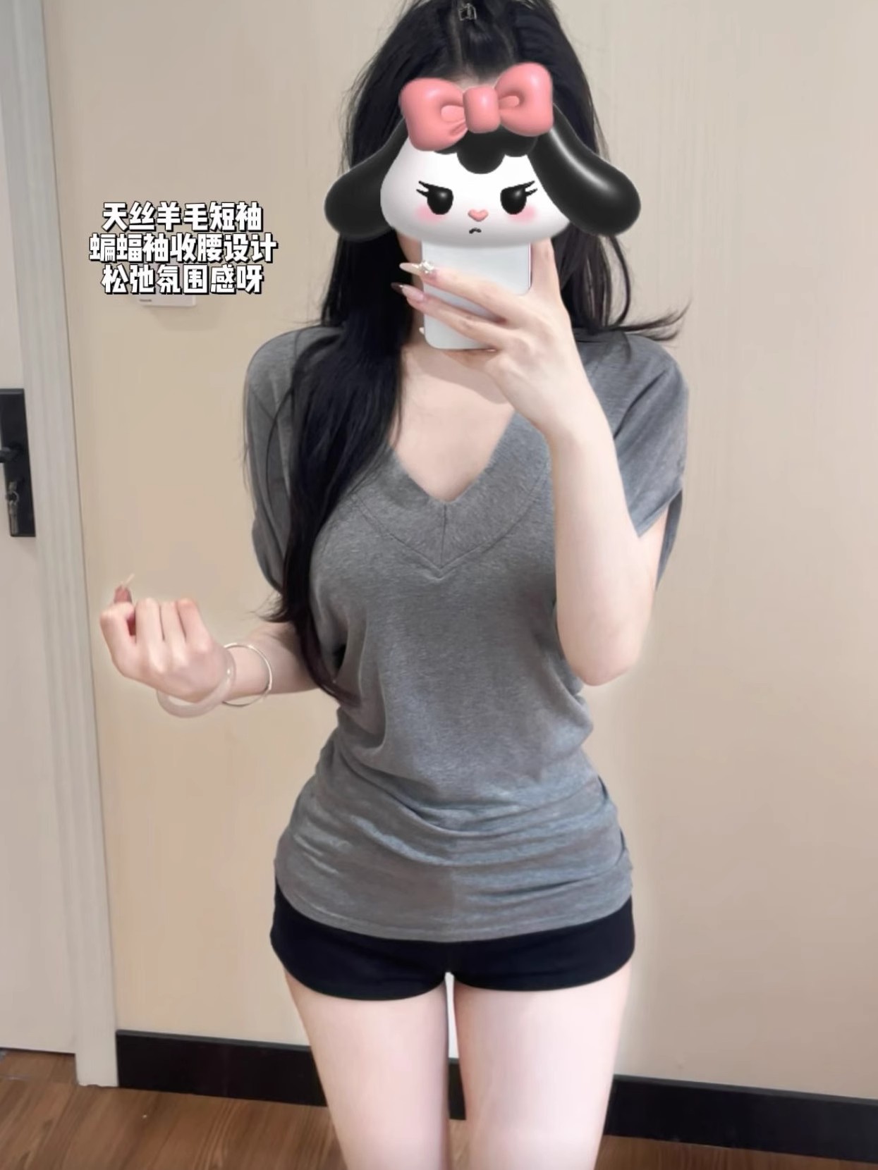 돌만 슬리브 솔리드 컬러 V 넥 니트 반팔 티셔츠 여성용 봄과 여름 루즈 슬리밍 게으른 스타일 캐주얼 올 매치 핫 걸탑스토어 가기