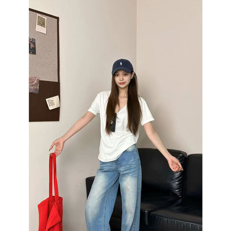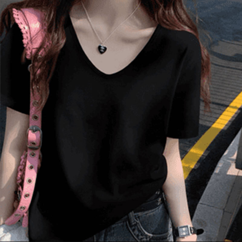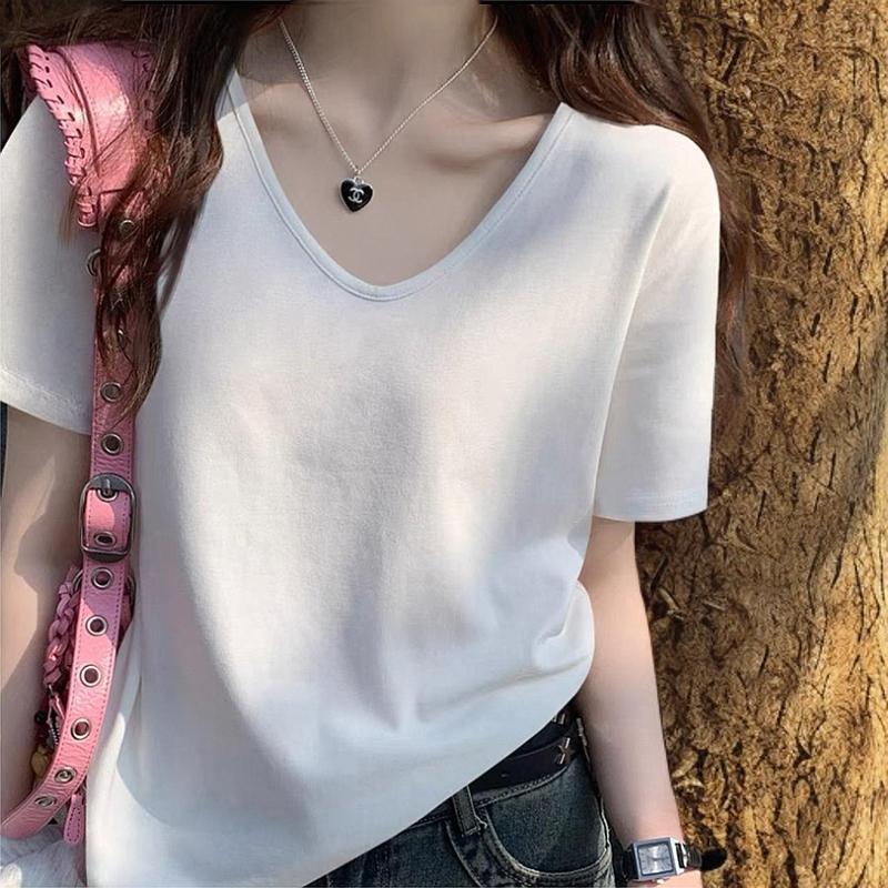 한국식 느슨한 게으른 반팔 화이트 티셔츠 여자 U-칼라 베이스 셔츠 여름 얇은 슬리밍 솔리드 컬러 올 매치 탑 트렌디스토어 가기