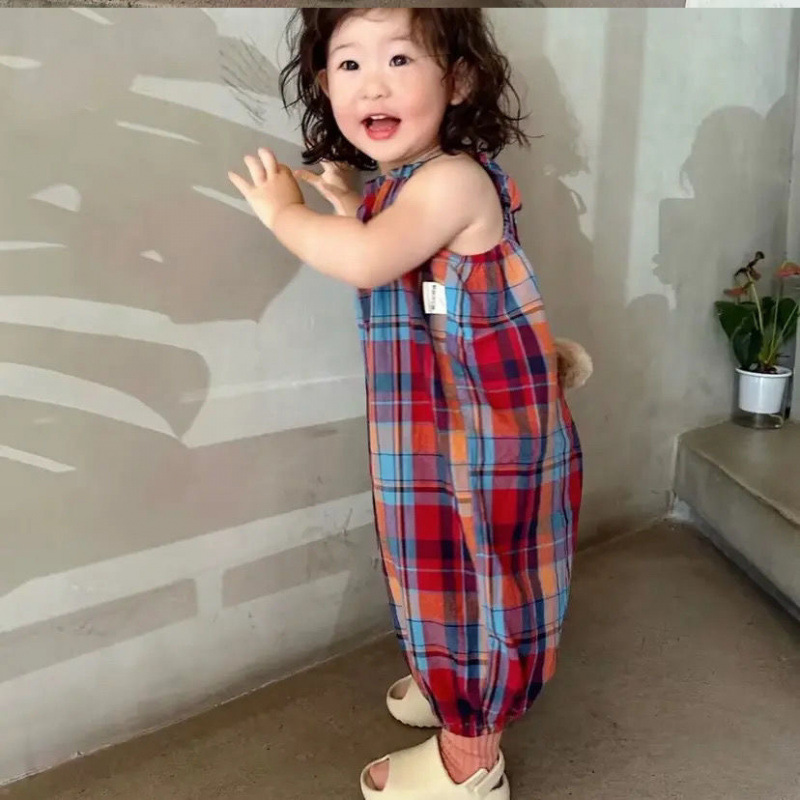 한국 아동복 바지 여름 새로운 도착 세련된 귀여운 토끼 꼬리 격자 끈 슬링 캐주얼 바지