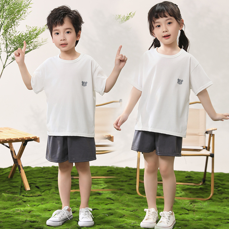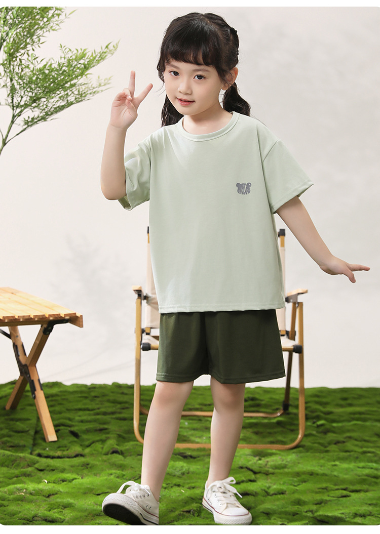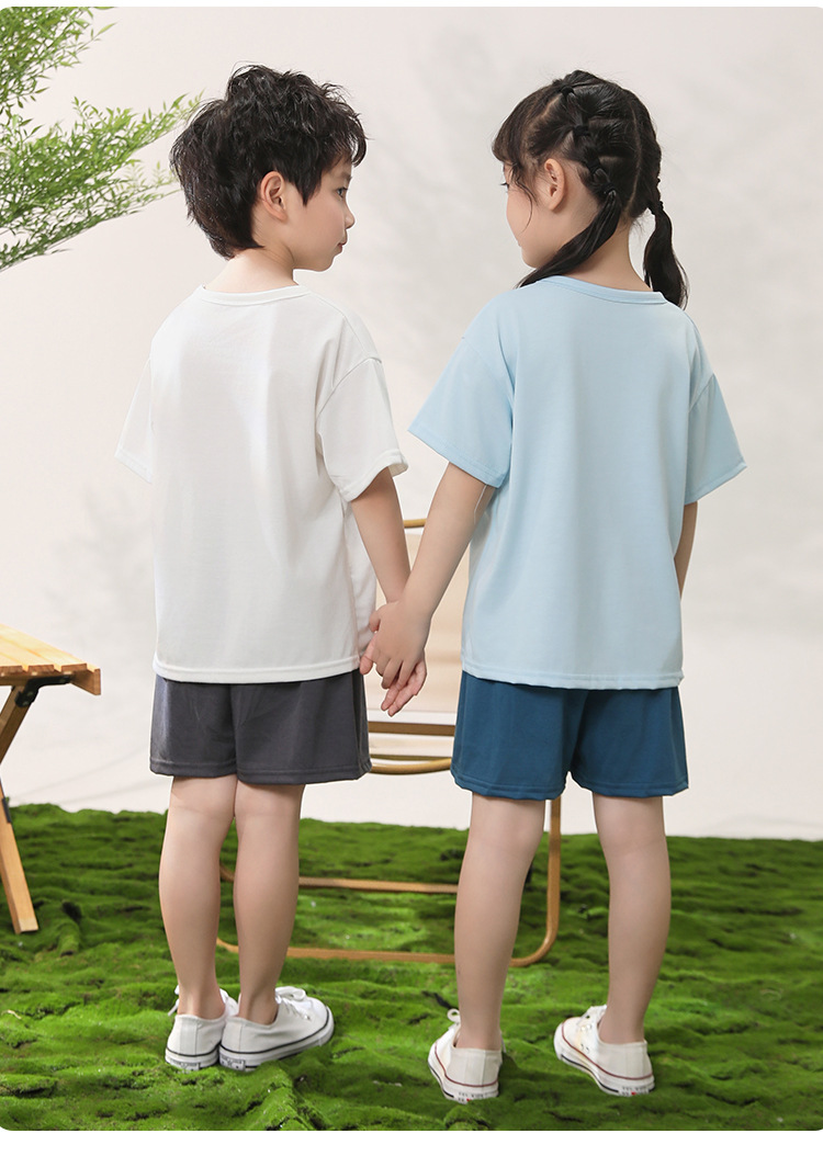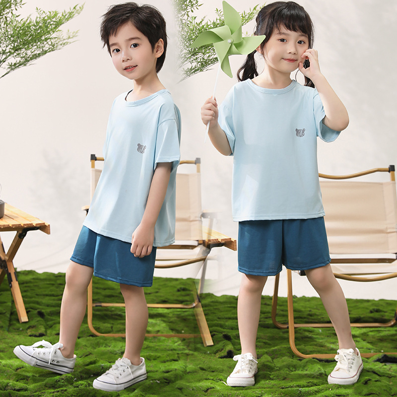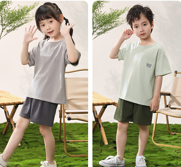 어린이 반팔 반바지 세트 얼음 감면 홈 의류 대형 어린이 여름 단색 티셔츠 얇은 투피스 홈 의류스토어 가기