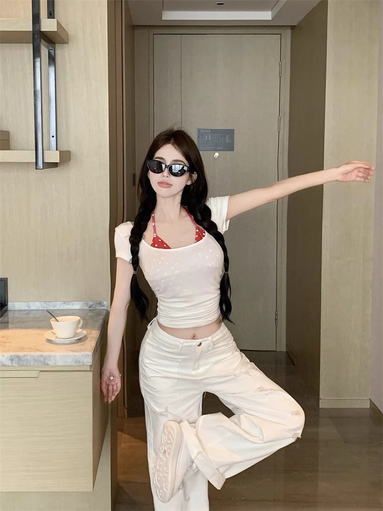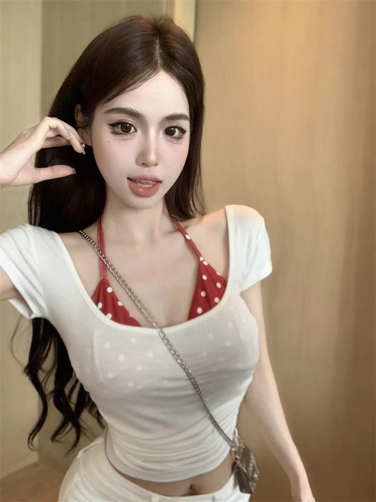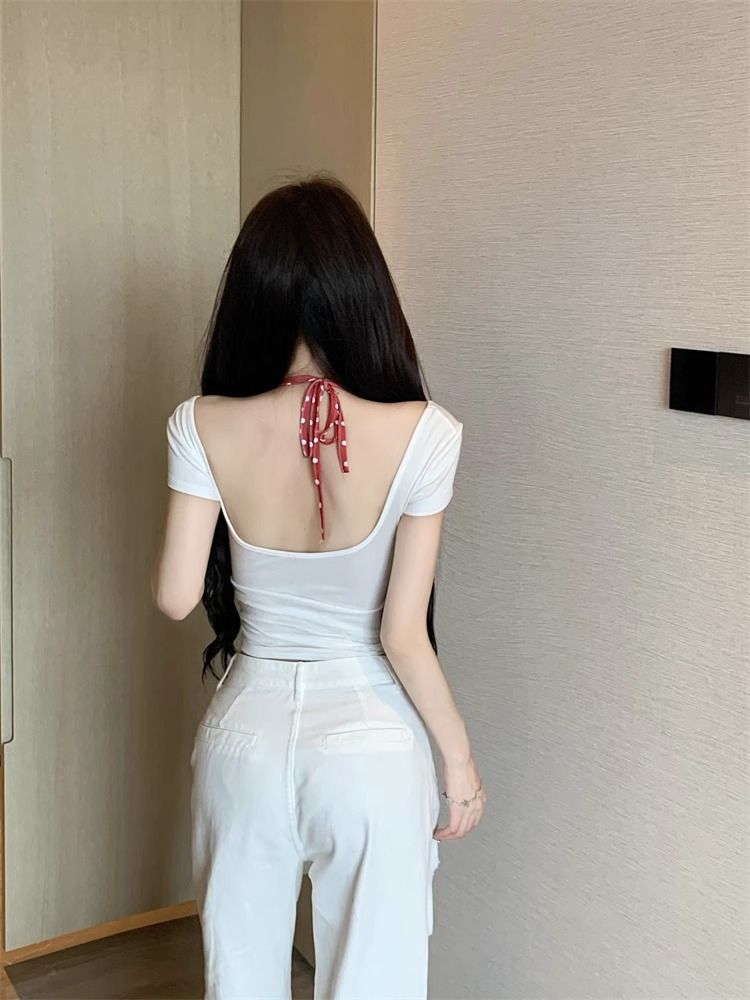 여성을위한 목과 웨이브 도트가있는 가짜 투피스 반팔 티셔츠 Xia 순수한 달콤한 스파이스 소녀 섹시한 짧은 어깨 탑 아름다운