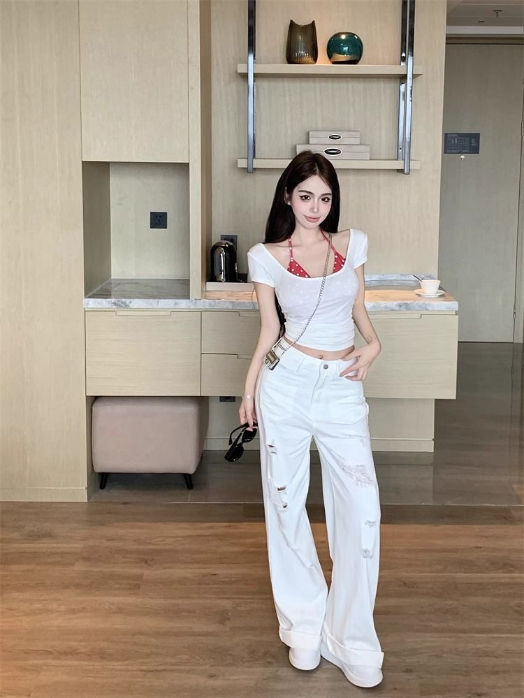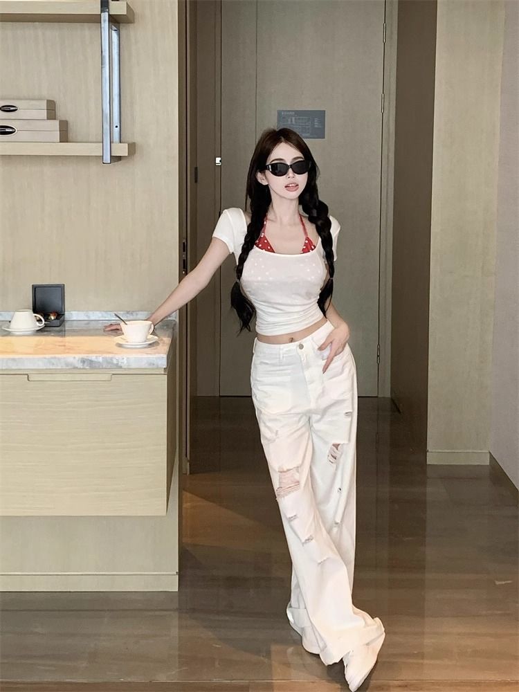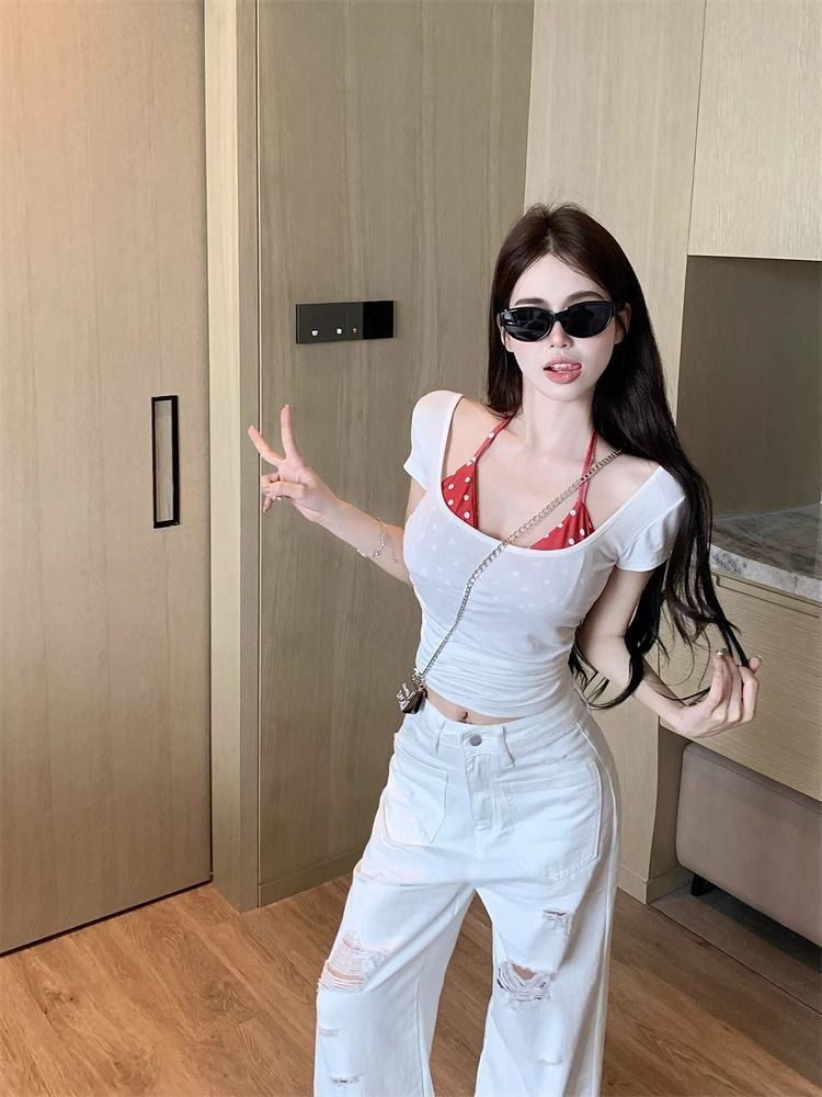 여성을위한 목과 웨이브 도트가있는 가짜 투피스 반팔 티셔츠 Xia 순수한 달콤한 스파이스 소녀 섹시한 짧은 어깨 탑 아름다운스토어 가기
