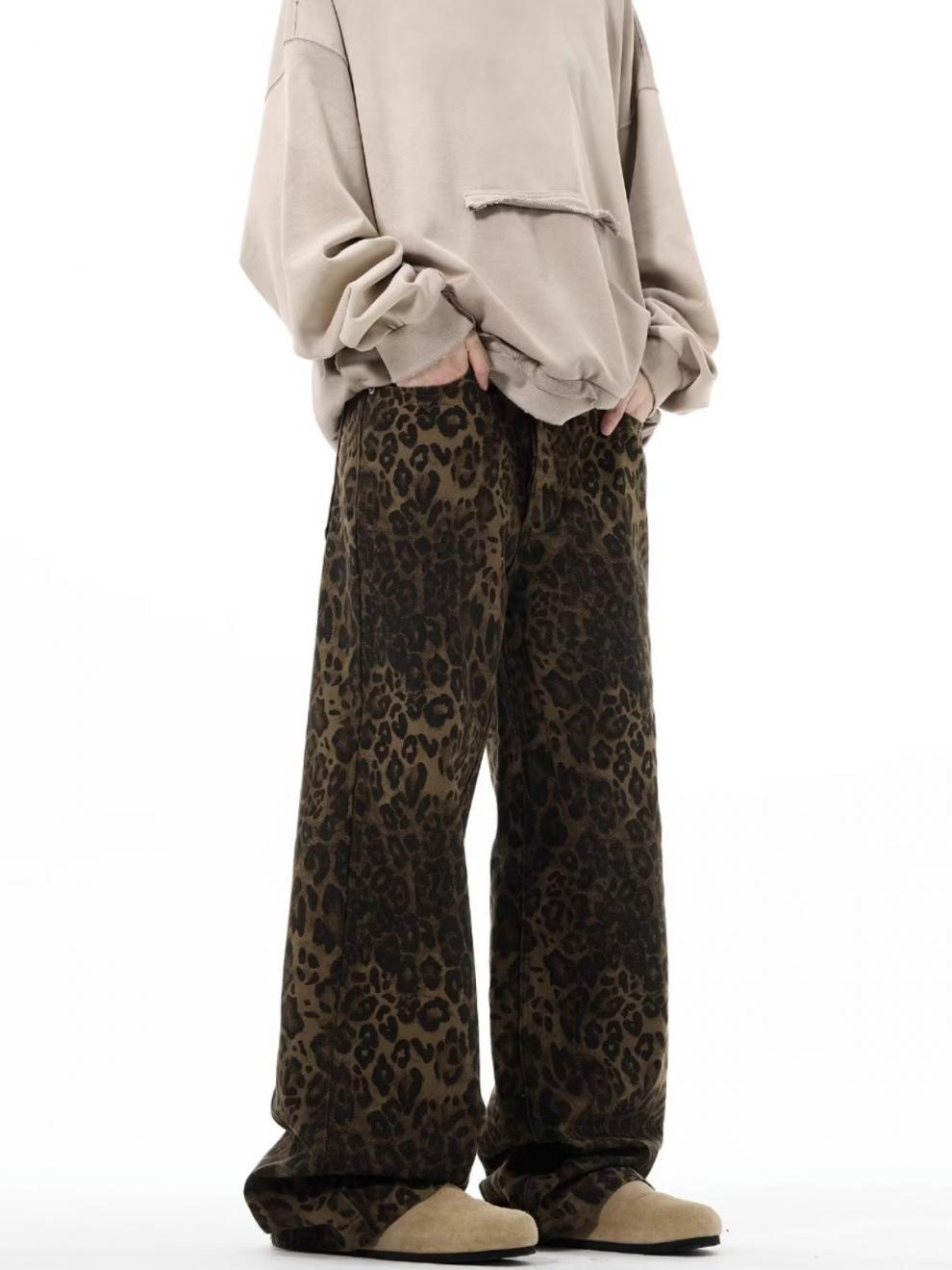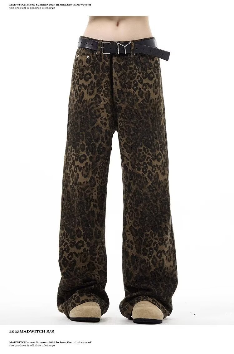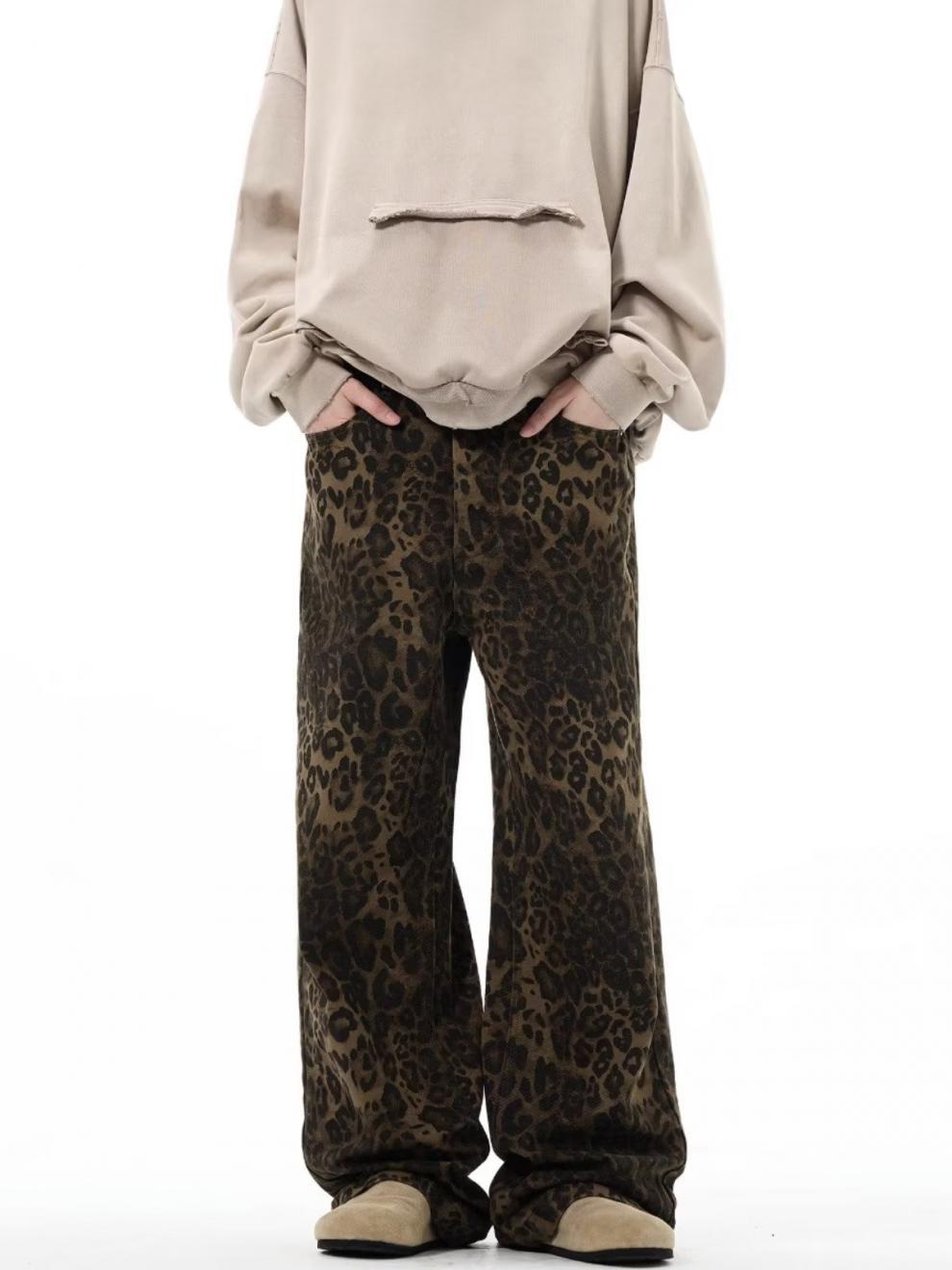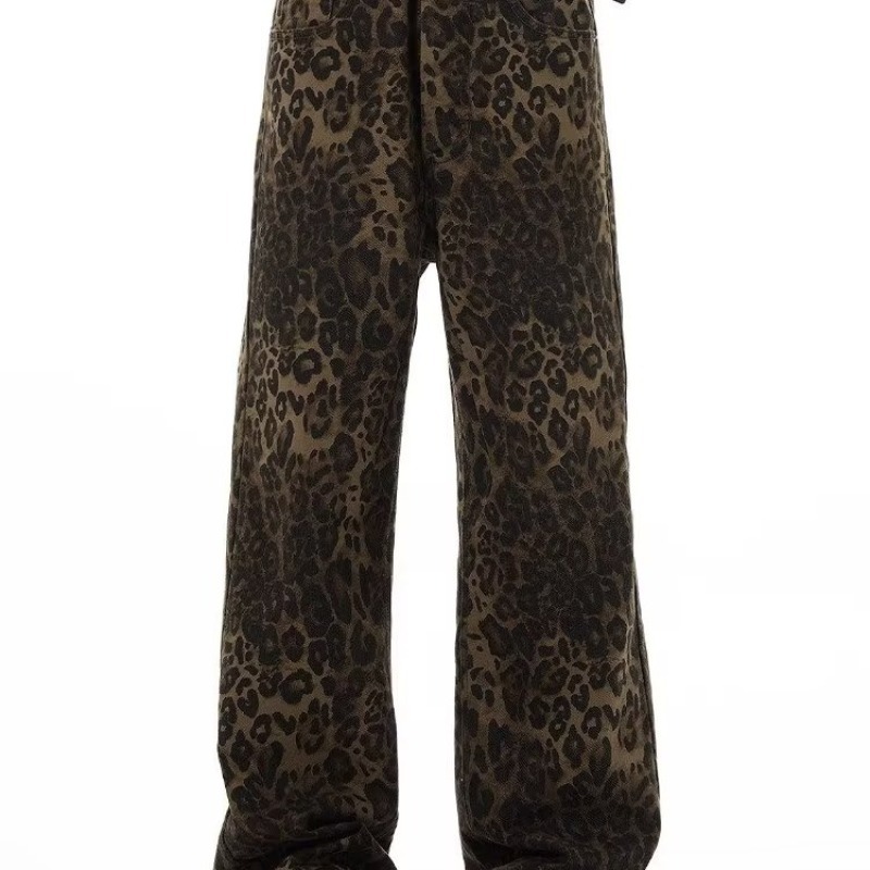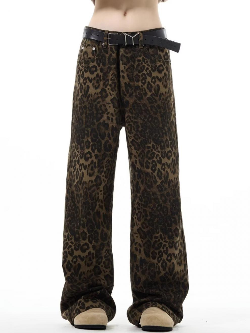 하이 스트리트 레오파드 무늬 바지 여성의 느슨한 넓은 다리 청바지 여성의 가을 새로운 2023 폭발 미국 캐주얼 바지스토어 가기