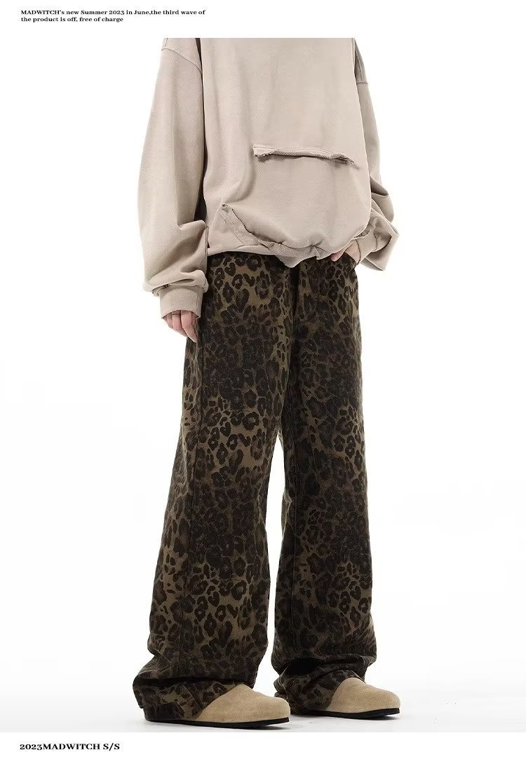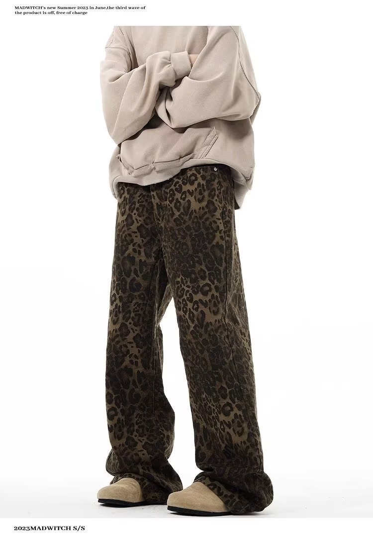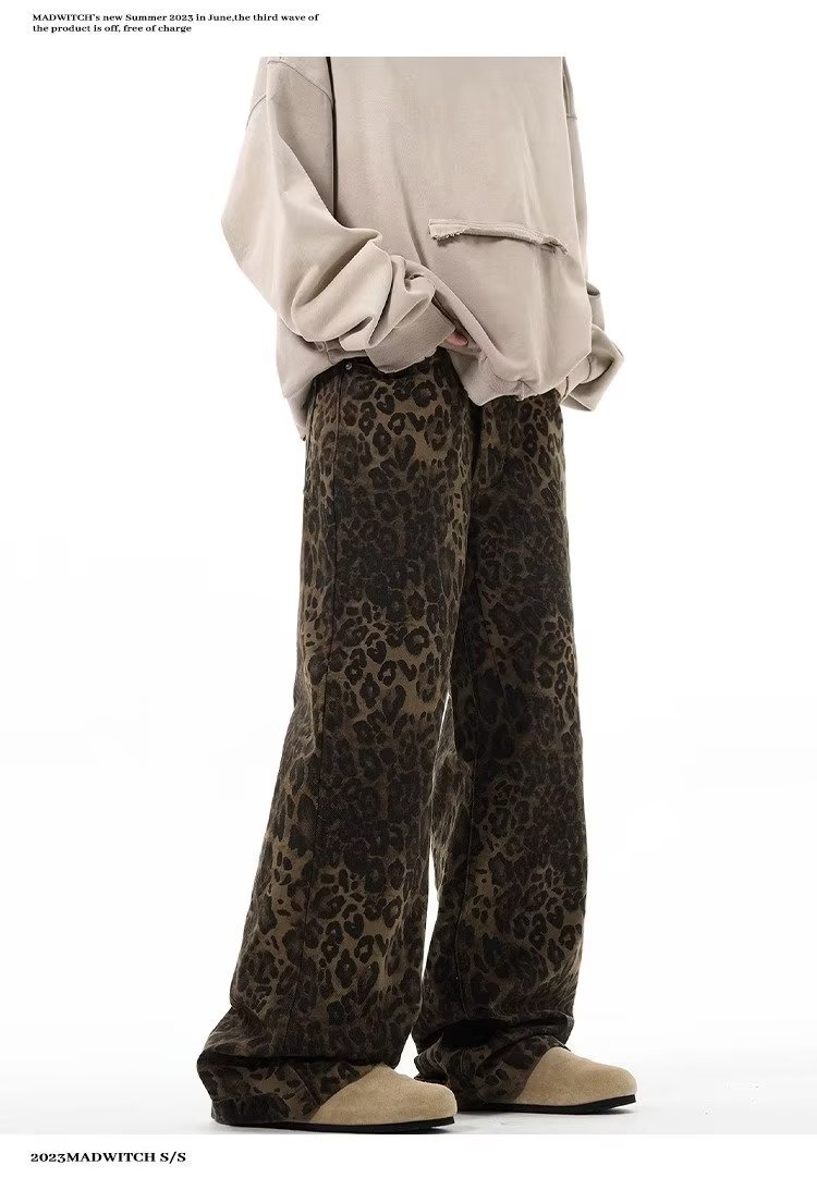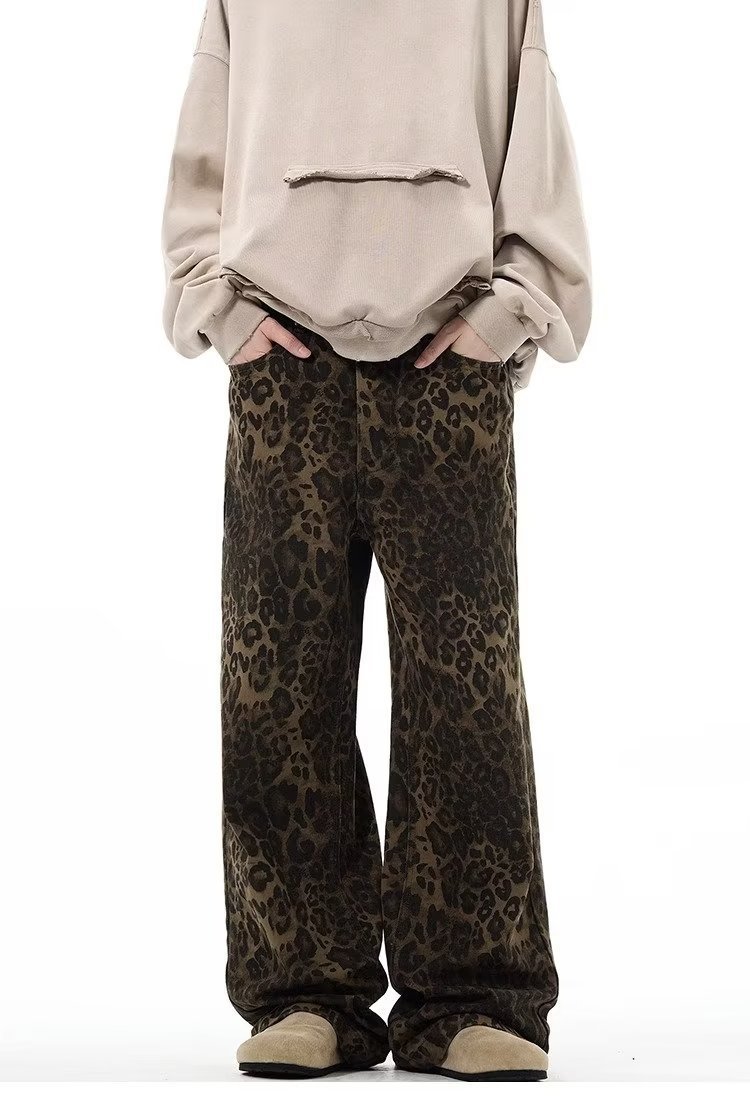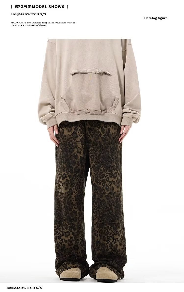 하이 스트리트 레오파드 무늬 바지 여성의 느슨한 넓은 다리 청바지 여성의 가을 새로운 2023 폭발 미국 캐주얼 바지스토어 가기