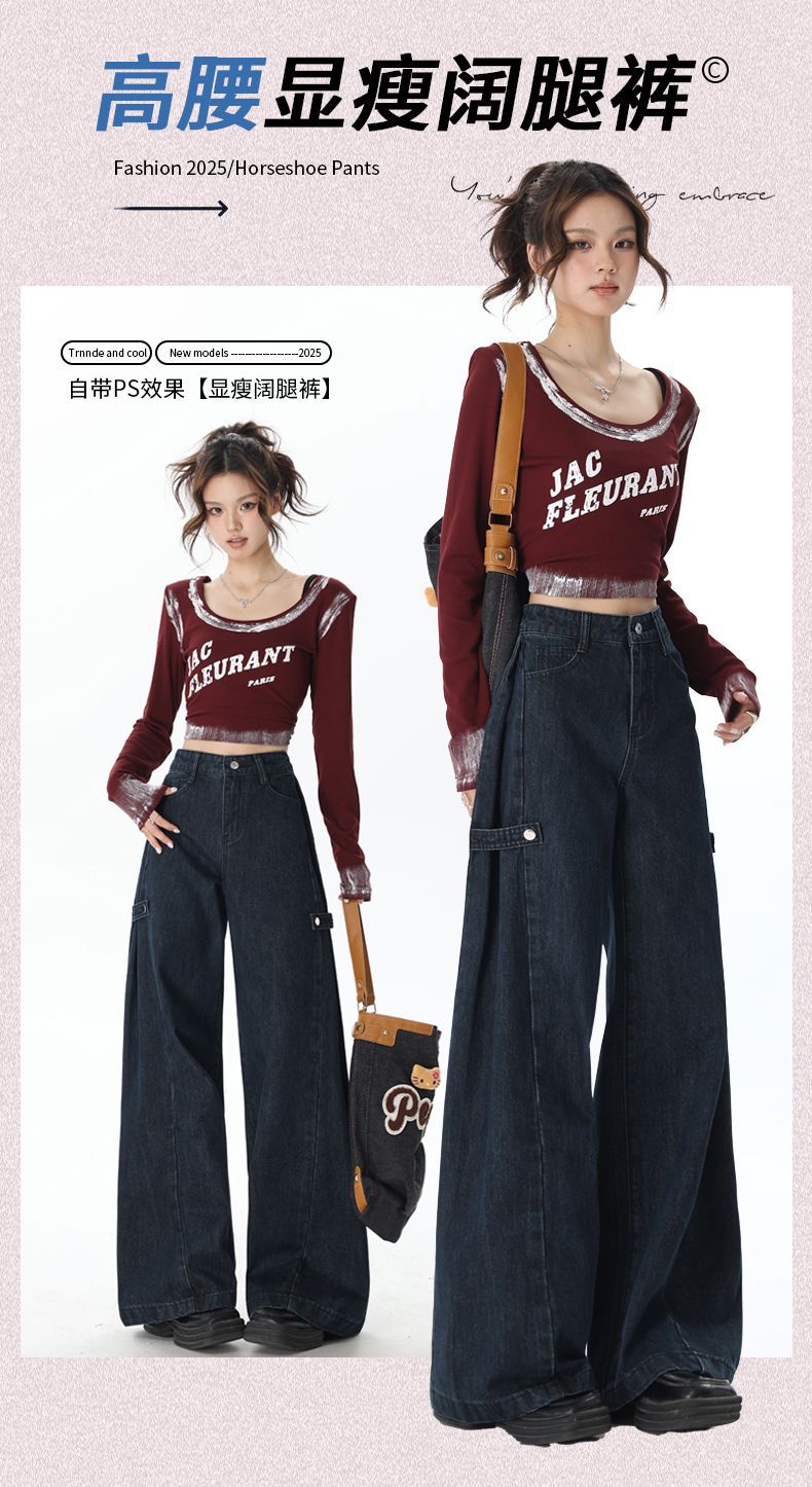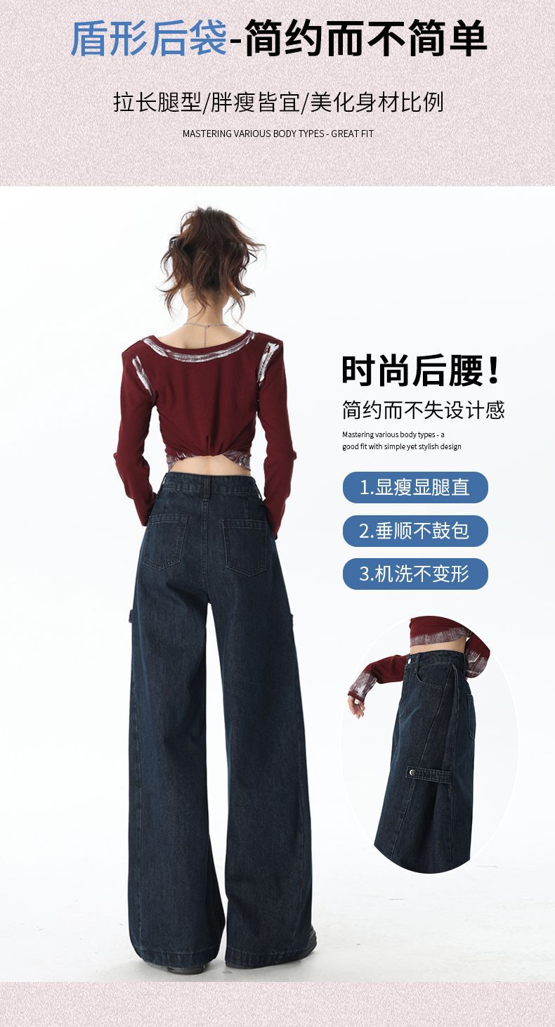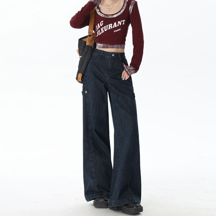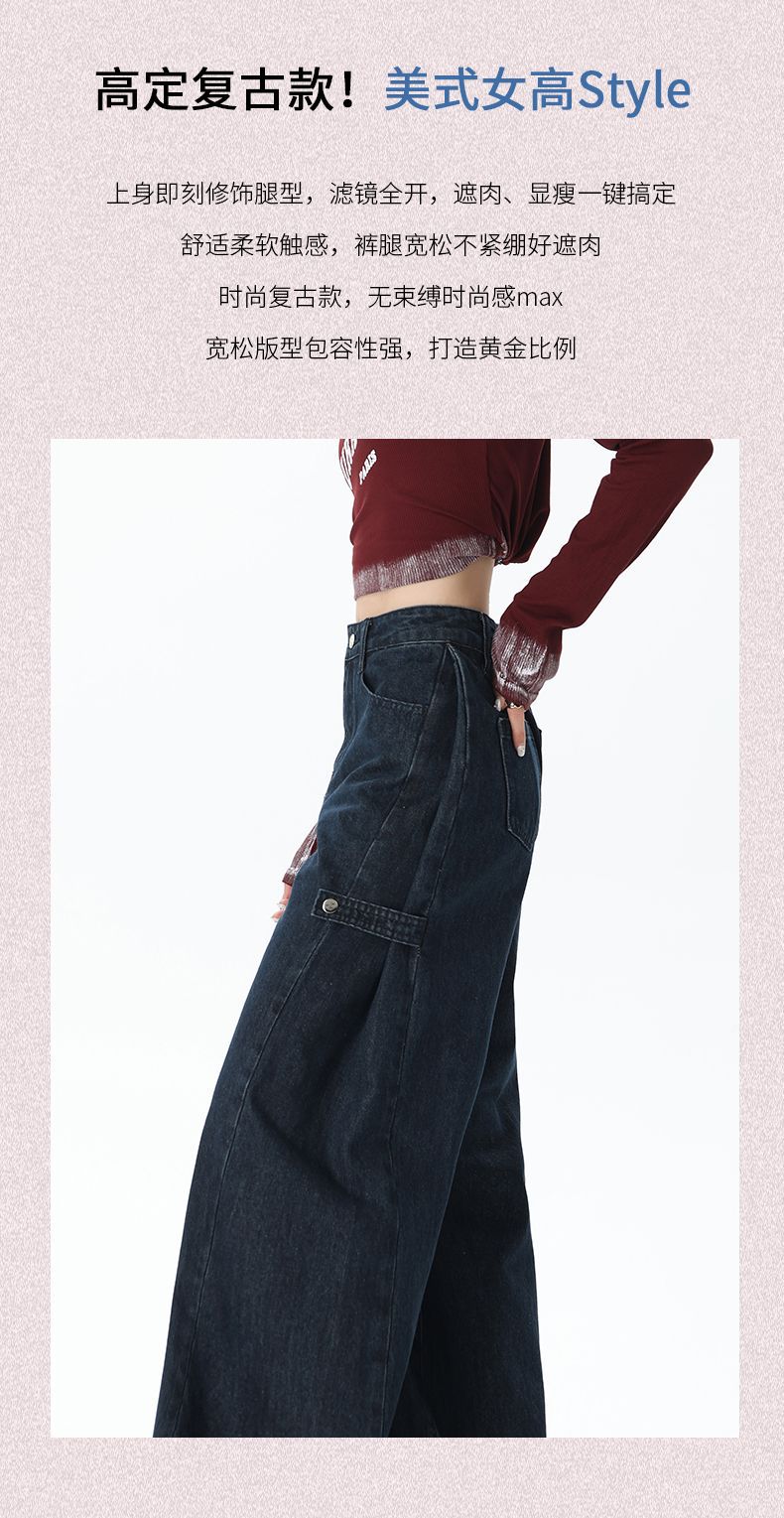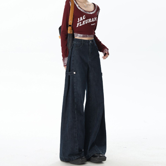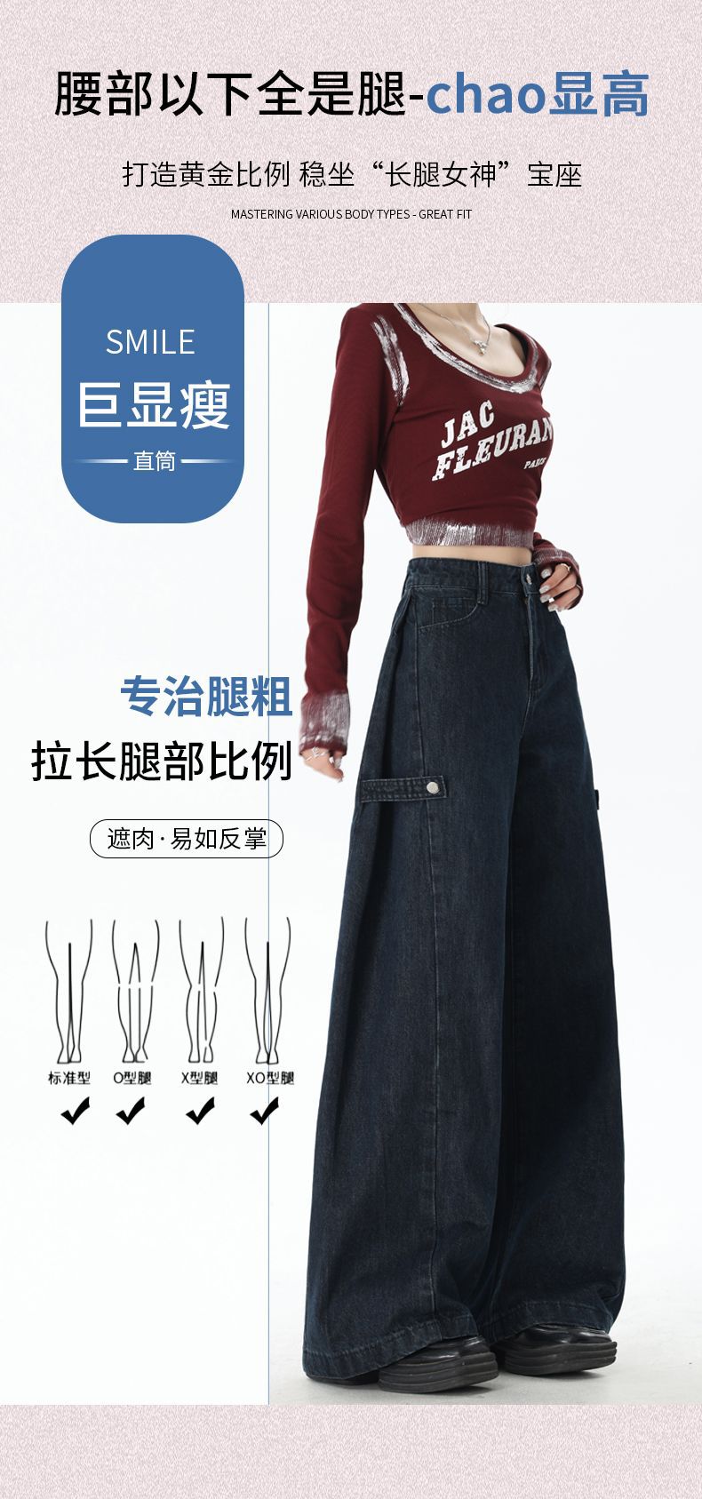 미국 스타일 게으른 휴식 디자인 센스 경적 청바지 여성의 봄과 여름 다크 블루 높은 허리 느슨한 넓은 다리 긴 바지스토어 가기