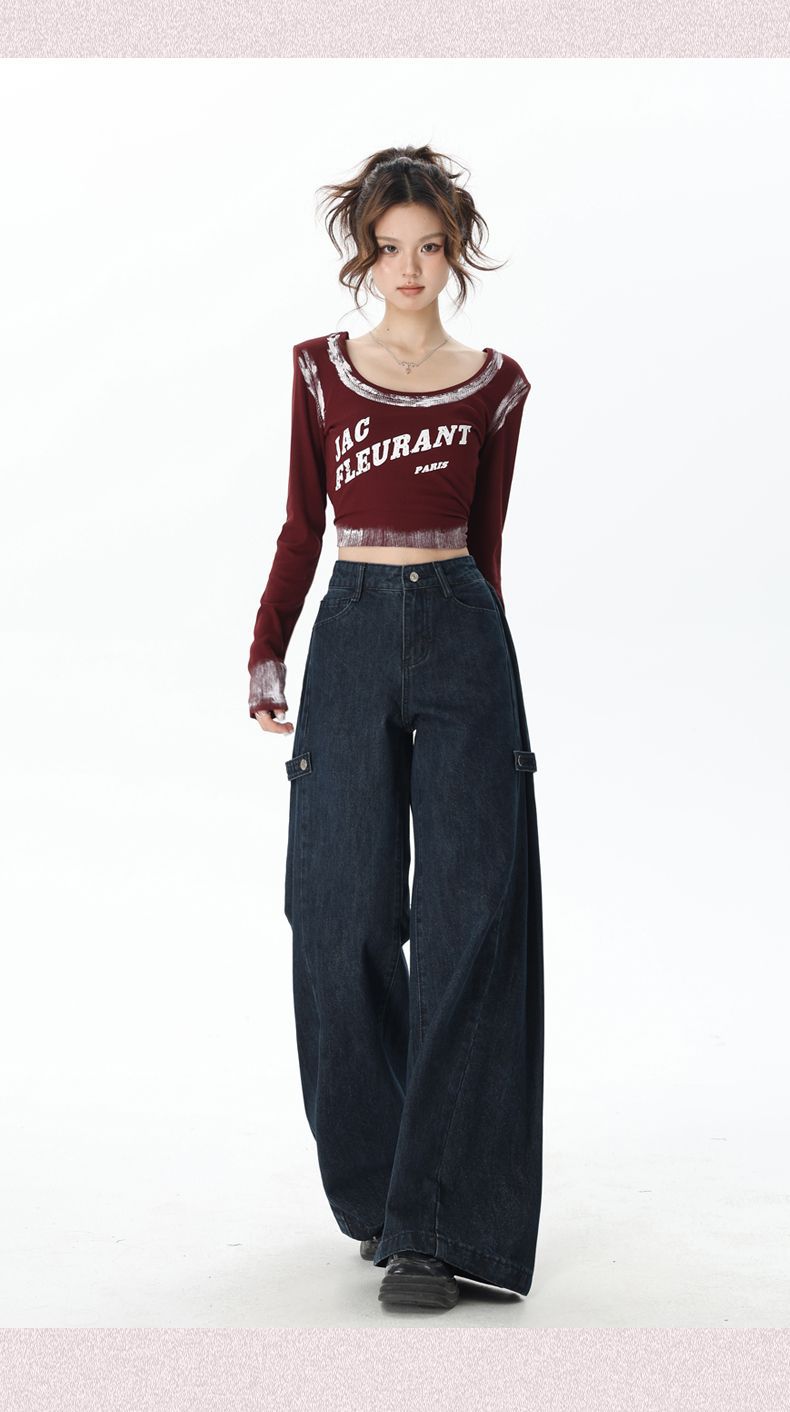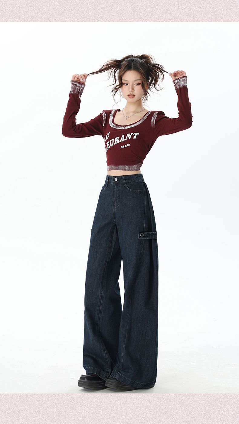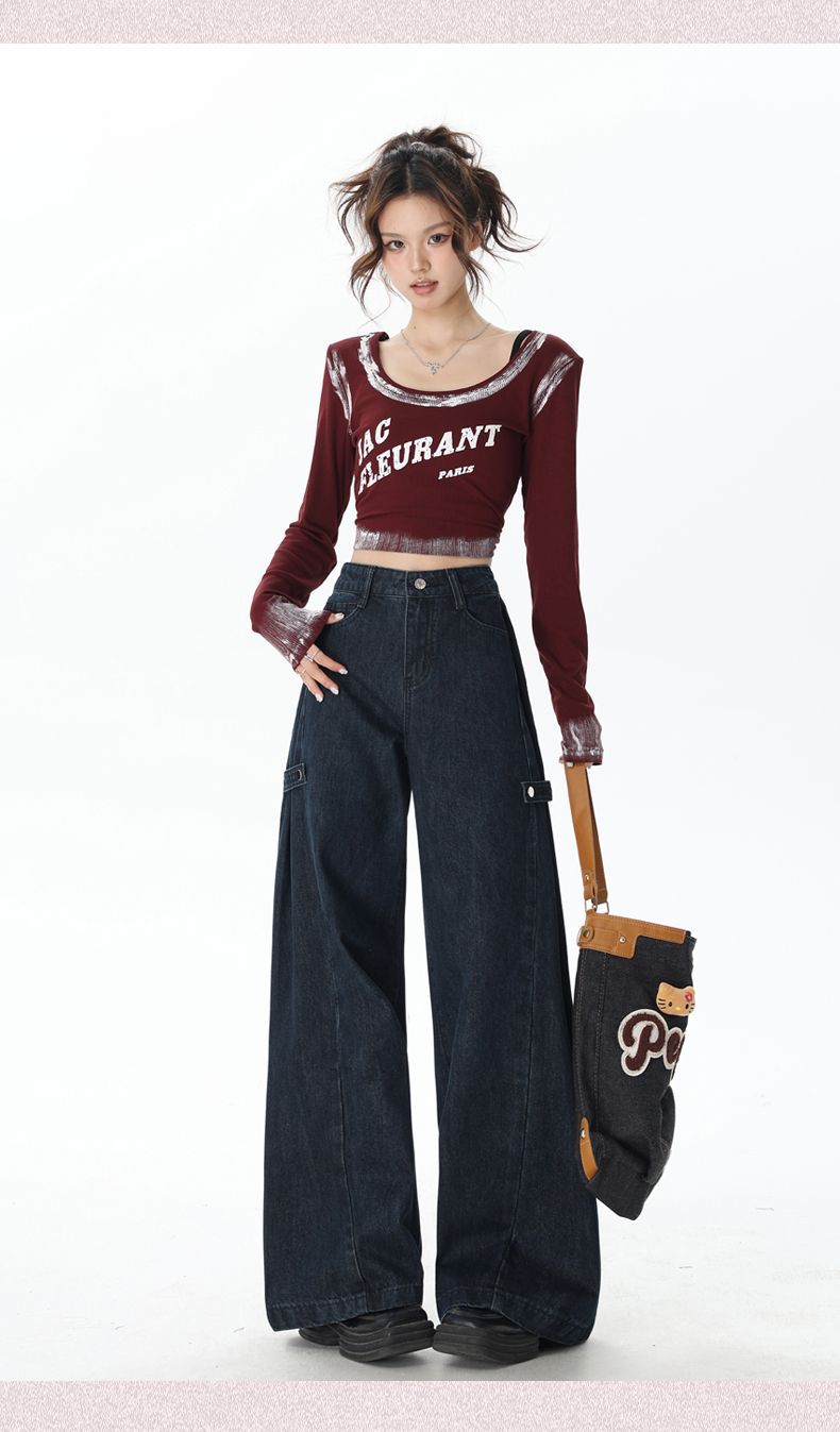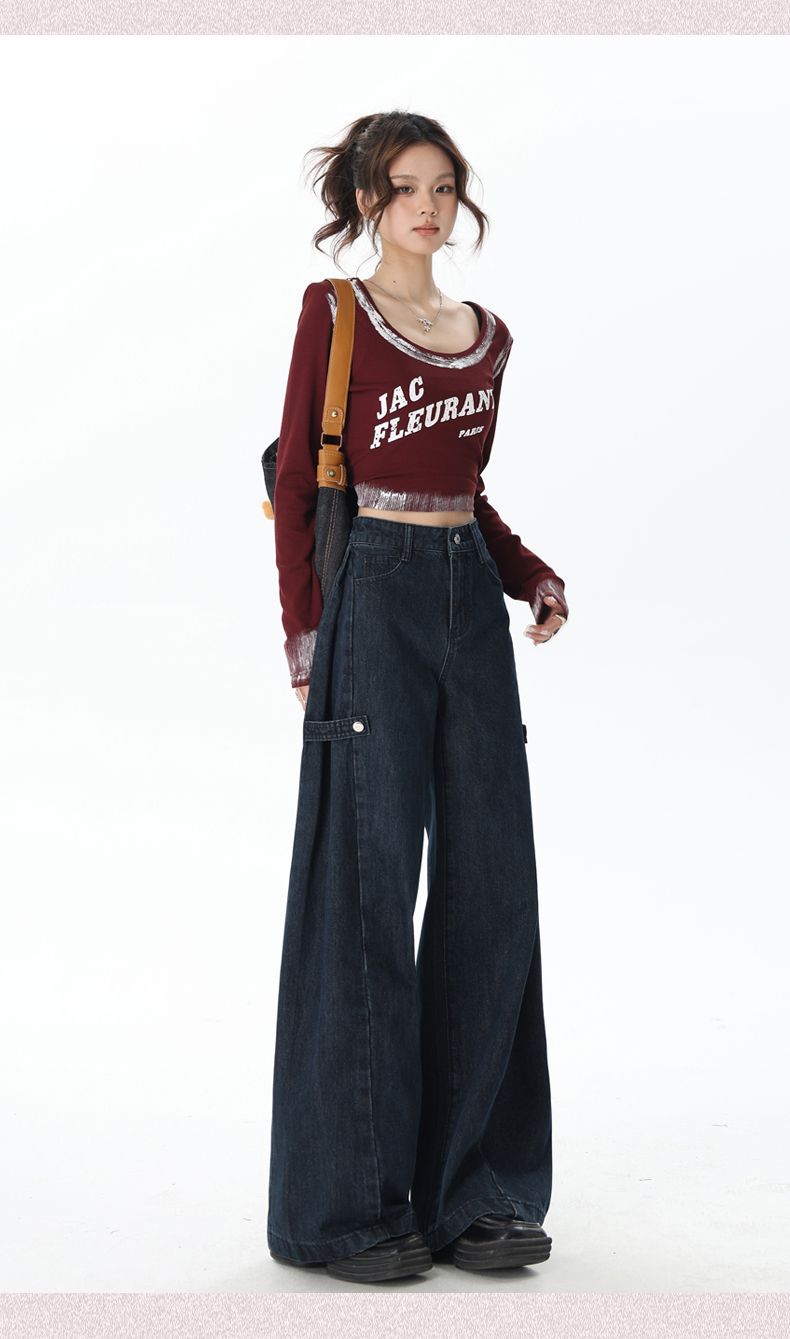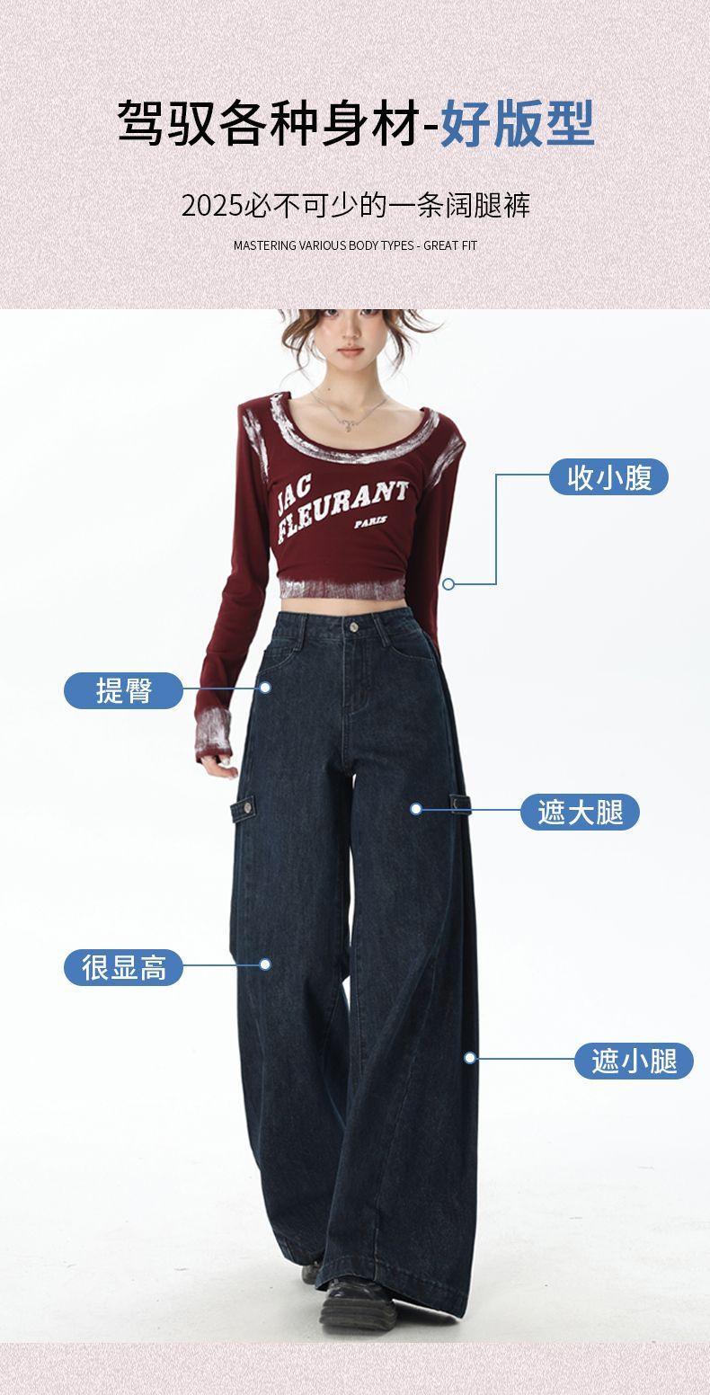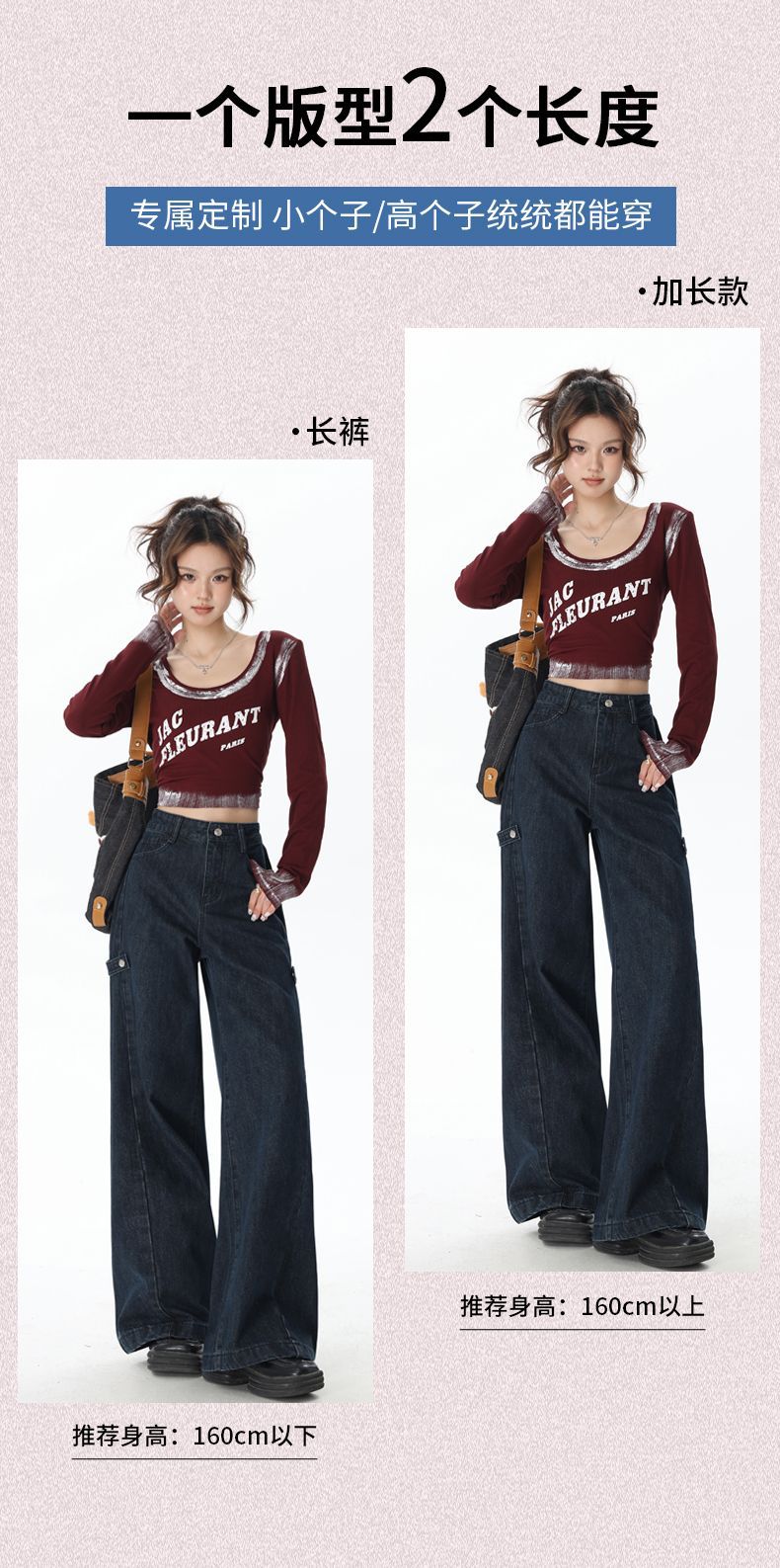 미국 스타일 게으른 휴식 디자인 센스 경적 청바지 여성의 봄과 여름 다크 블루 높은 허리 느슨한 넓은 다리 긴 바지스토어 가기