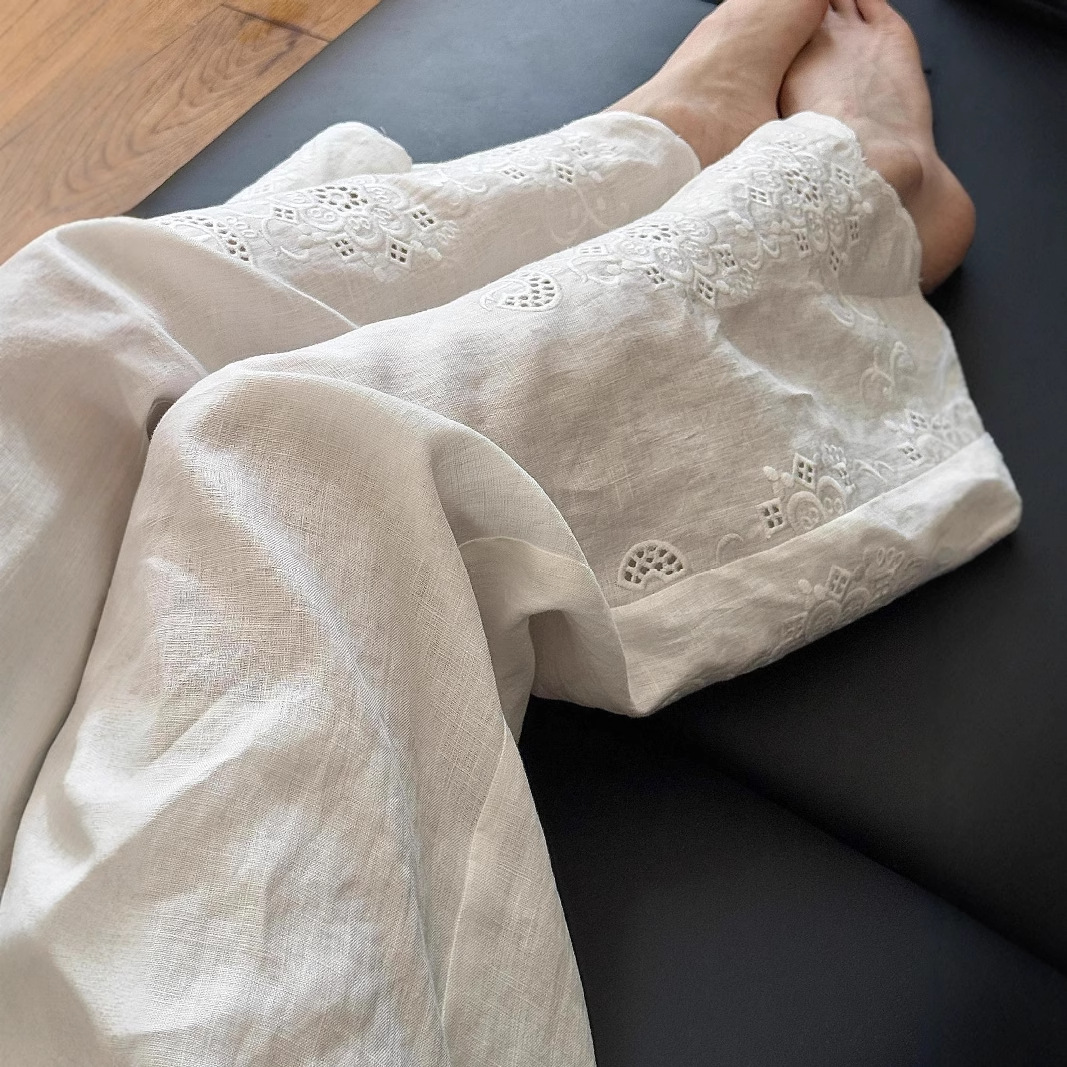 봄과 가을 새로운 우아한 스키니 젠틀 편안한 올 매치 패션 디자인 틈새 게으른 분위기 리넨 자수 바지