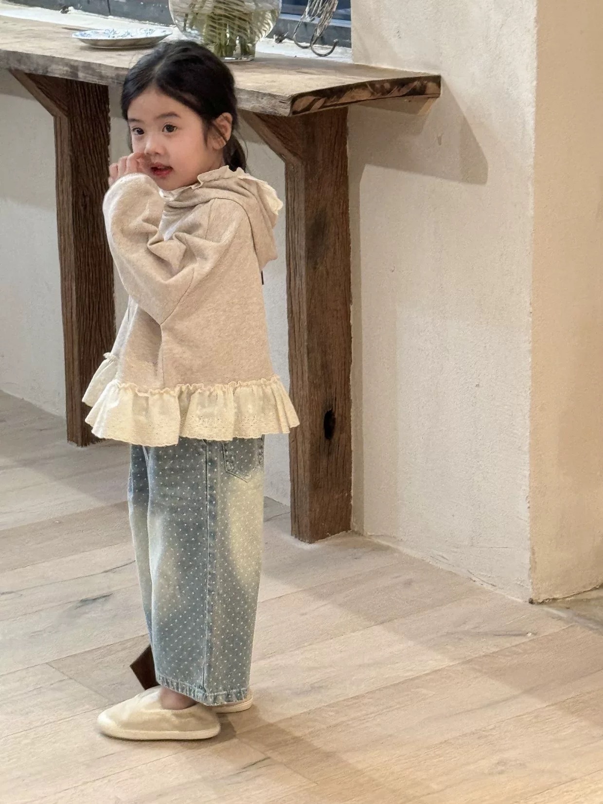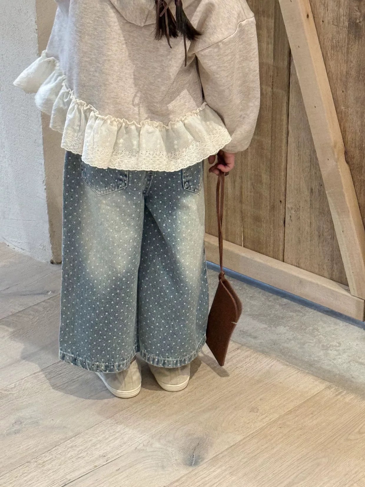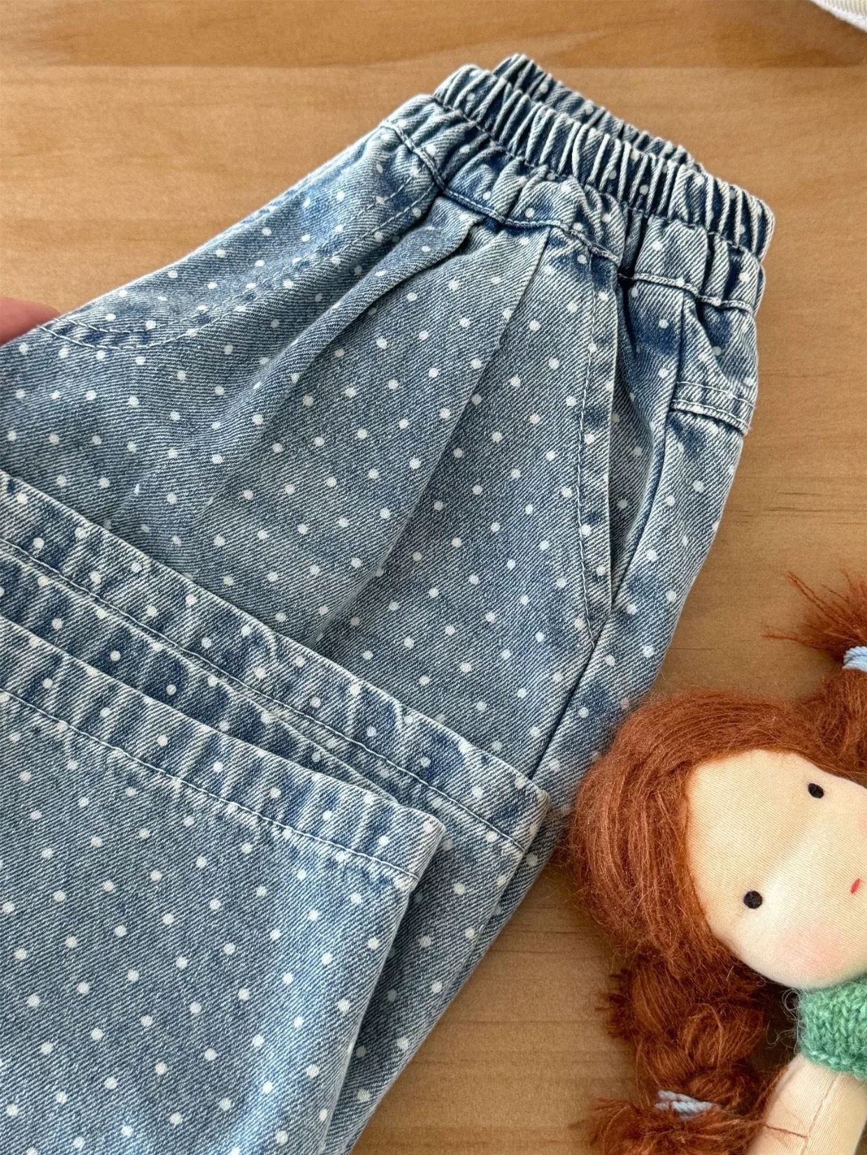 어린이 바지 2025 봄 새로운 한국 어린이 착용 한국 귀여운 폴로 도트 라이트 블루 스트레이트 여자 청바지 캐주얼 와이드 다리