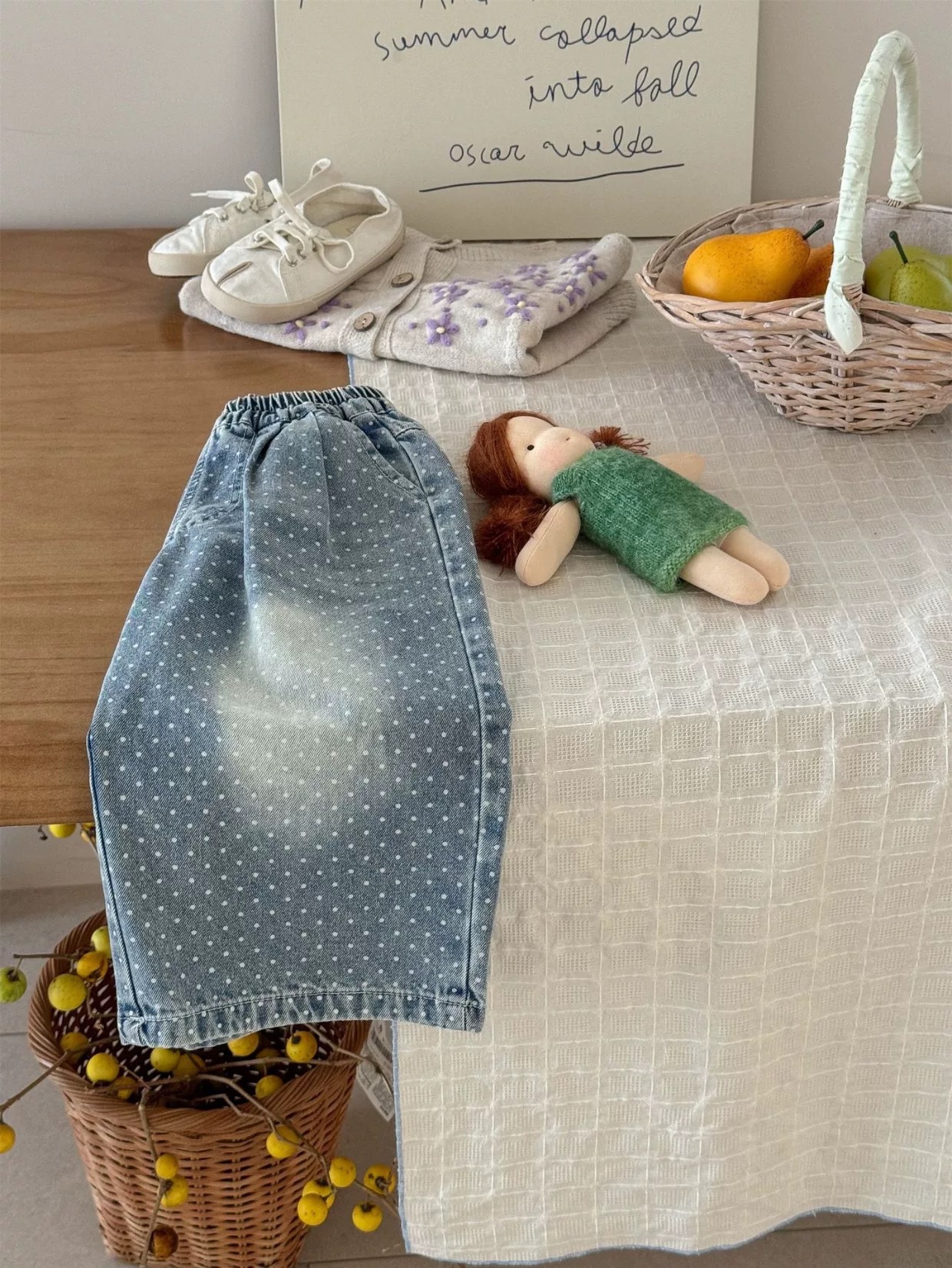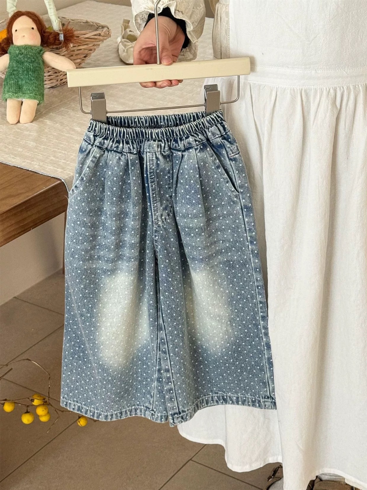 어린이 바지 2025 봄 새로운 한국 어린이 착용 한국 귀여운 폴로 도트 라이트 블루 스트레이트 여자 청바지 캐주얼 와이드 다리스토어 가기