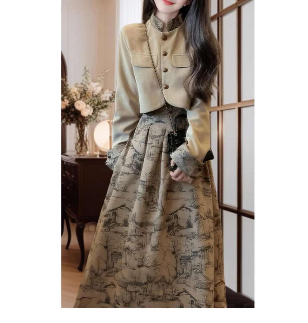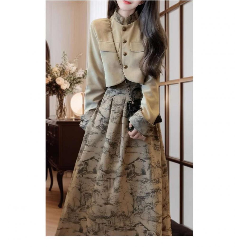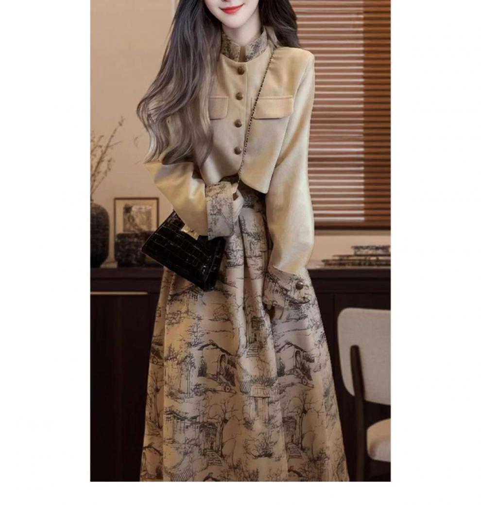 새로운 중국 스타일 우아한 양면 웨이드 쇼트 코트 여성의 2025 가을 및 겨울 새로운 Guofeng 오버 스커트 고급 사교계 투피스 세트